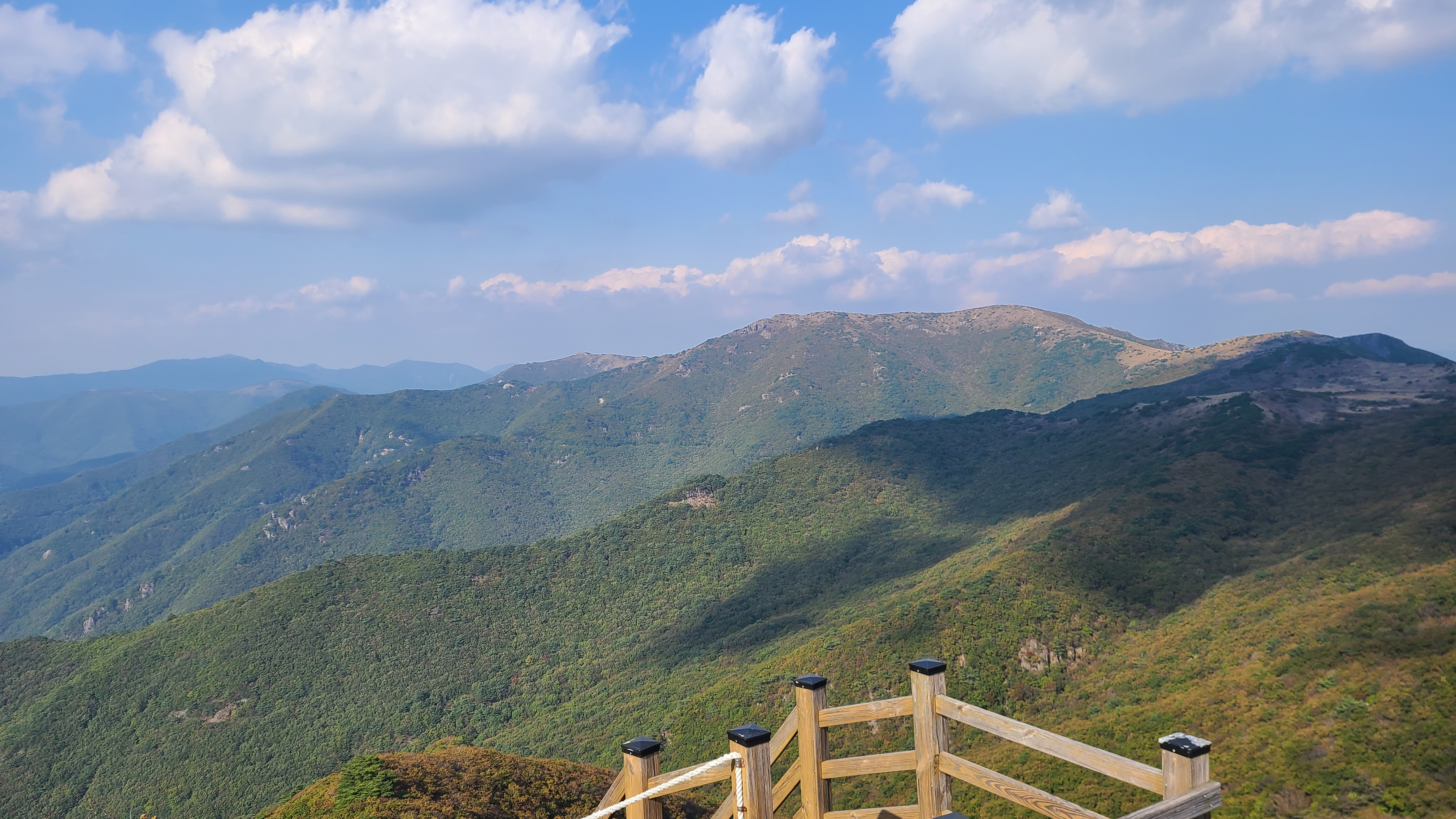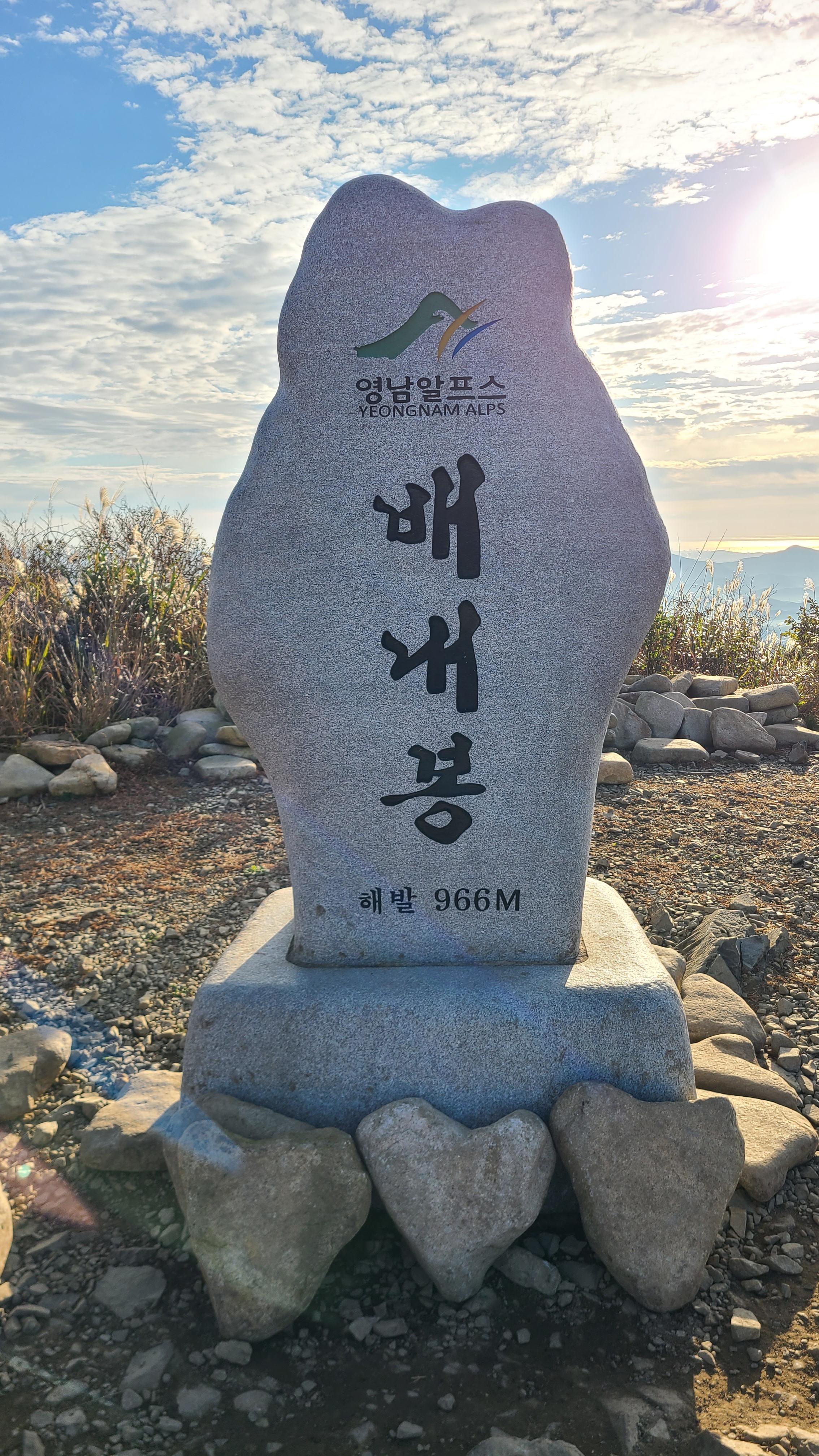 아침기온은 조금 서늘하지만 쾌청한 날씨에 산행하기에 적절한 날씨이다. 계단길을 올라 배내봉에 선다.