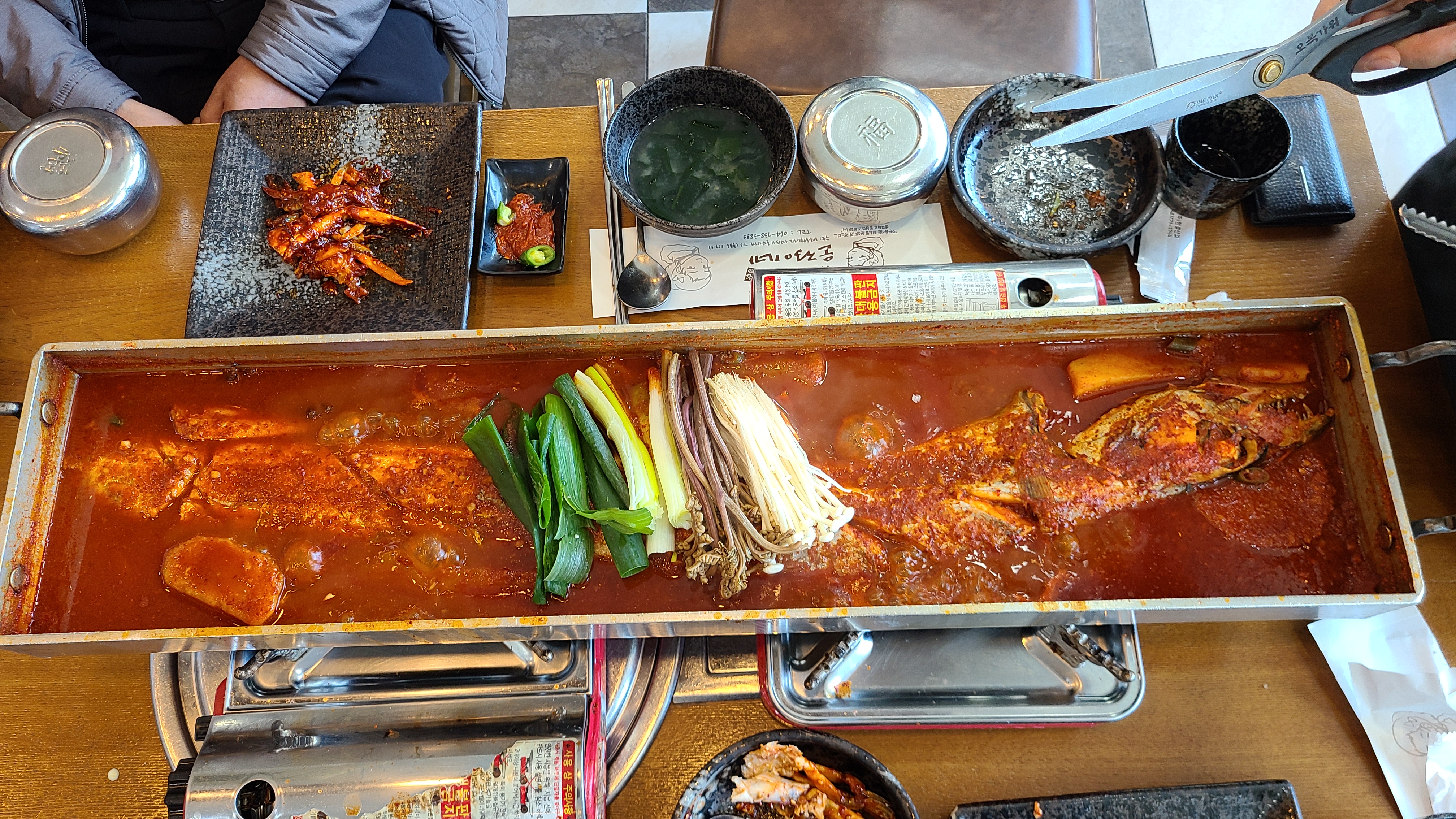 새섬관광을 마치고는 유명하다는 칼치집으로 택시와 승용차로 이동하여 점심을 먹는다.