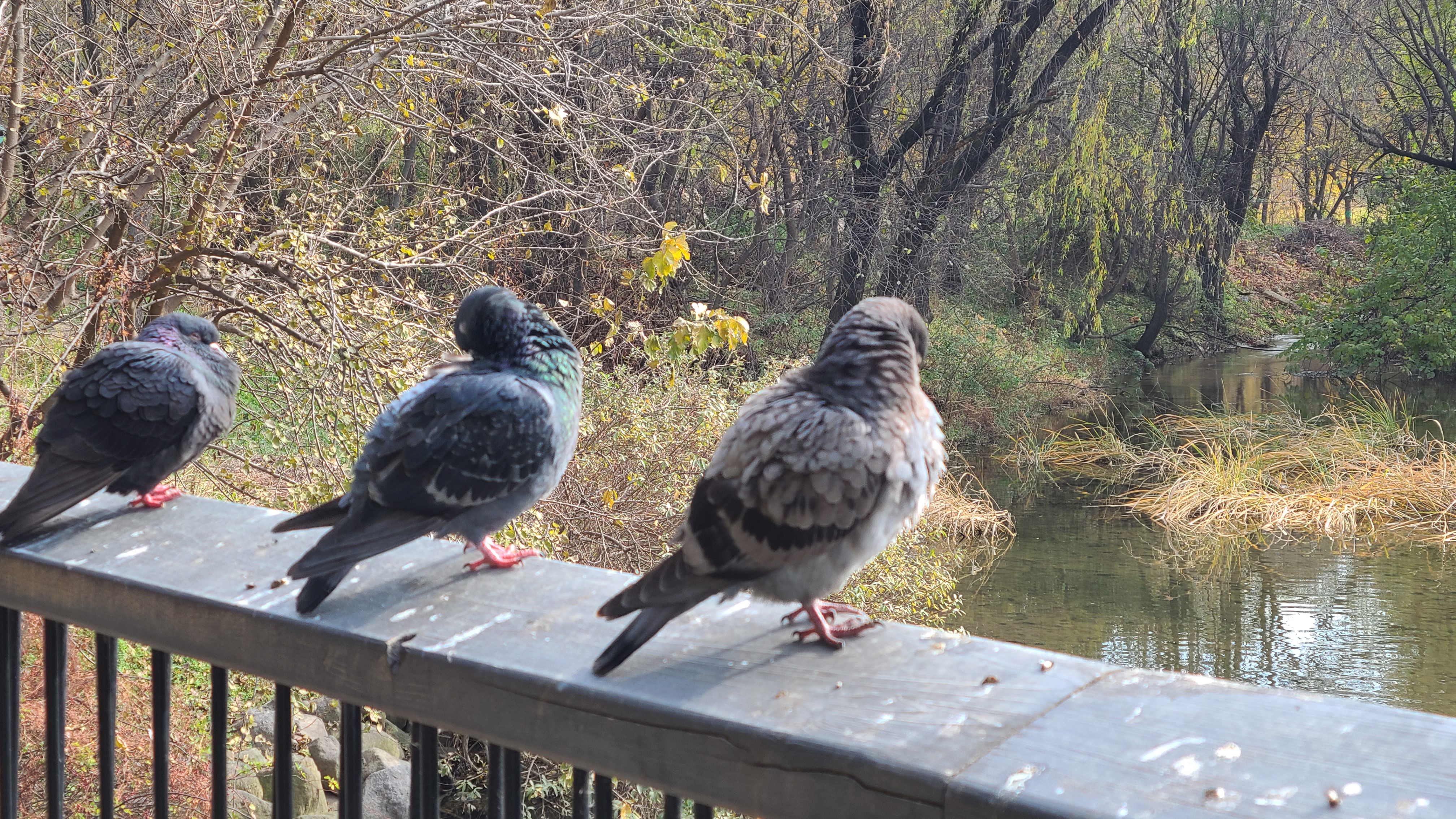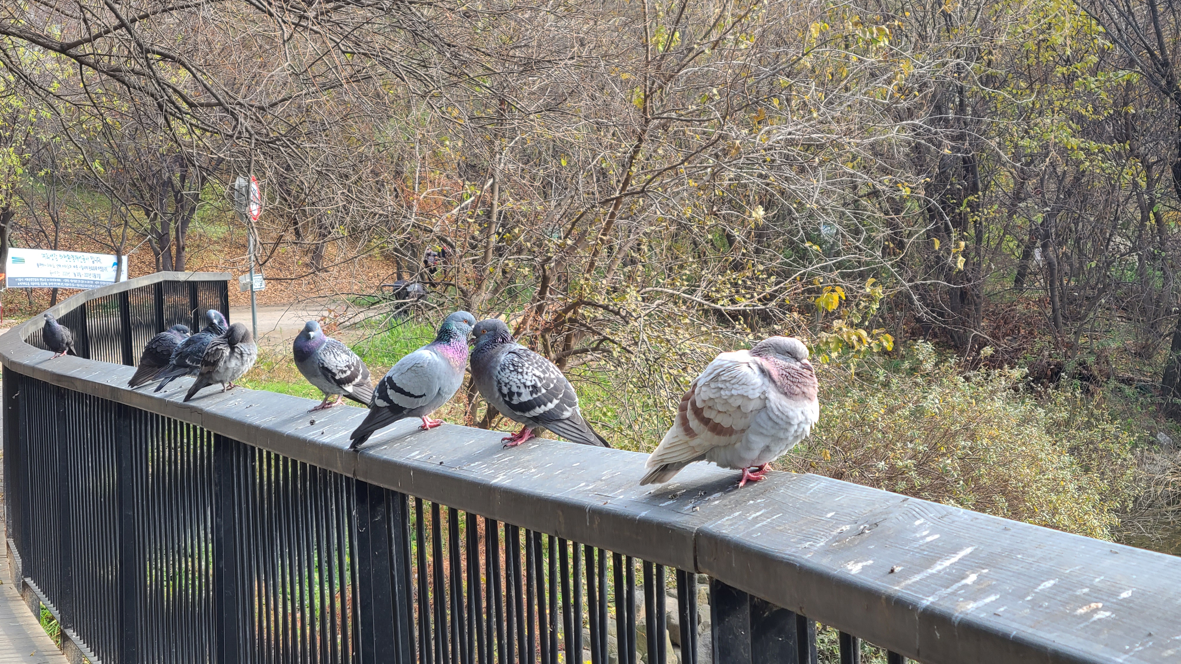 샛강 어느 난간에 줄지어 앉은 비둘기모습이 이채롭다.