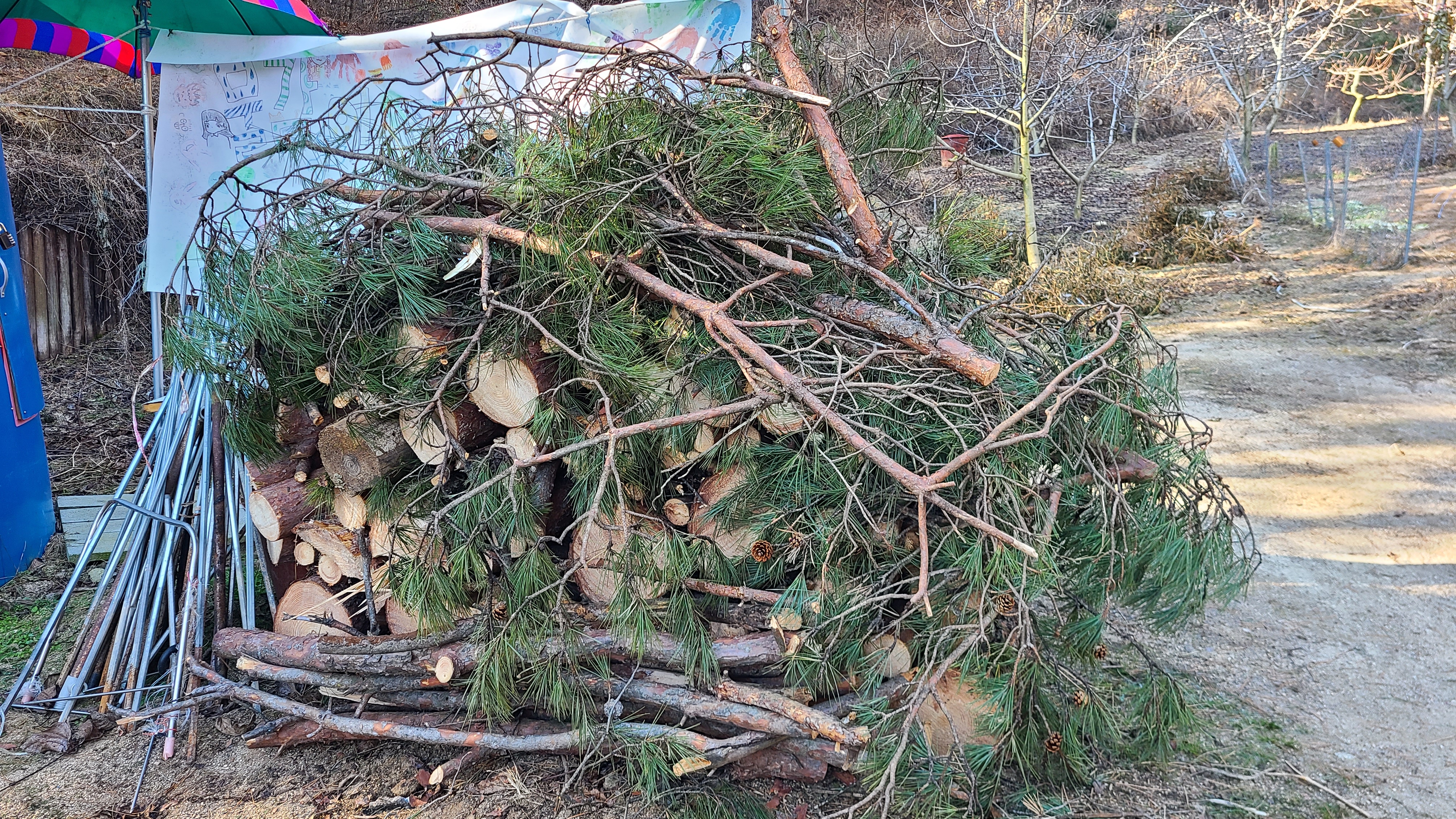 가지를 베고 나무를 적당한 길이로 잘라낸다. 전동톱이 아니면 엄두를 내지못할 일이다.