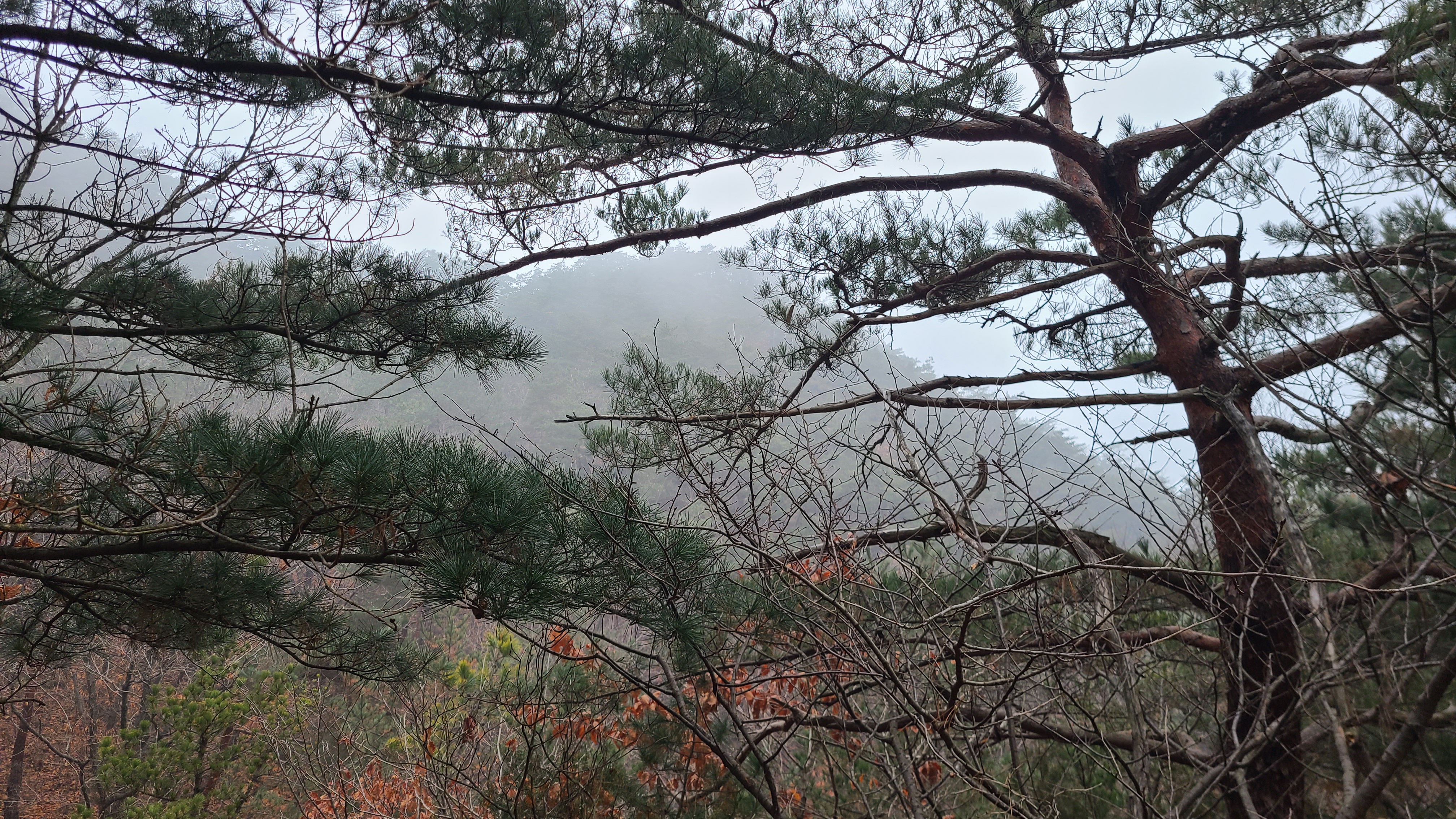 안개와 미세먼지가 자욱하여 불과 몇십미터정도의 시계가 확보될뿐,나머지는 하얗게 뒤덮힌 세계이다.