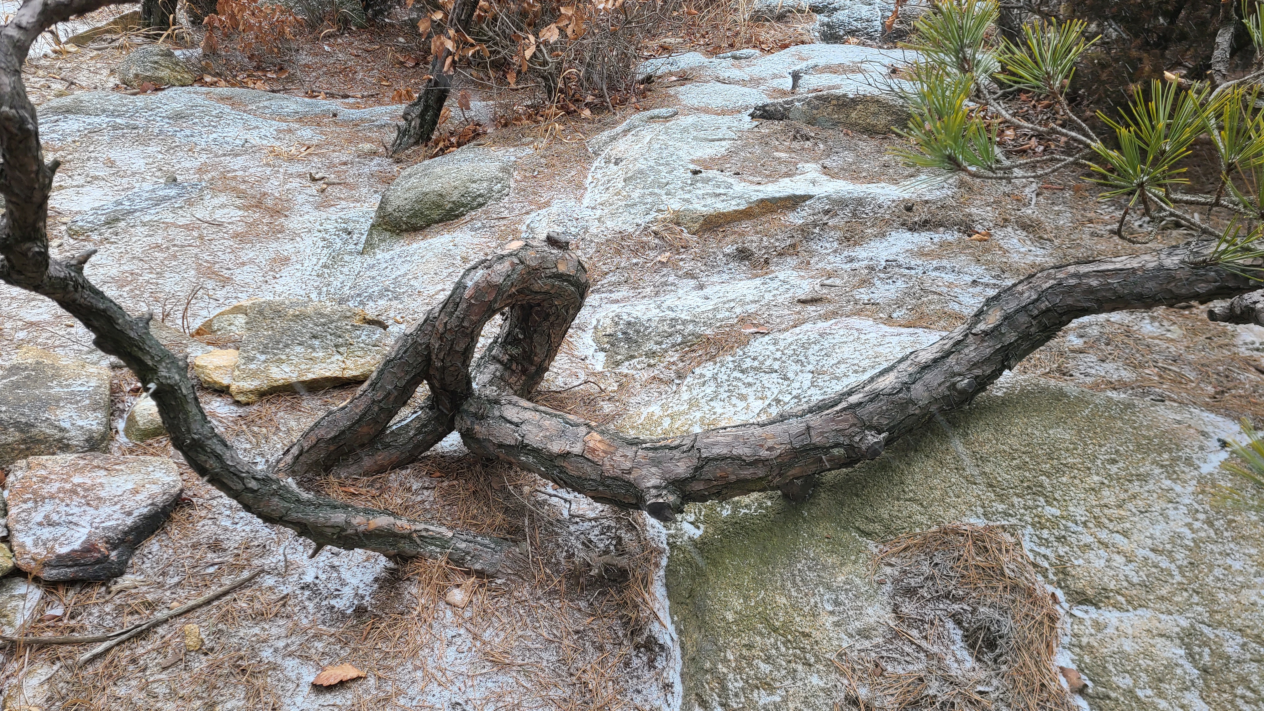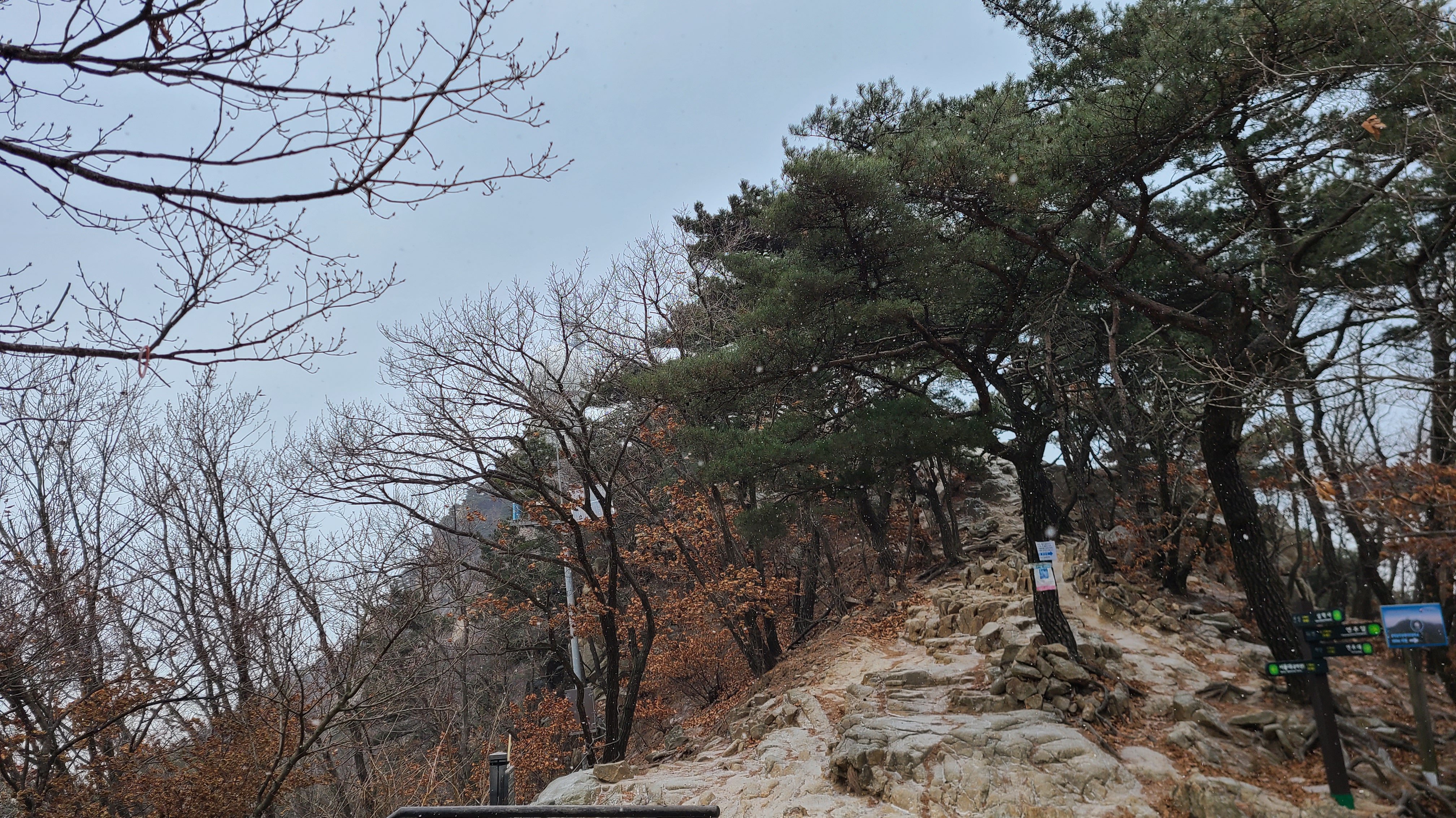관악능선을 오르며 마당바위에서 잠시 휴식을 하고는 다시 길을 걷는데, 맑은 하늘이 흐려지더니 눈이 내리기 시작한다.