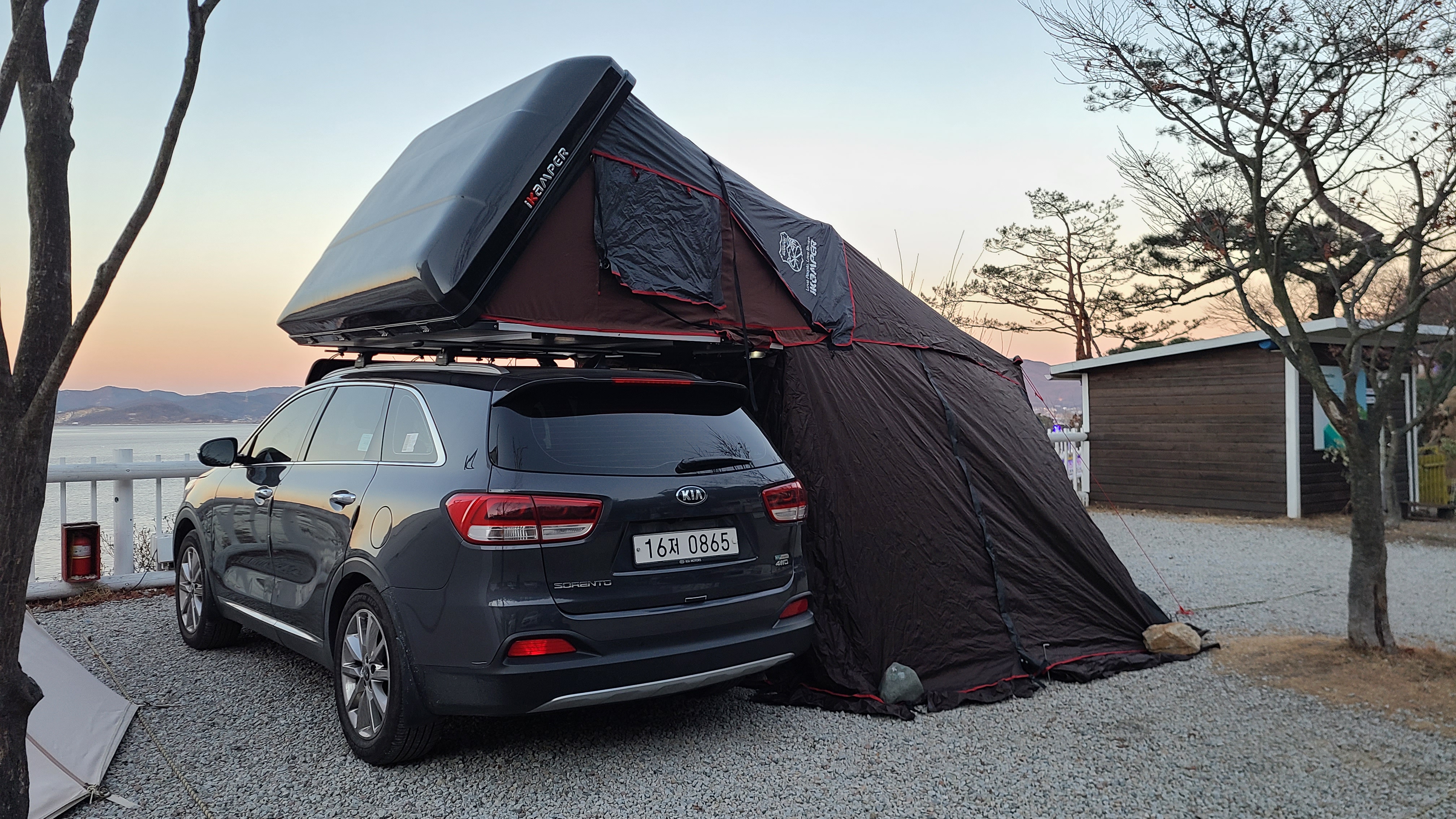 루프탑과 어닝을 설치하는데 땅이 얼어 팩이 제대로 박히질않아 애를 먹는다.