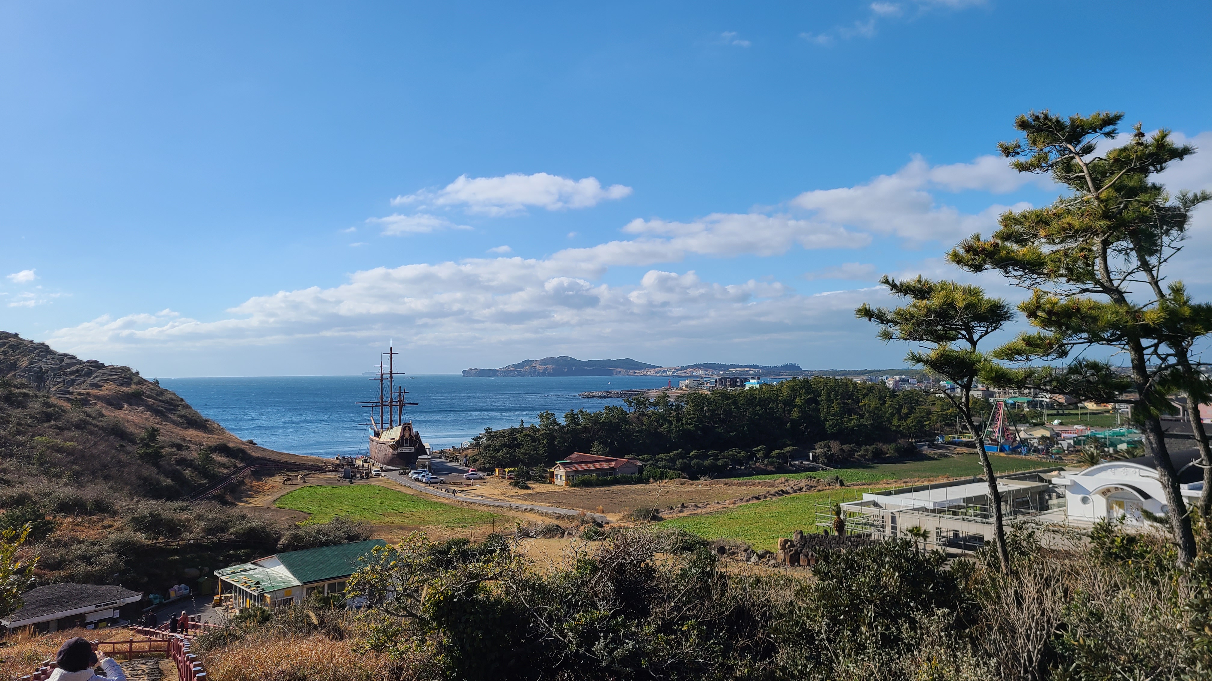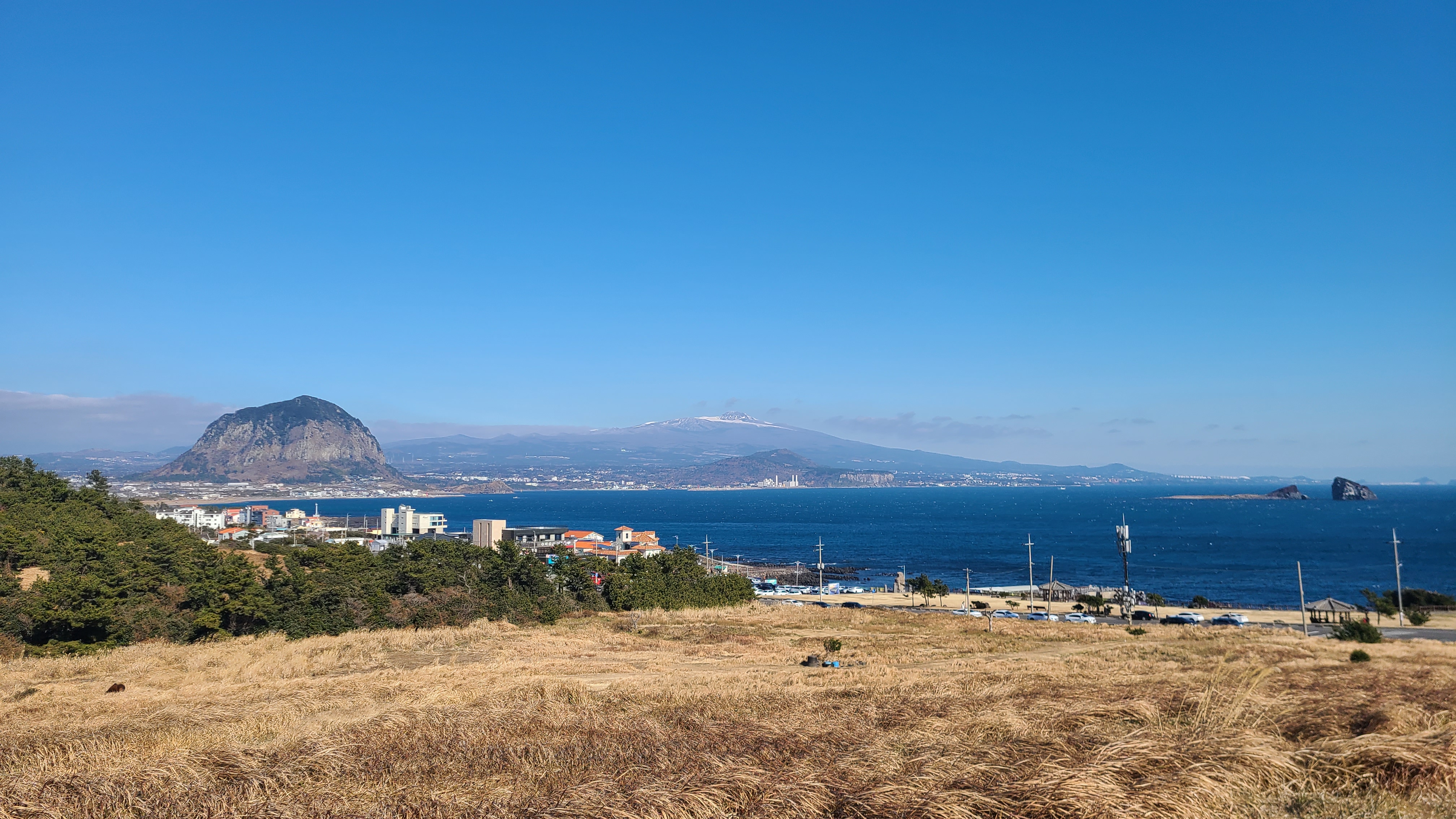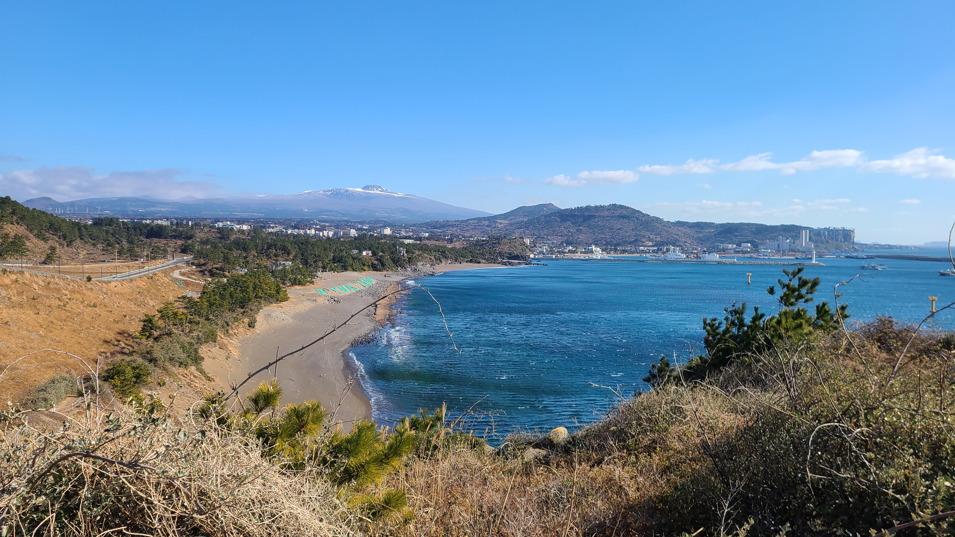 언덕을 올라서니 뒤로는 화순해변 앞으로는 산방산이 웅장하게 다가선다.