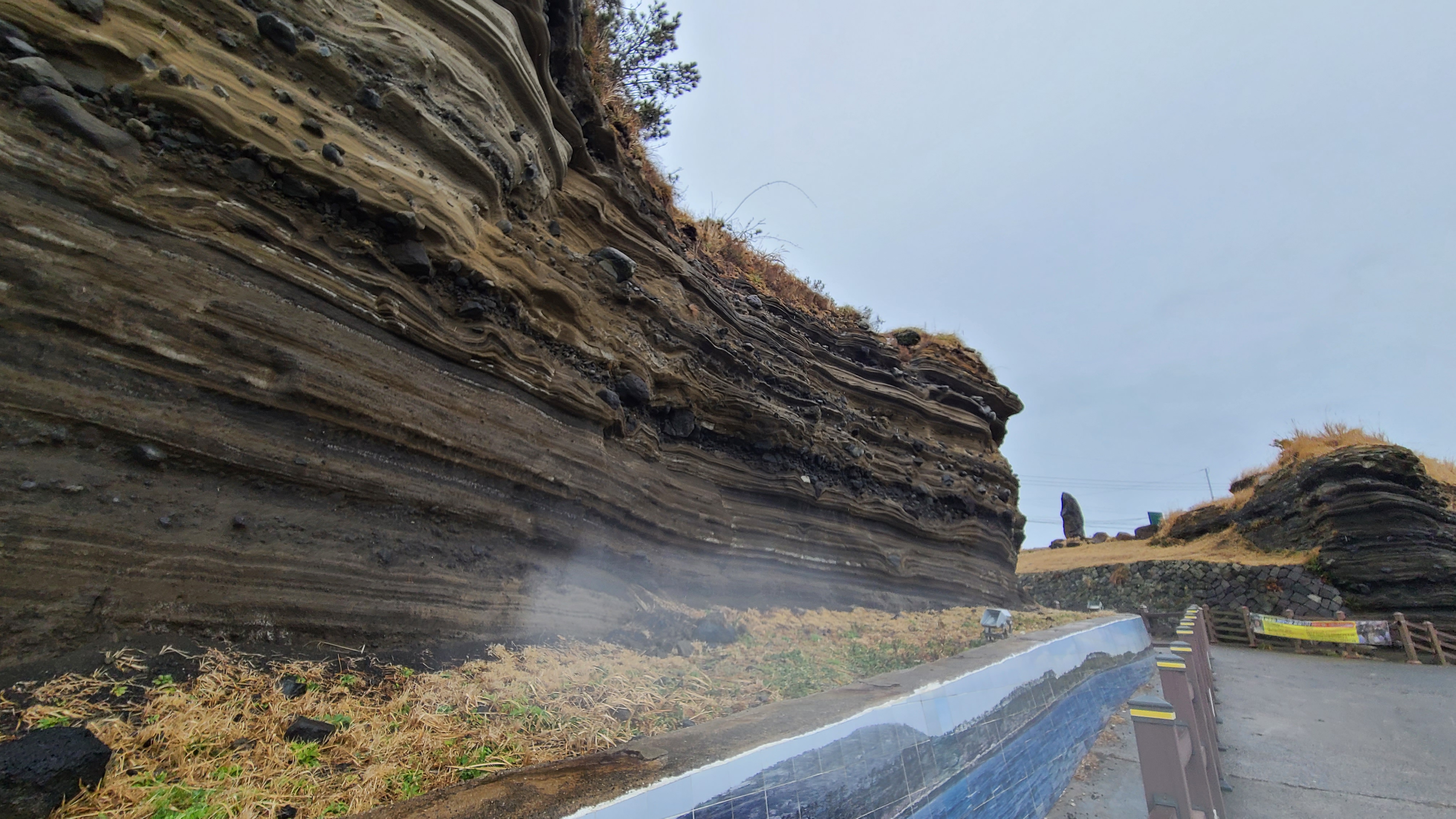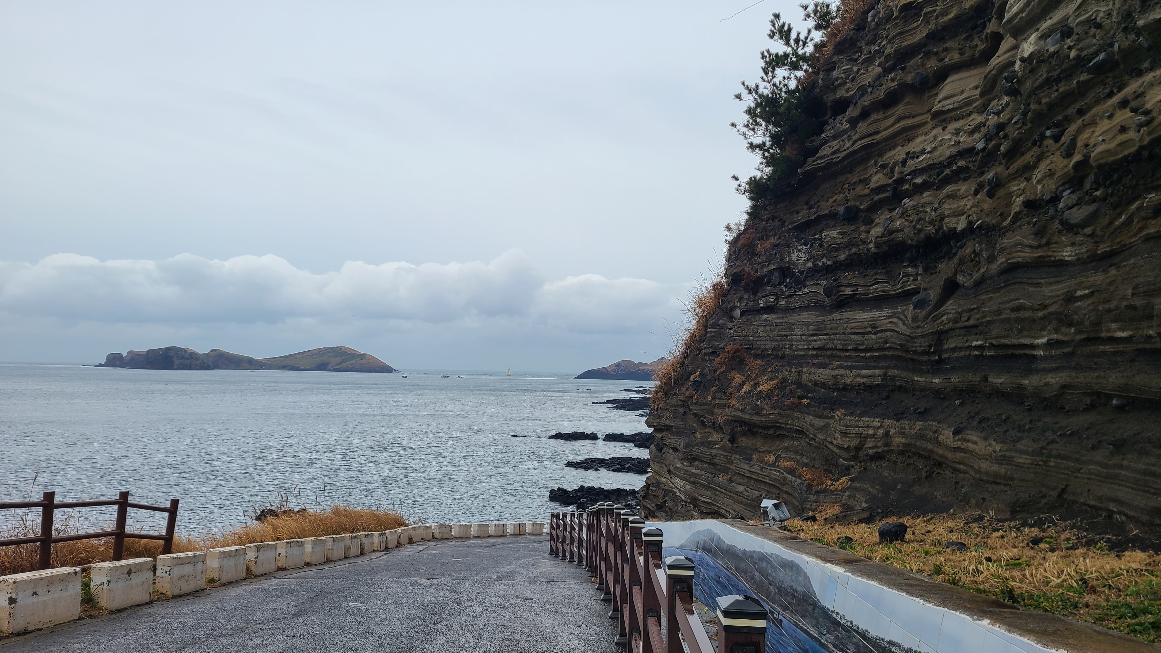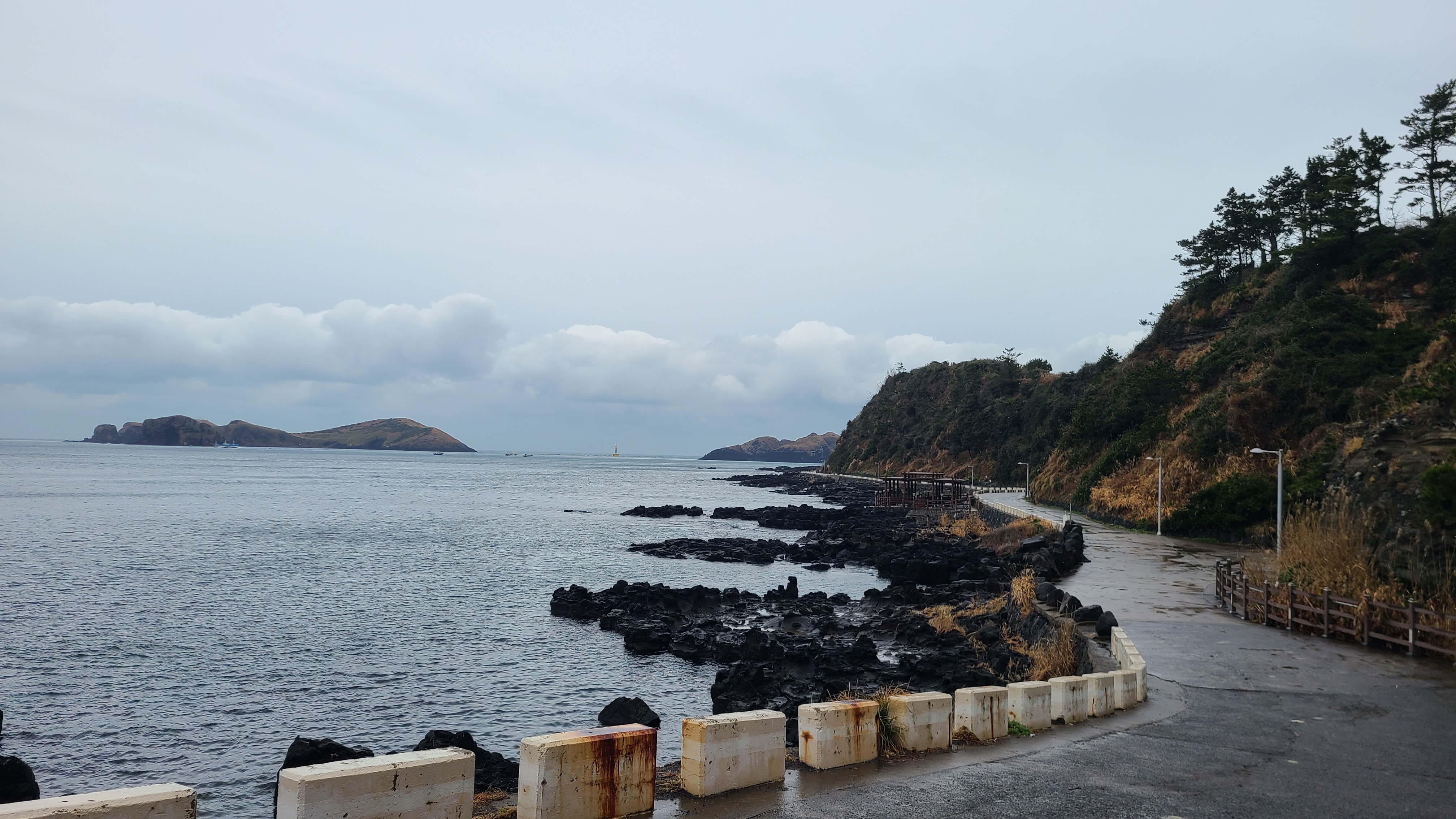 비내리는 해변을걷다가 화장실을찾는 도반에게 조금더 가자고했다가 삐치는데,수월봉하단의식당까지 이어진다.