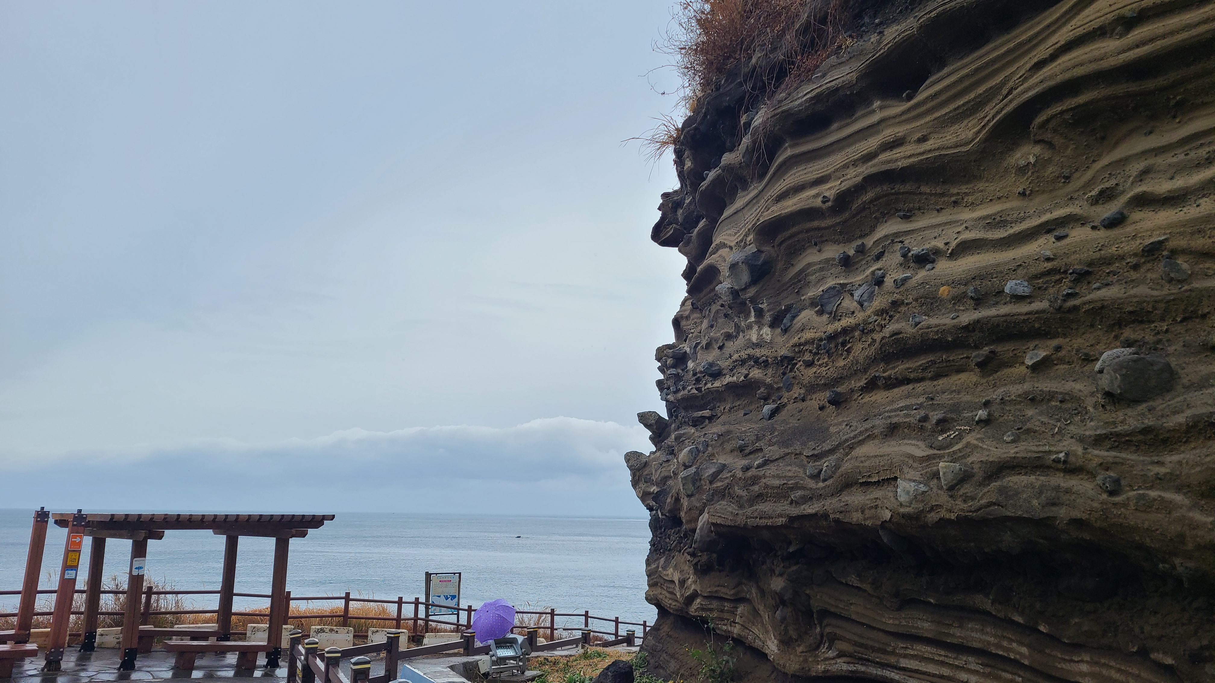 비내리는 해변을걷다가 화장실을찾는 도반에게 조금더 가자고했다가 삐치는데,수월봉하단의식당까지 이어진다.