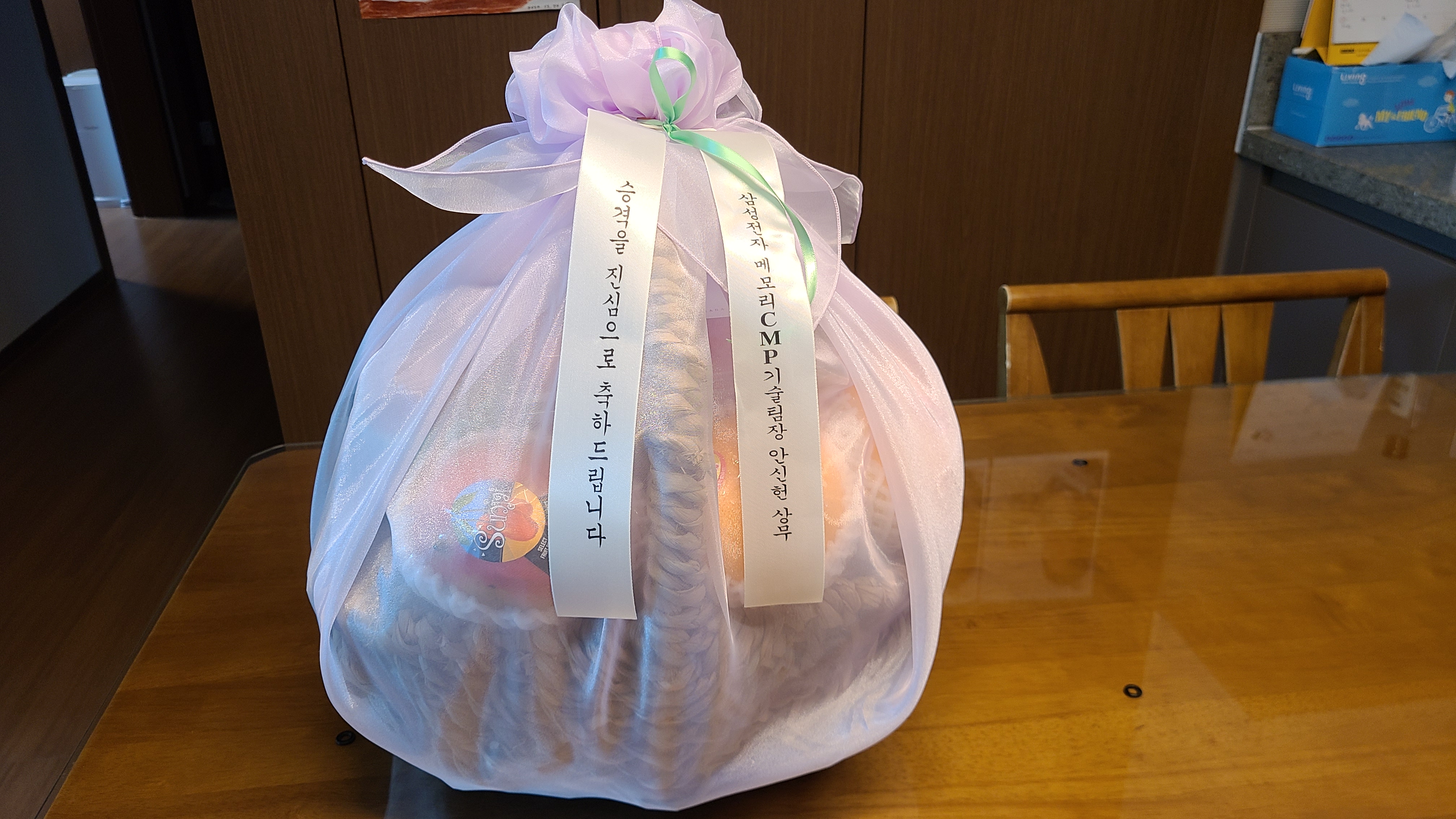 해외근무중인 아들네 회사에서 승격을 축하한다는 과일바구니가 배달되어왔다.