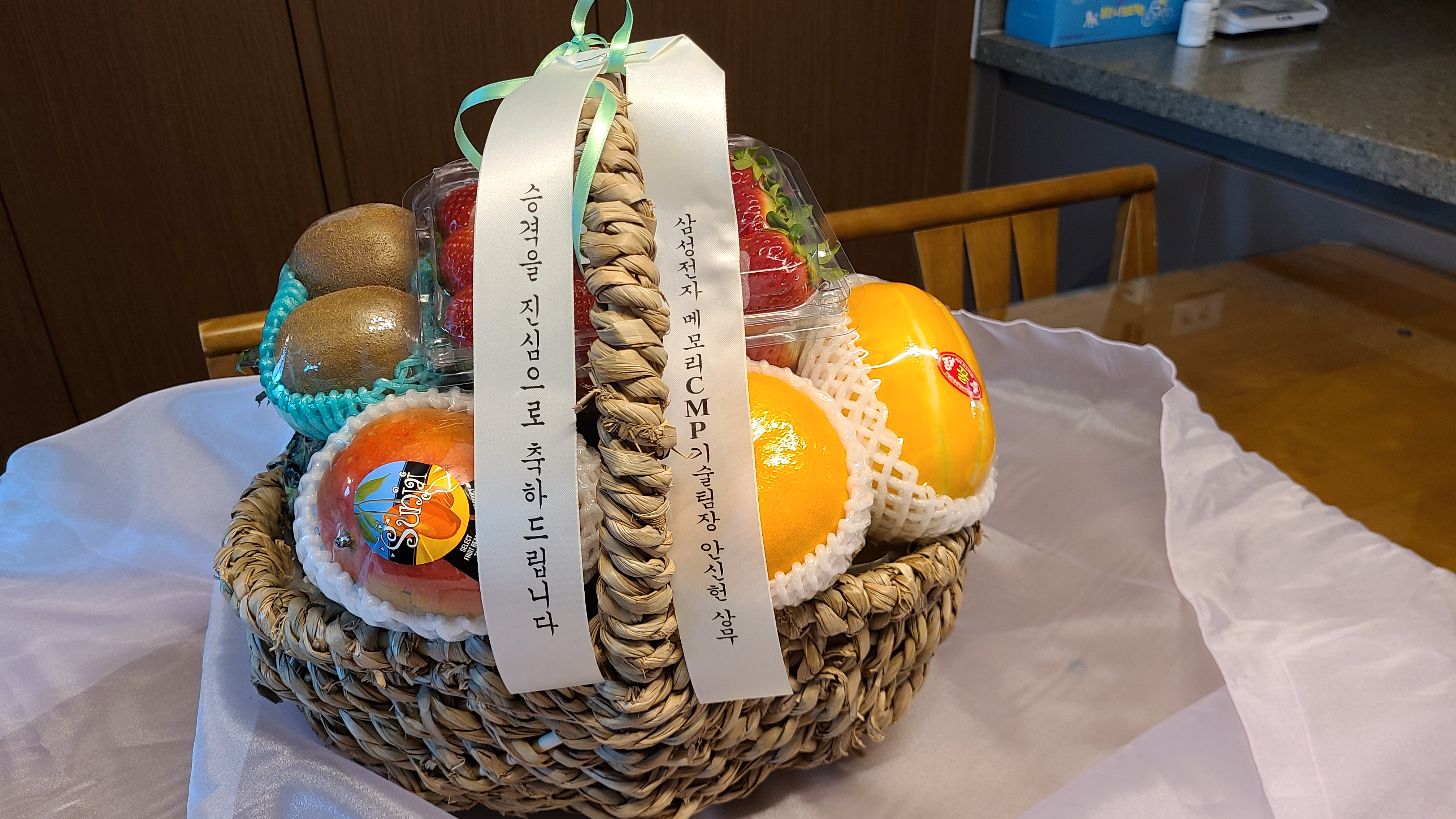 해외근무중인 아들네 회사에서 승격을 축하한다는 과일바구니가 배달되어왔다.