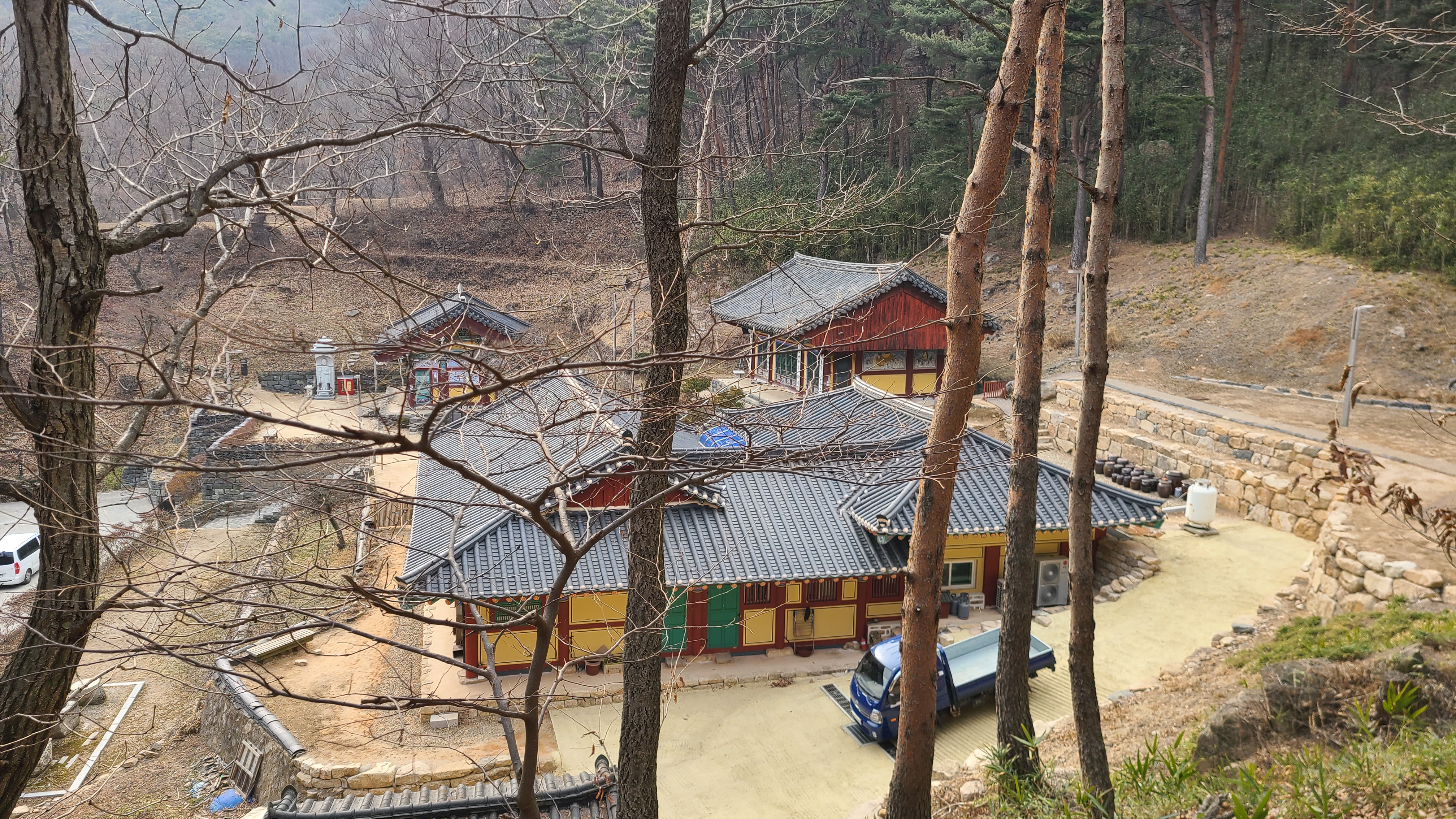 대웅전에 삼배를 올리고 산림욕장방향으로 걸어가는데 휴양림길이 코로나확진자 수용으로 차단되어있다.