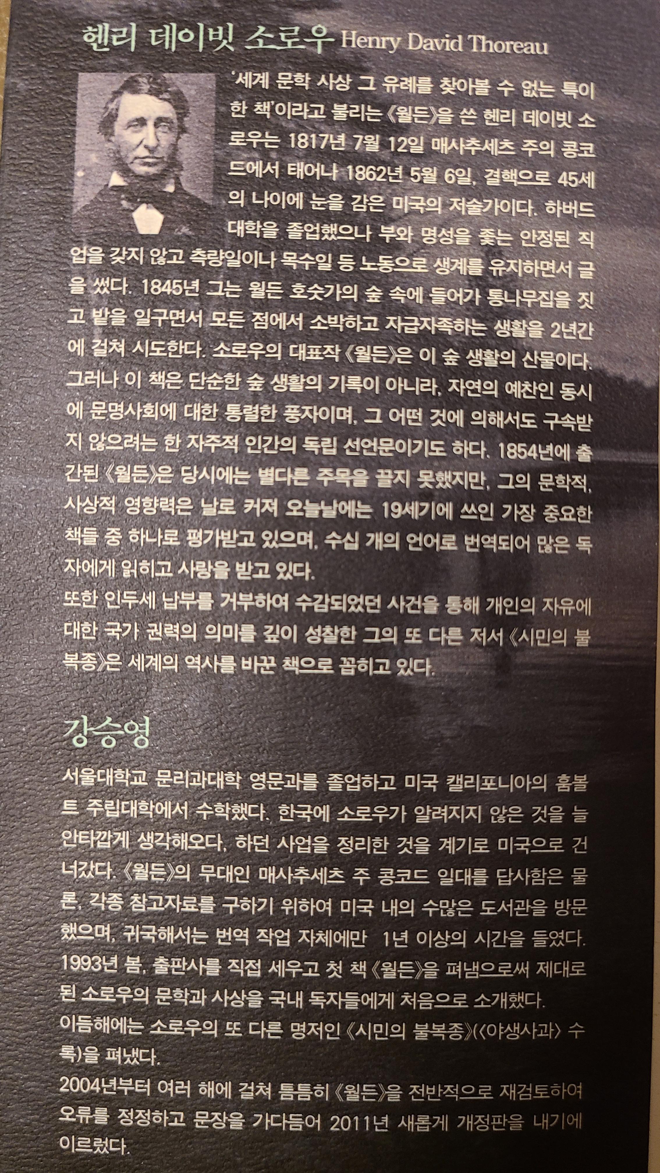 문명세계를 배척하고 자연에 머물며 소박하게 살아가며 저술한 이책은 많은 이들의 심금을 울리고 깨달음을 주었다한다.