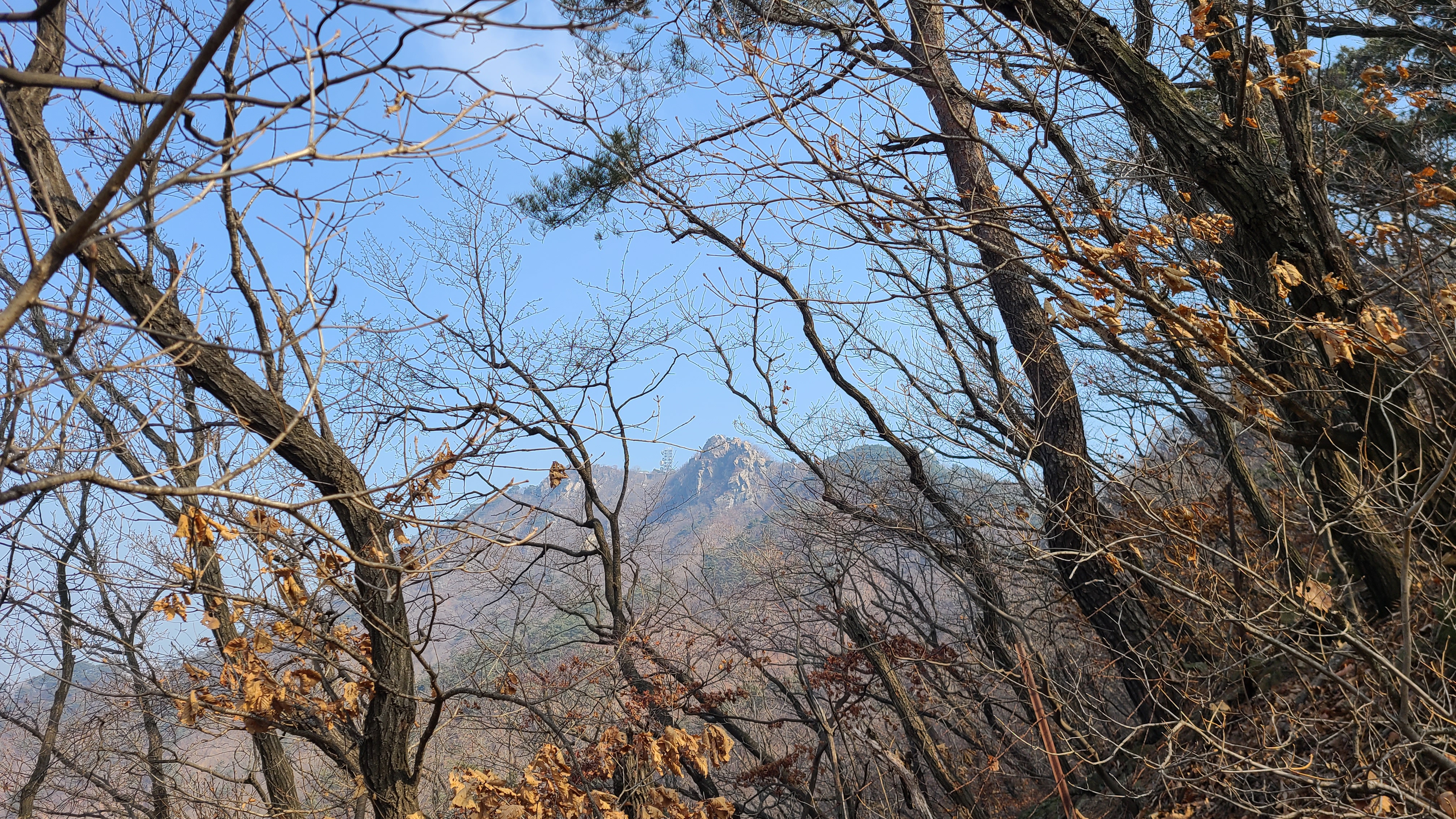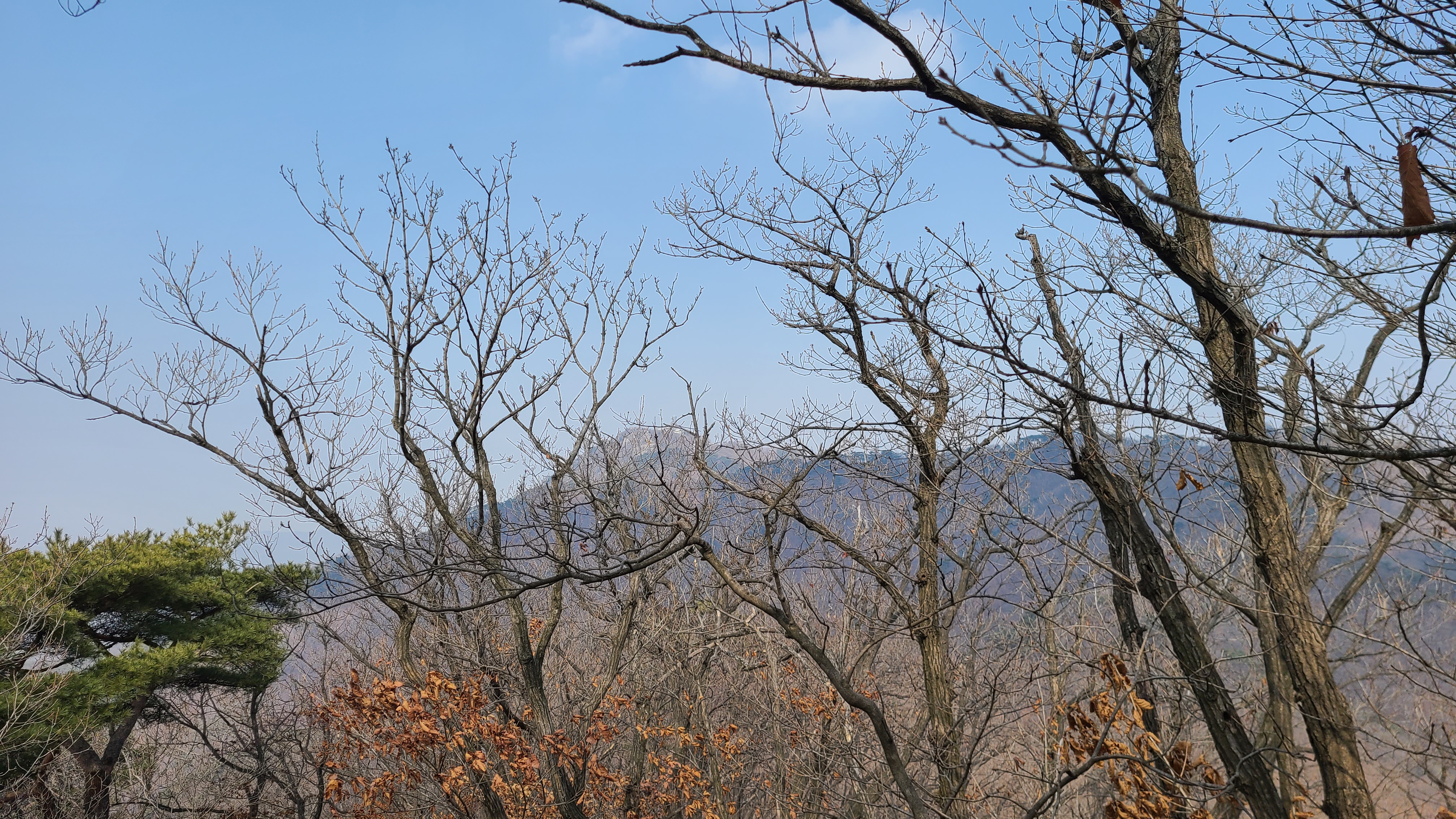 안부를 올라서니 건너편의 관악산이 미세먼지속에서 희미하게 보인다.