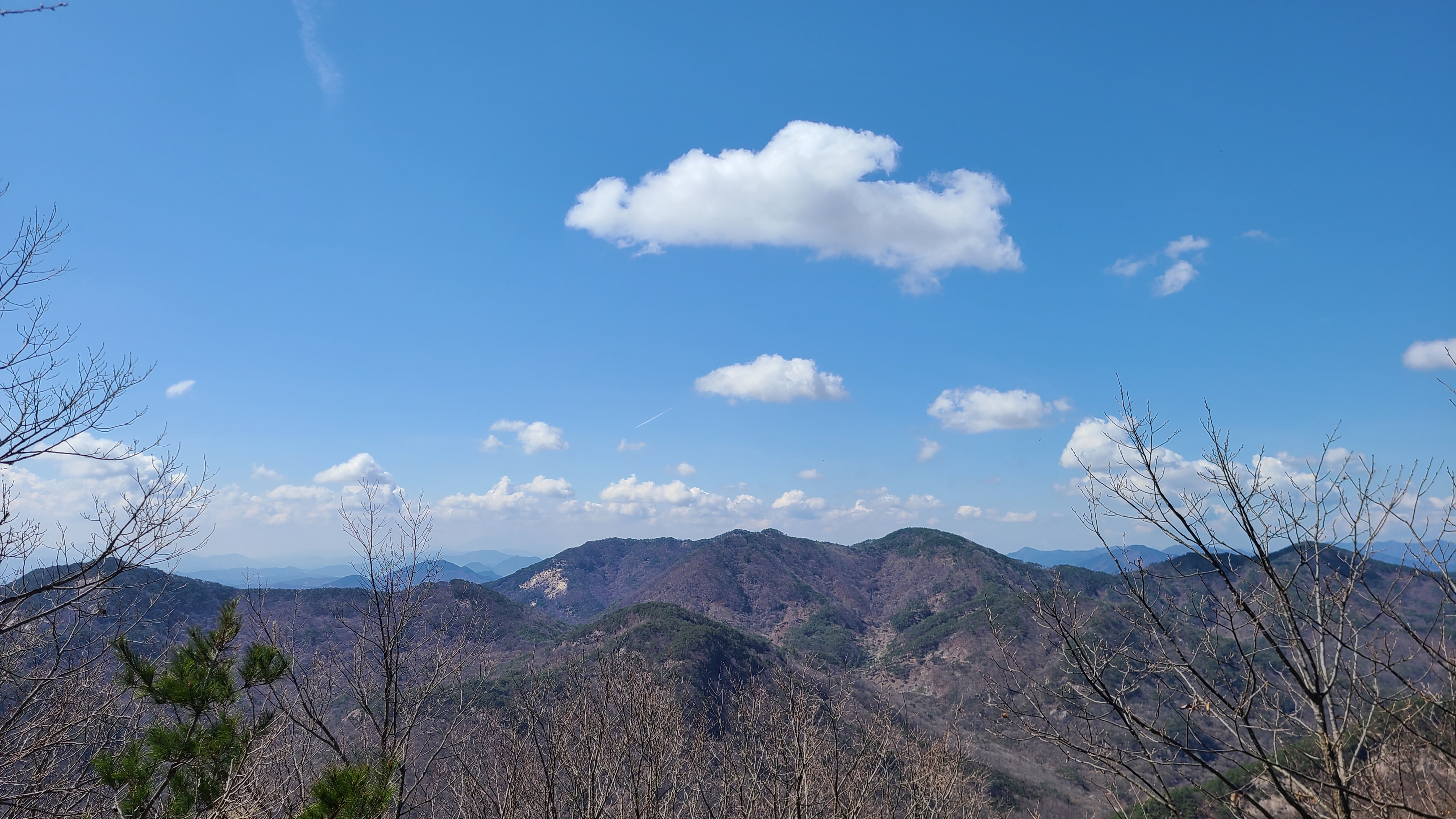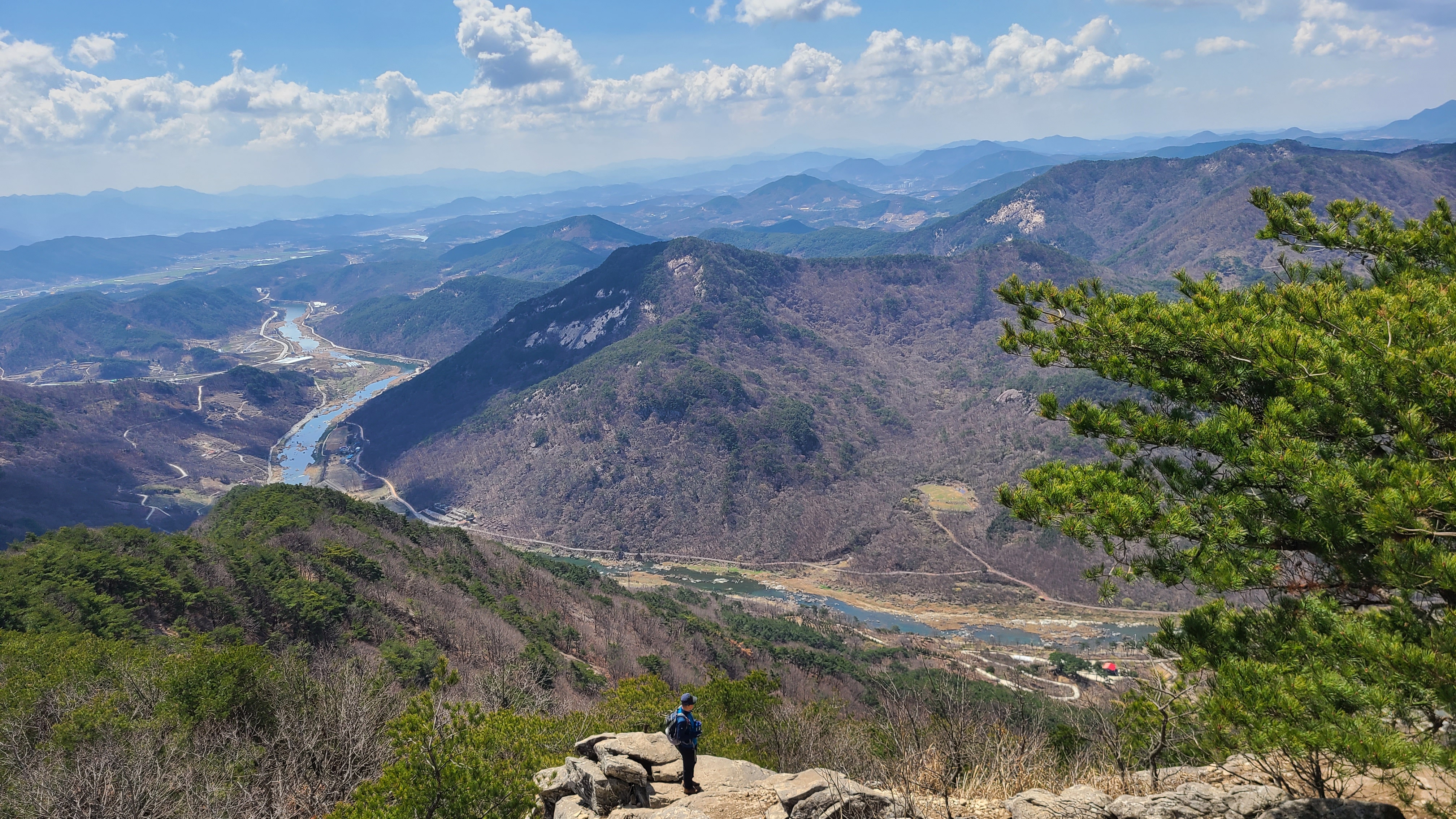쾌청한 날씨에 미세먼지가 없어 주변의 산군과 멀리 지리산주능선이 뚜렷하게 바라보인다.
