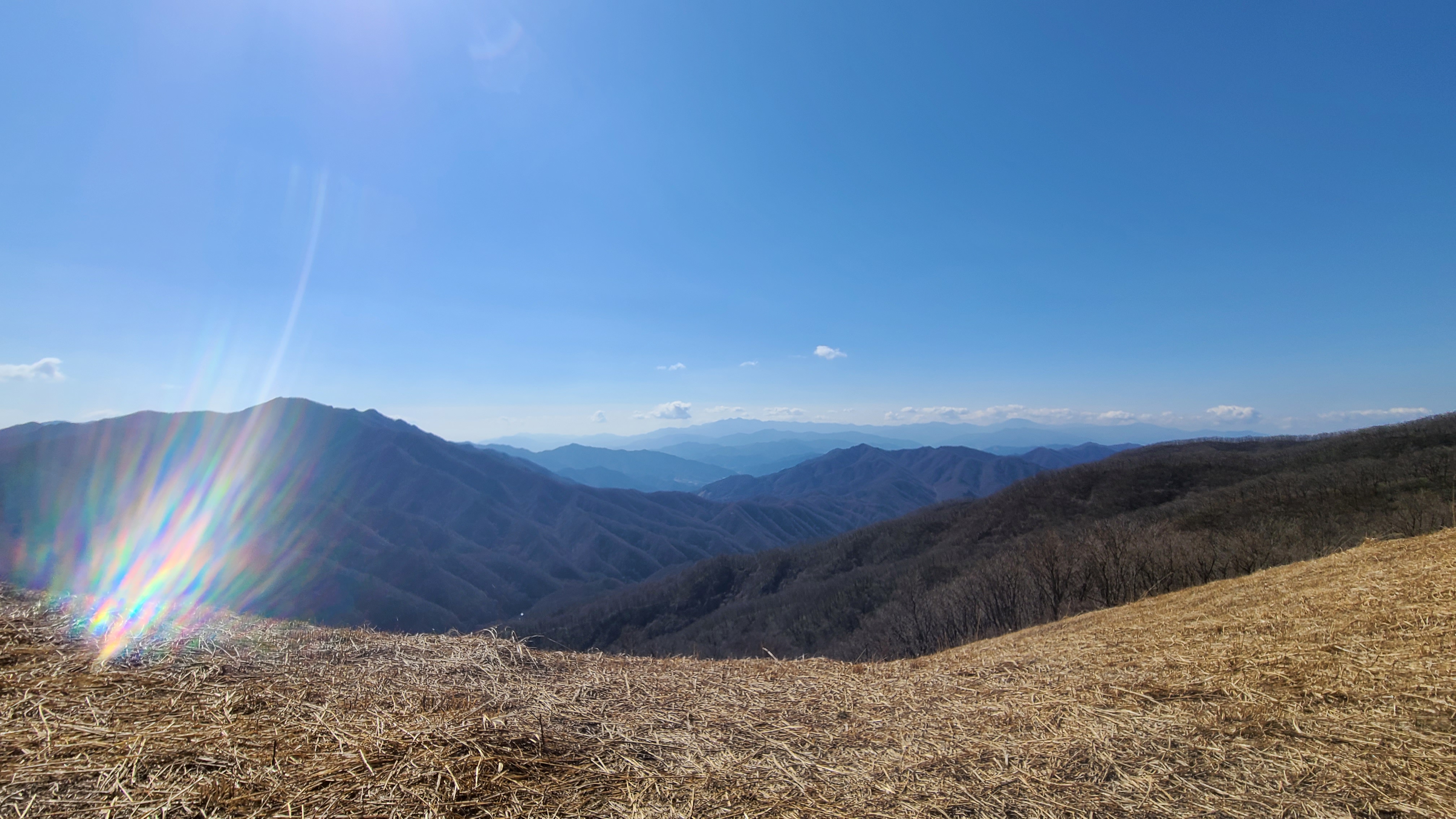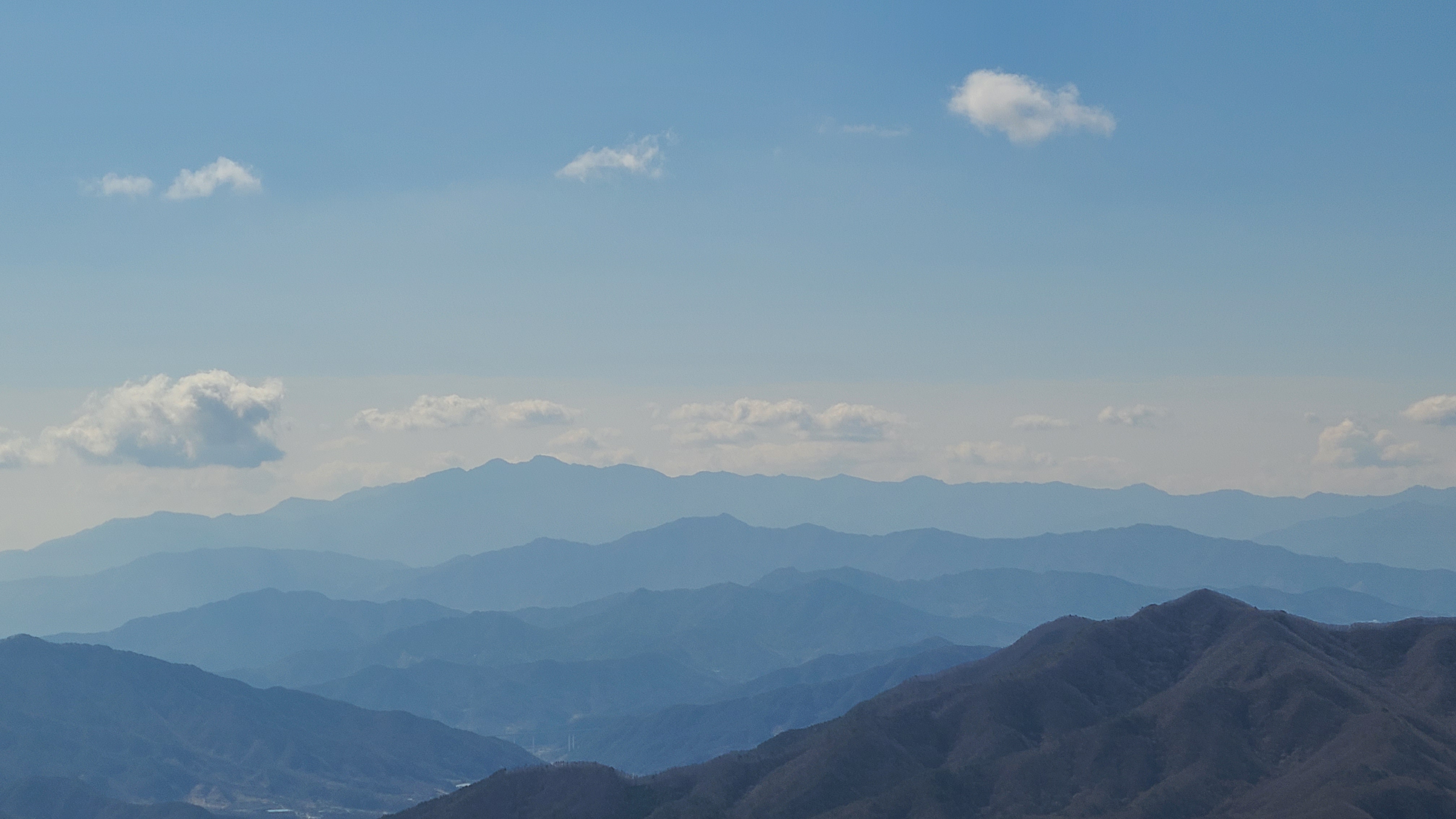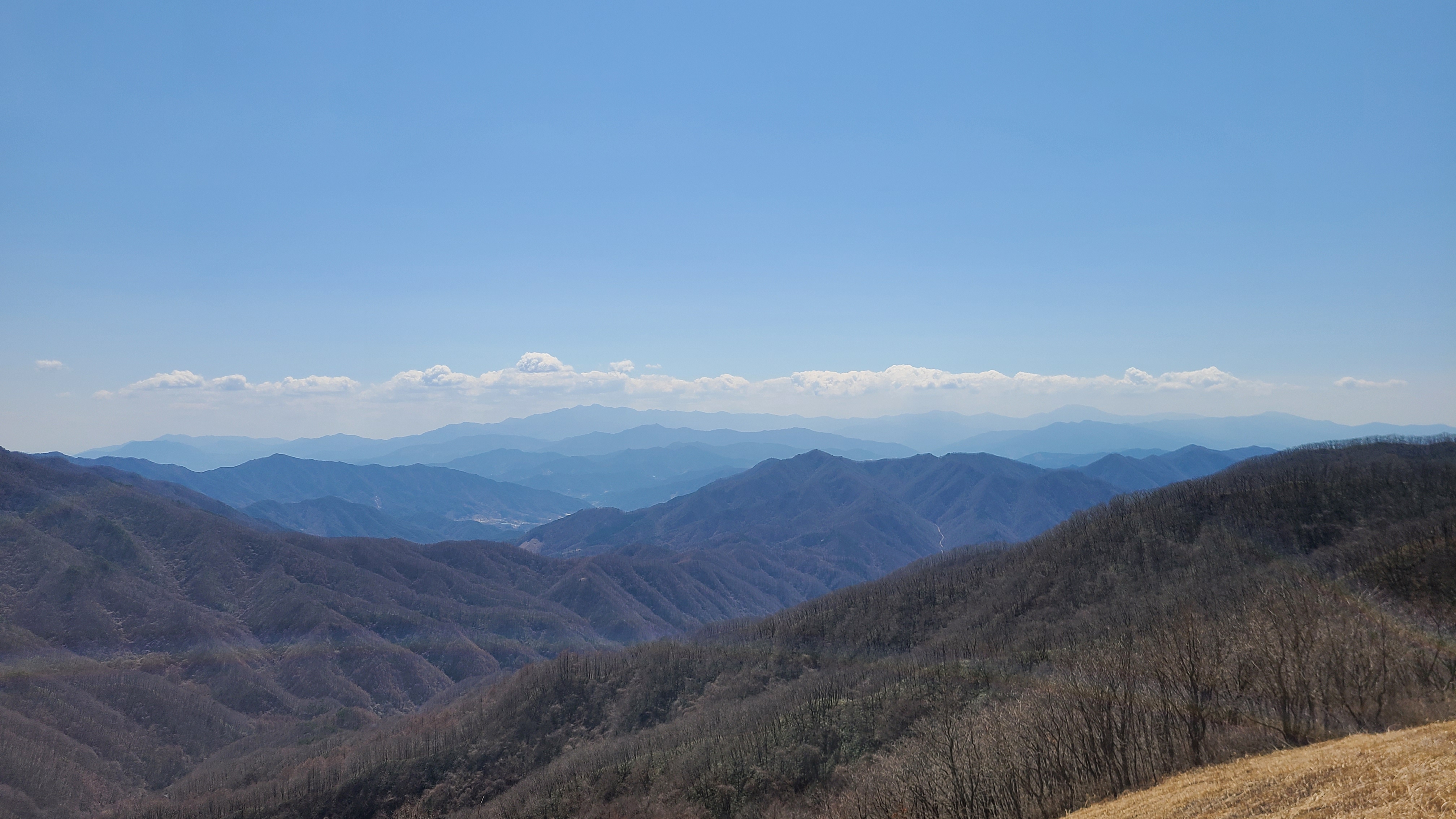 멀리 지리능선도 바라보이고 산그리매들이 겹겹이 둘러쌓여있다.