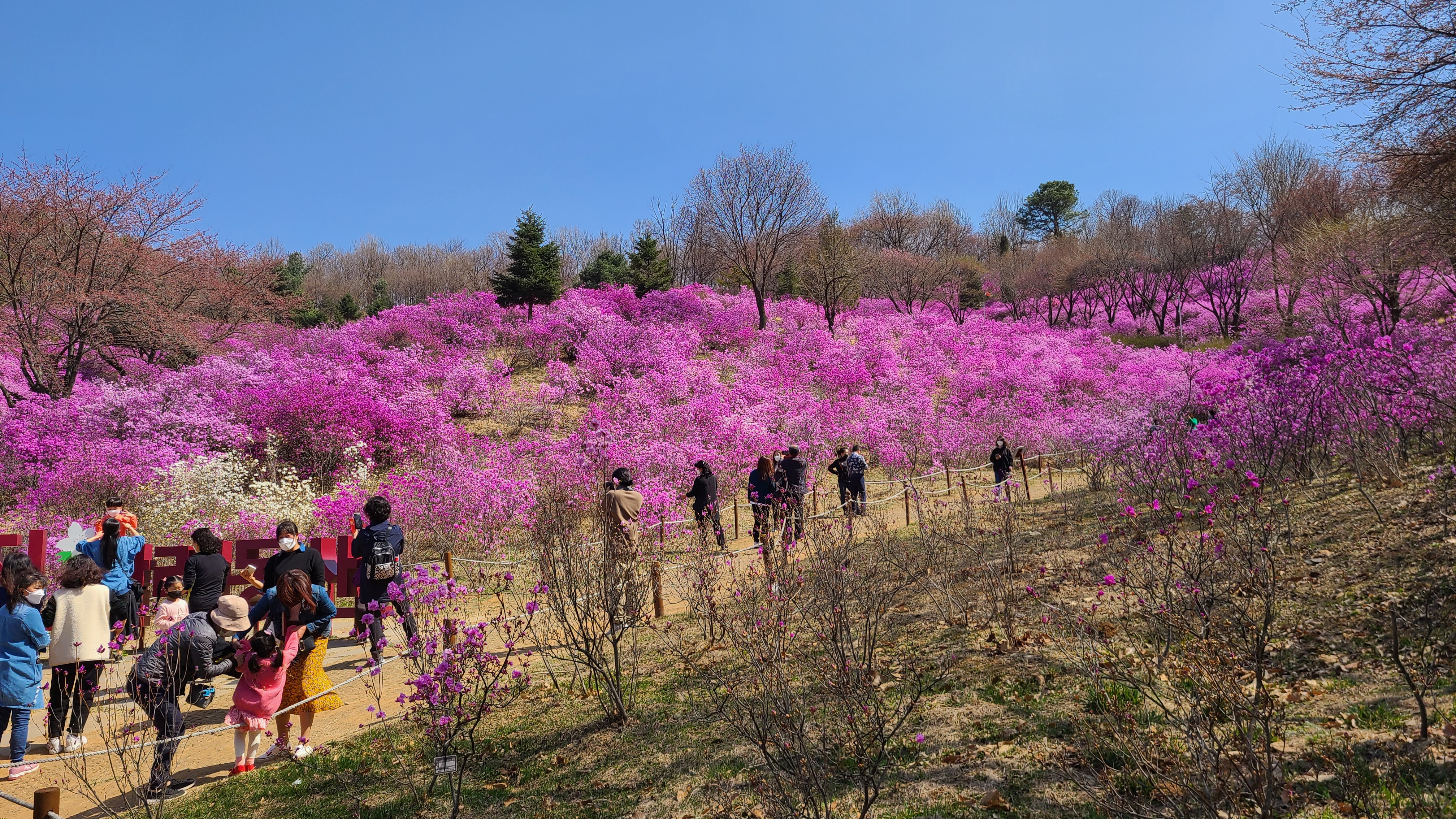 코로나로 외부활동이 제한되어 많은 사람들이 진달래 구경을 나와있다.