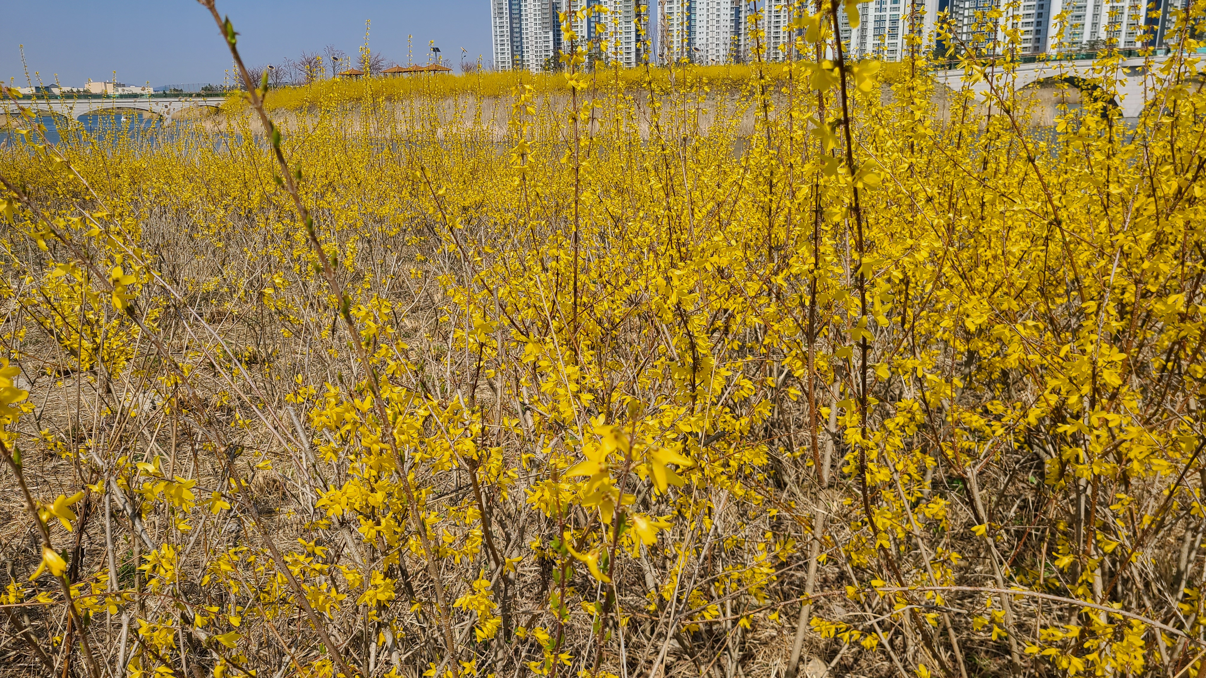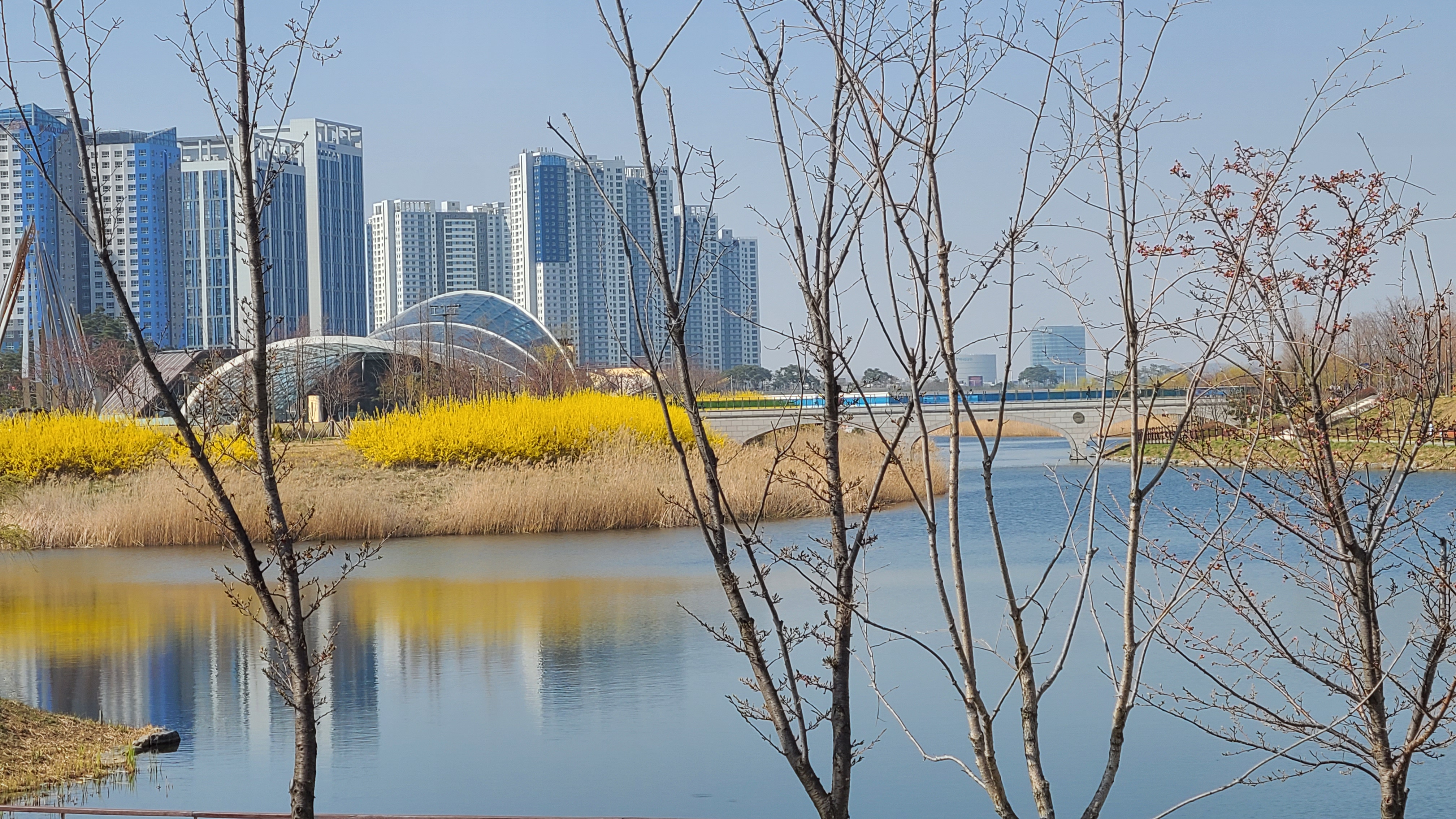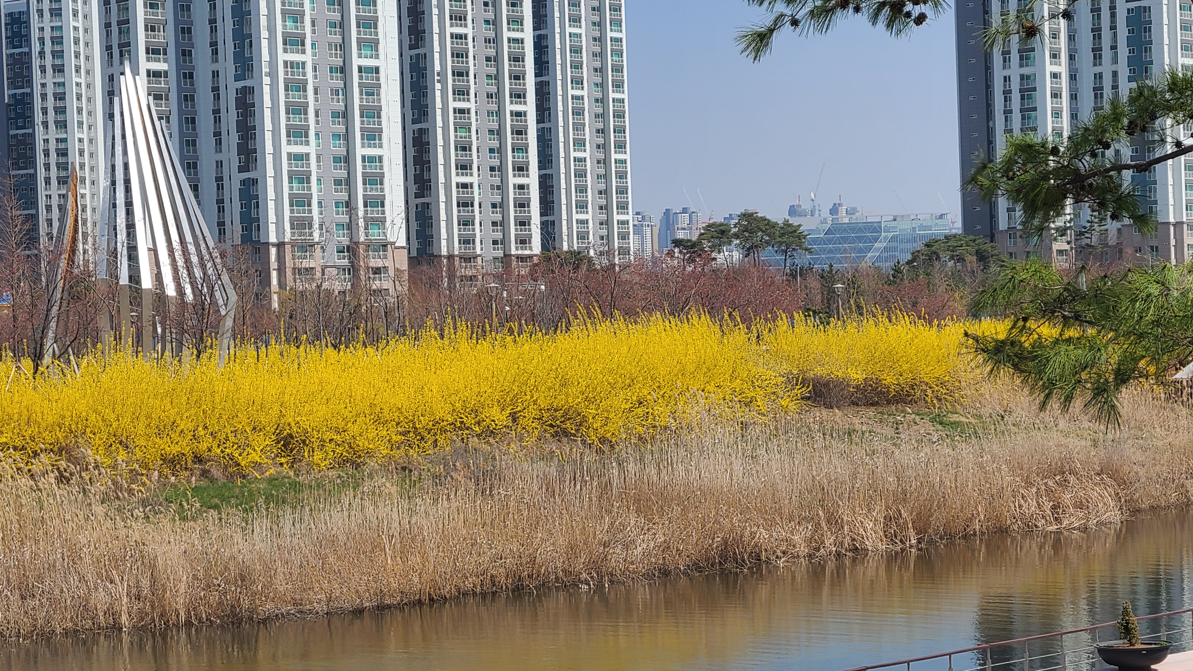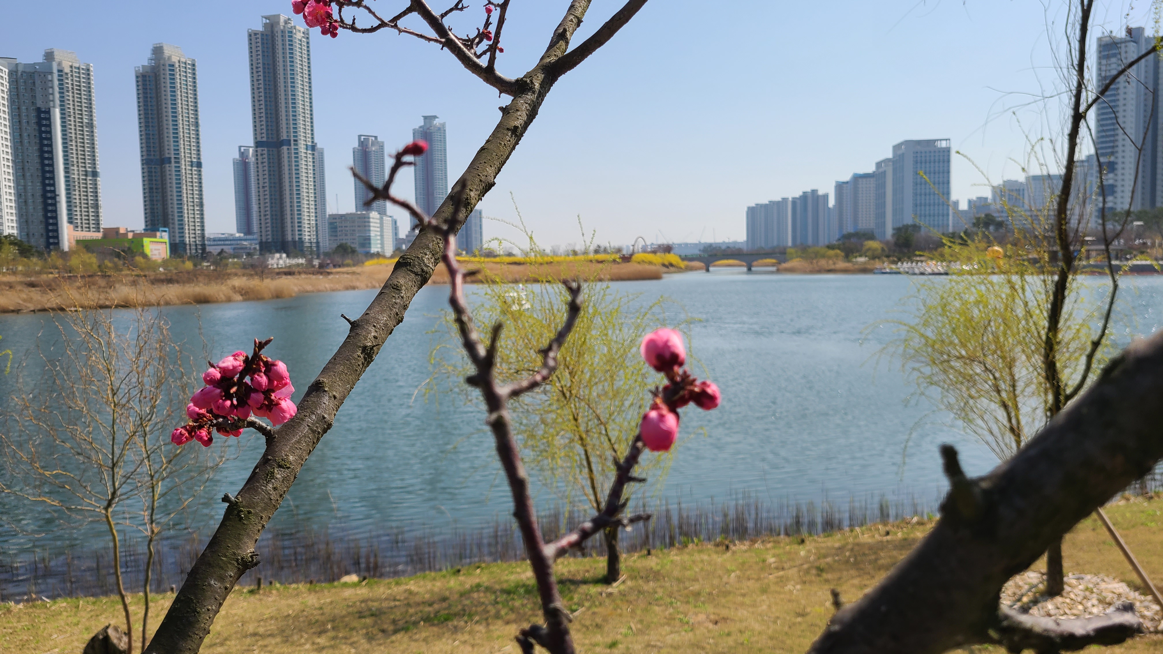 호수는 완연한 봄이다. 호수둘레와 주변에 노란 개나리가 활짝피었고 주변의 벚나무엔 꽃망울이 맺히고