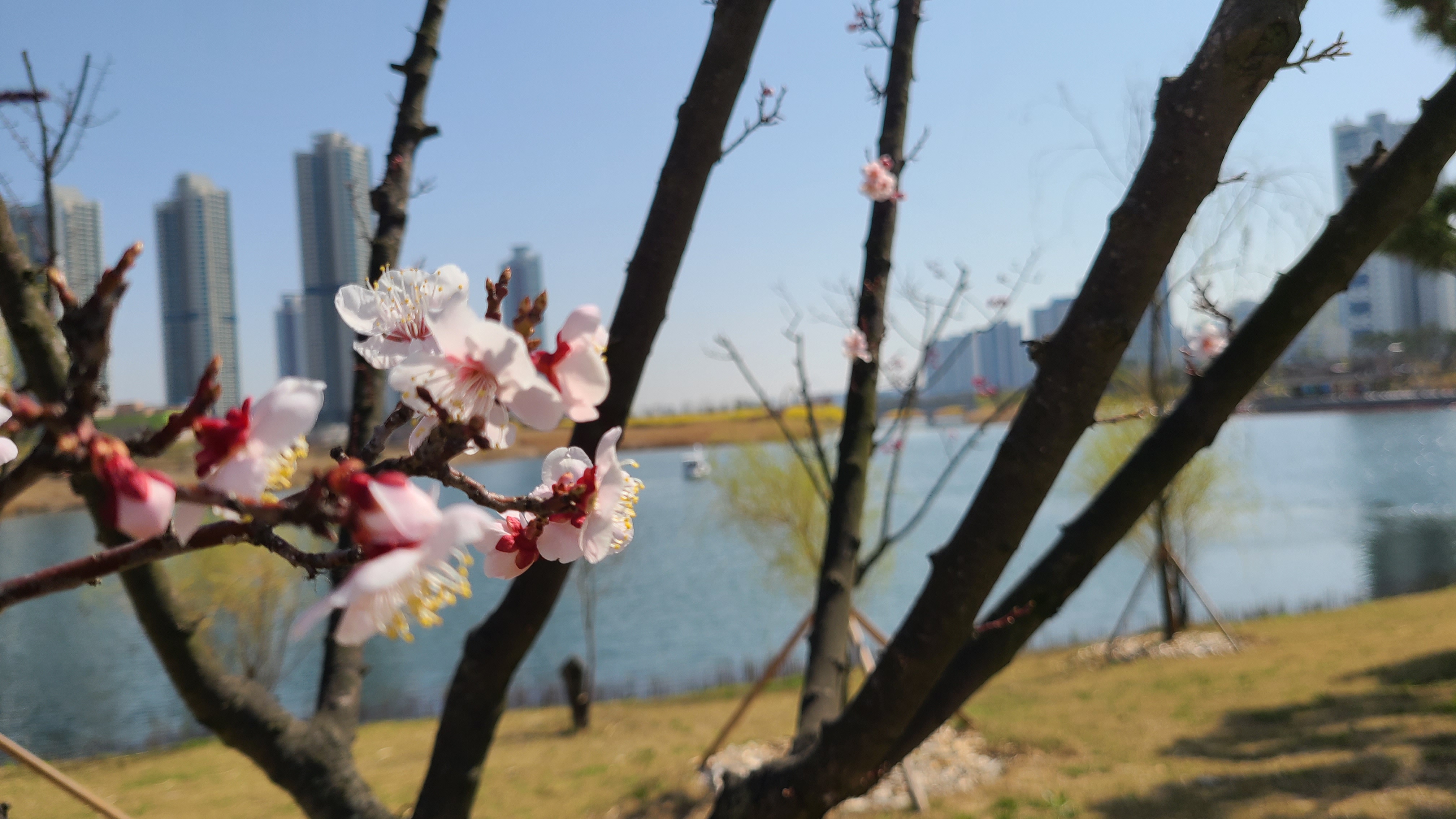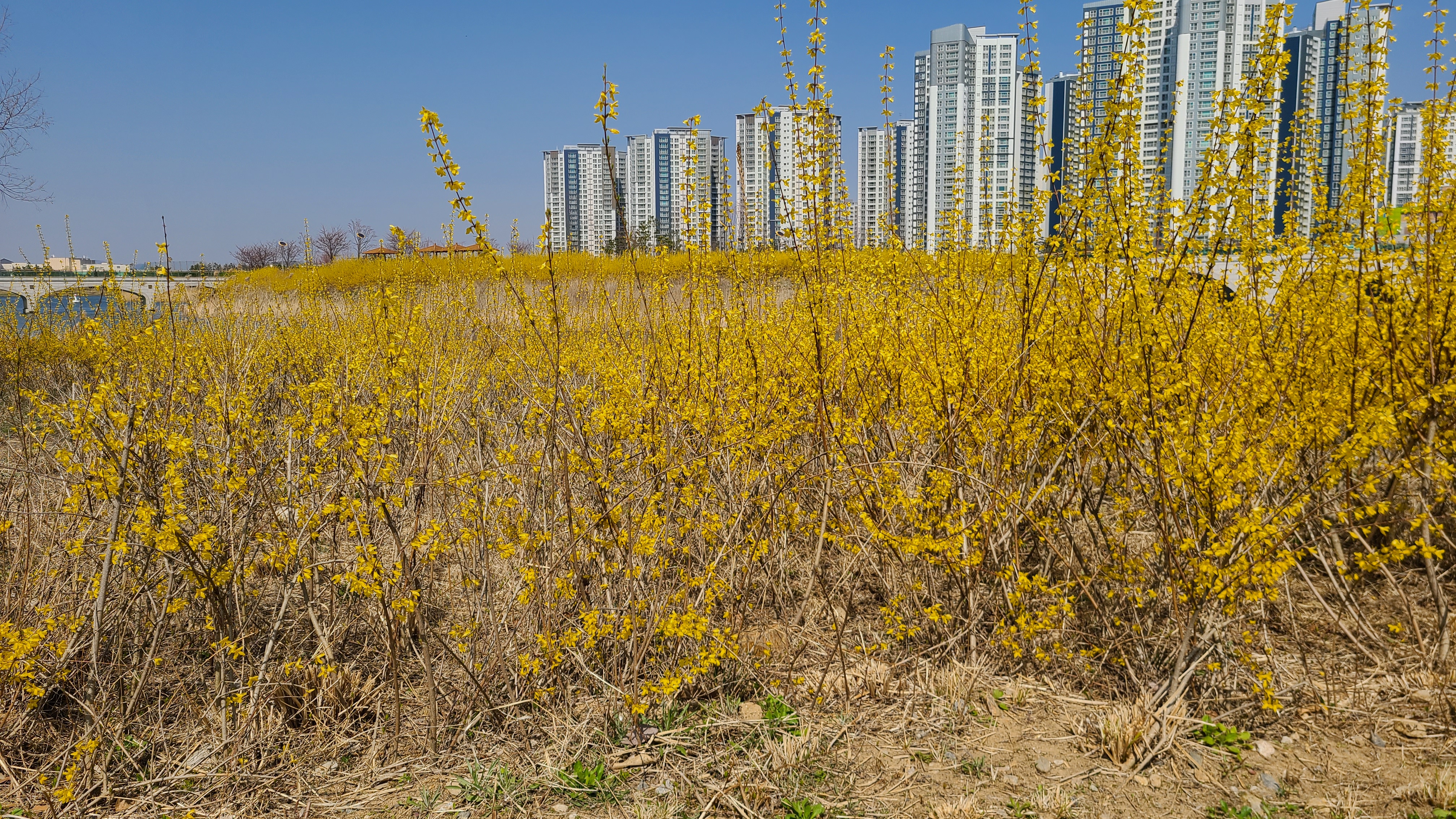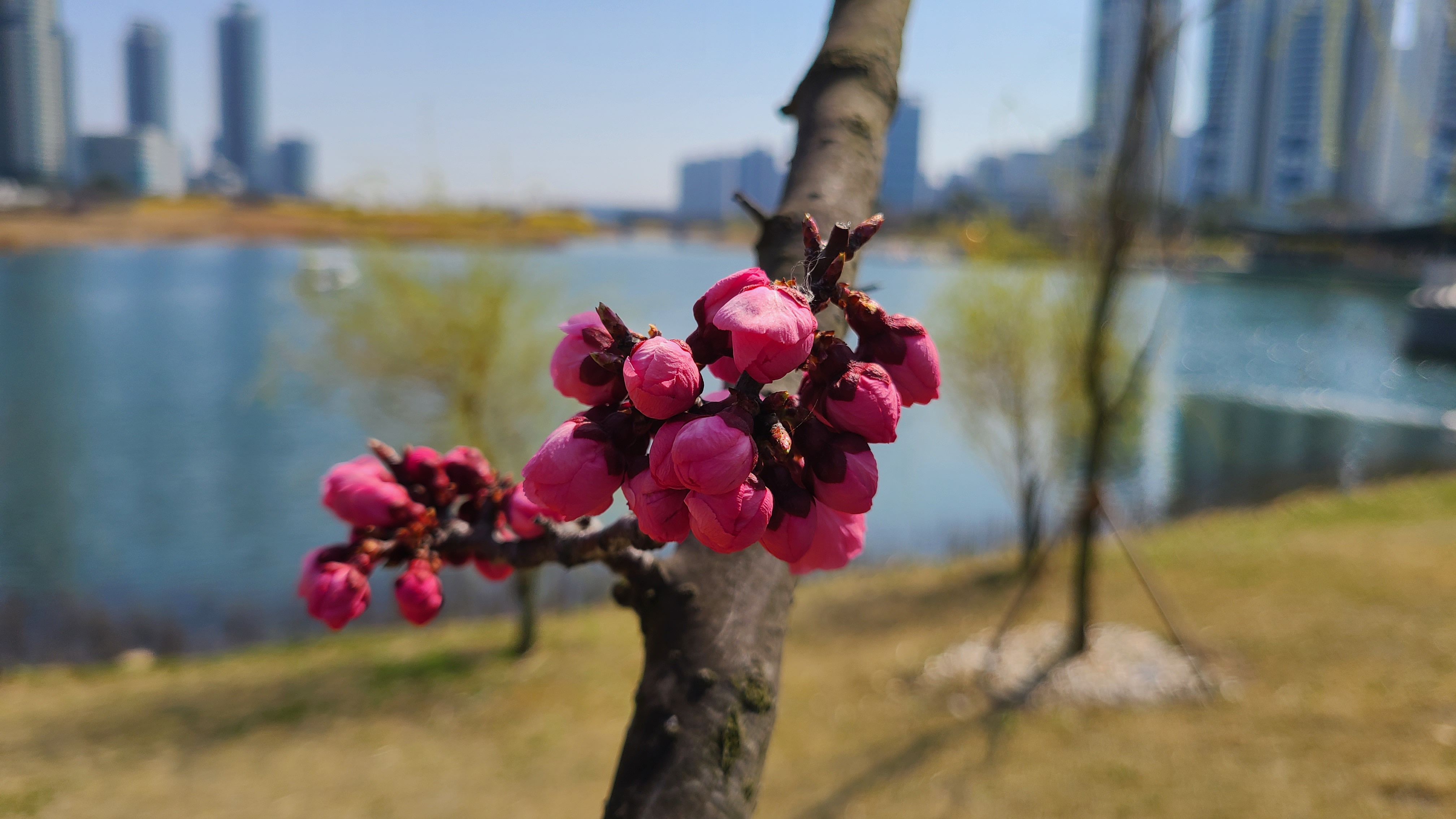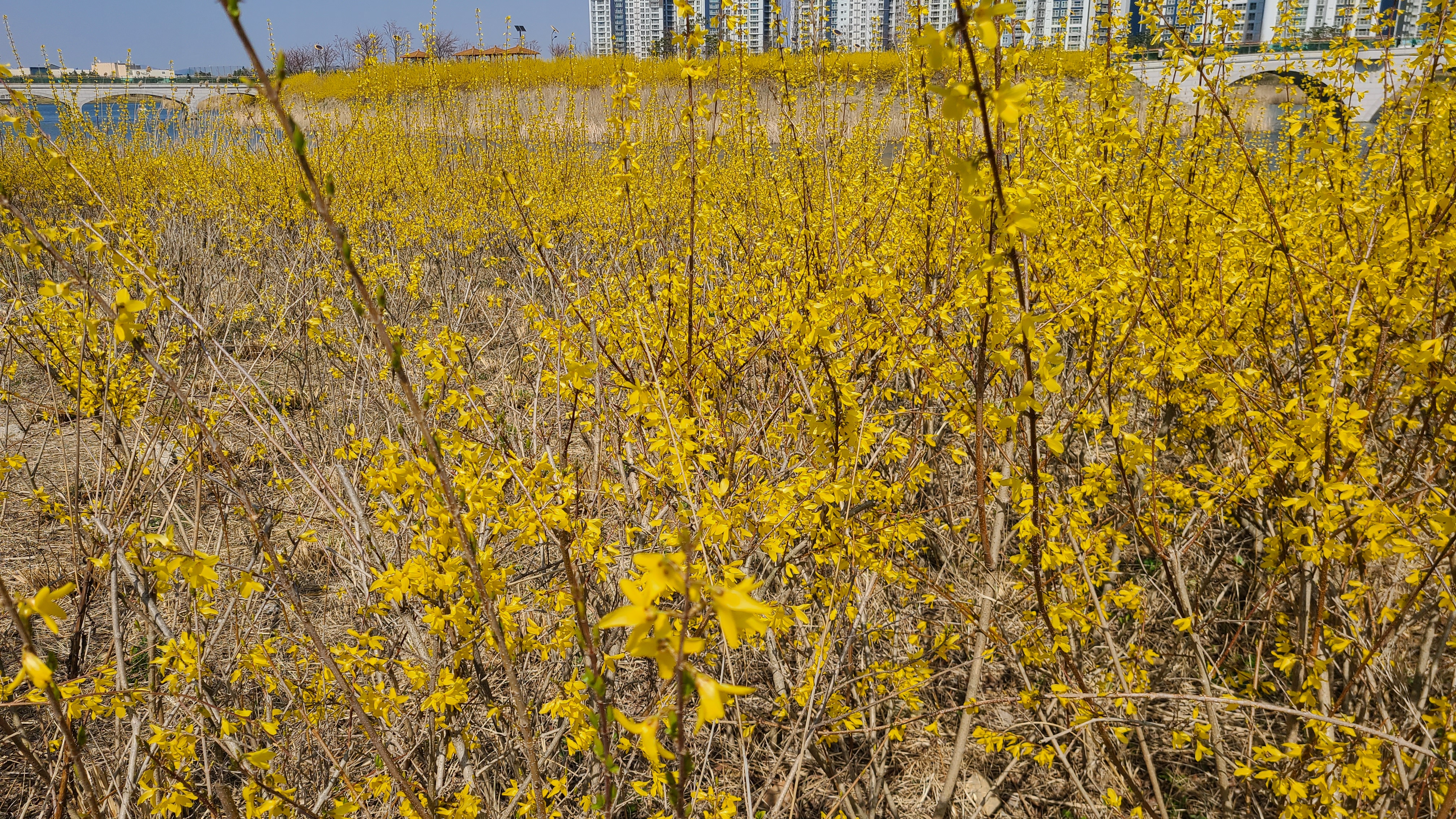 호수는 완연한 봄이다. 호수둘레와 주변에 노란 개나리가 활짝피었고 주변의 벚나무엔 꽃망울이 맺히고