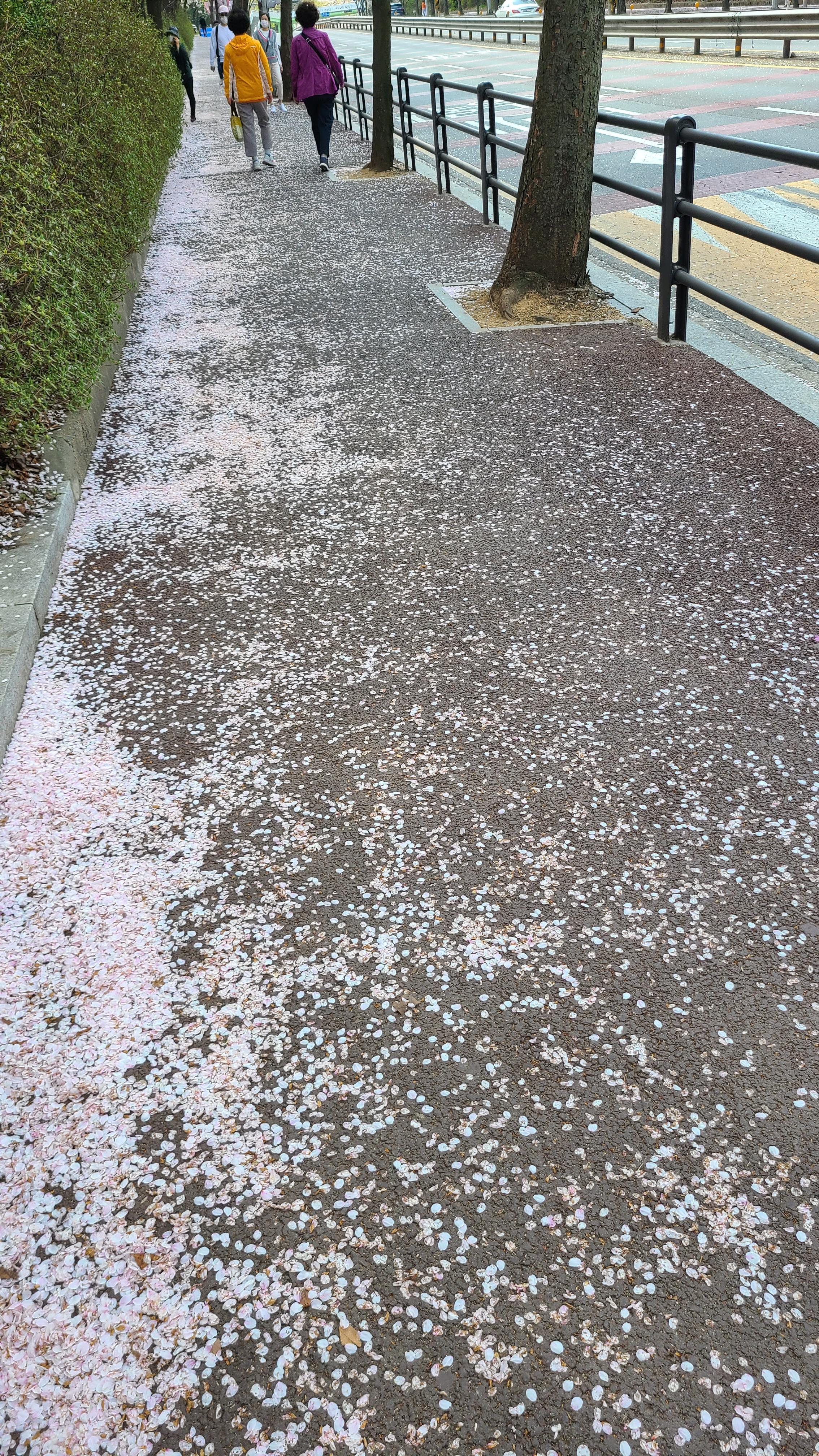 그야말로 바람이 불어 나무에서 꽃잎이 하얗게 떨어지는 꽃비이다.