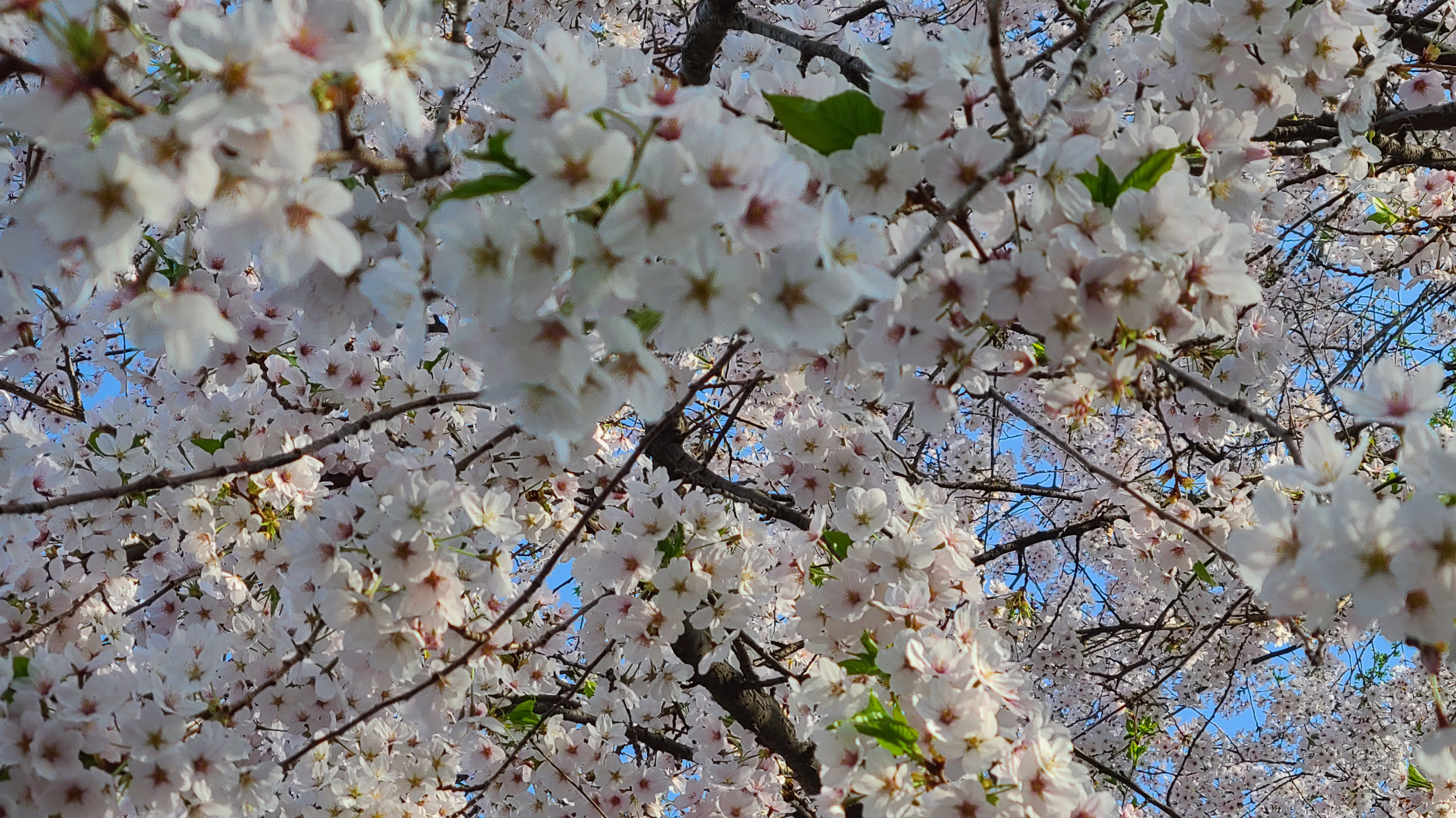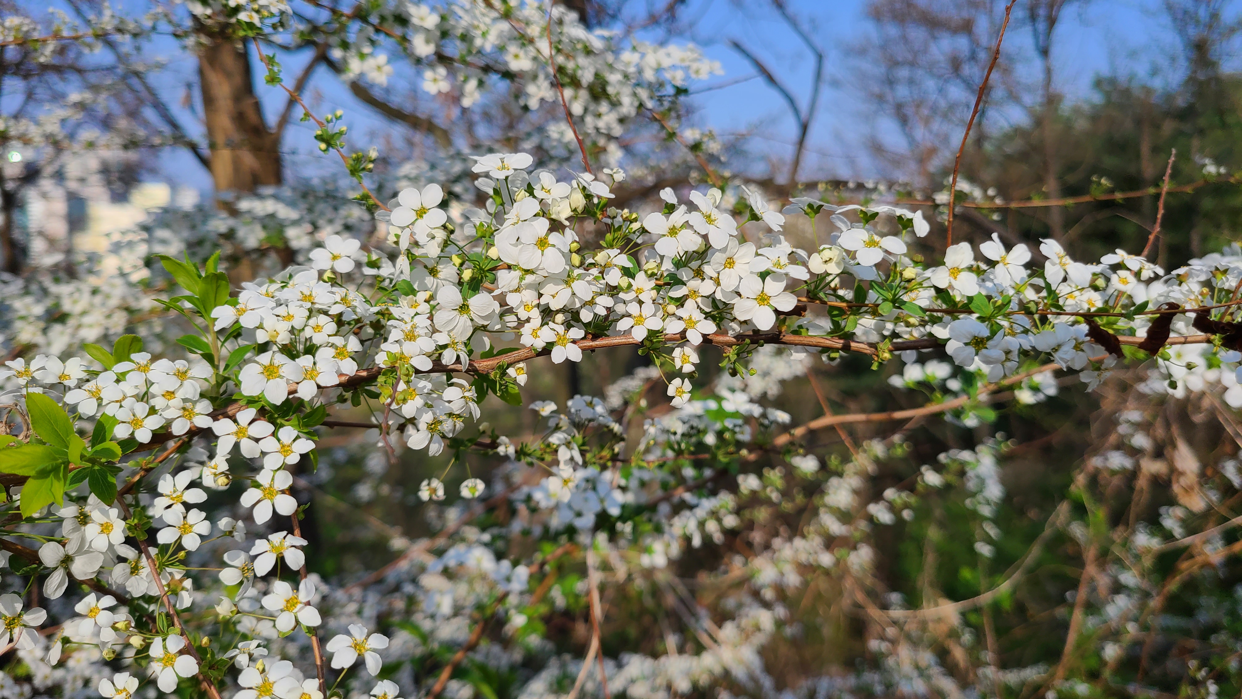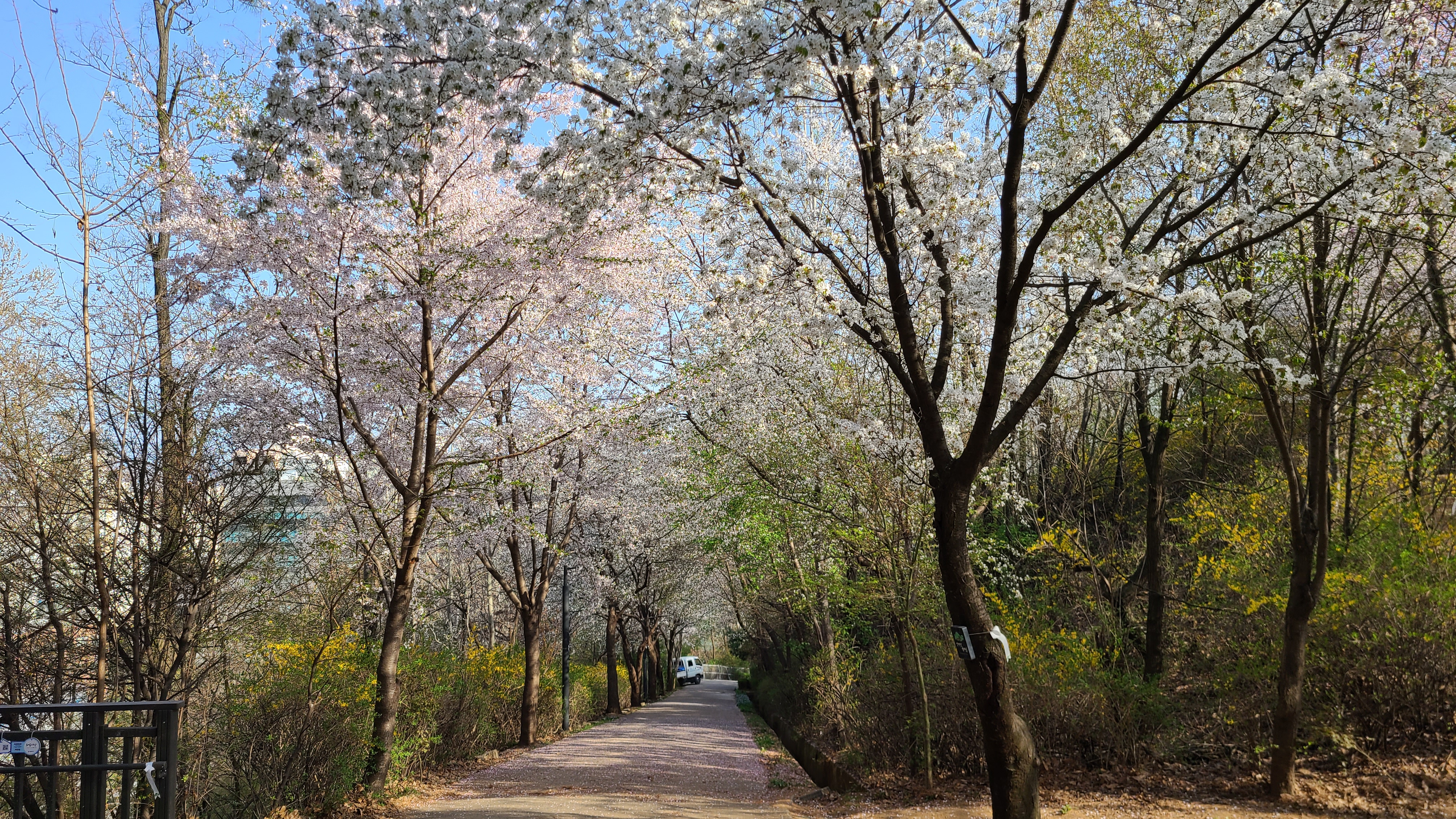 그야말로 바람이 불어 나무에서 꽃잎이 하얗게 떨어지는 꽃비이다.