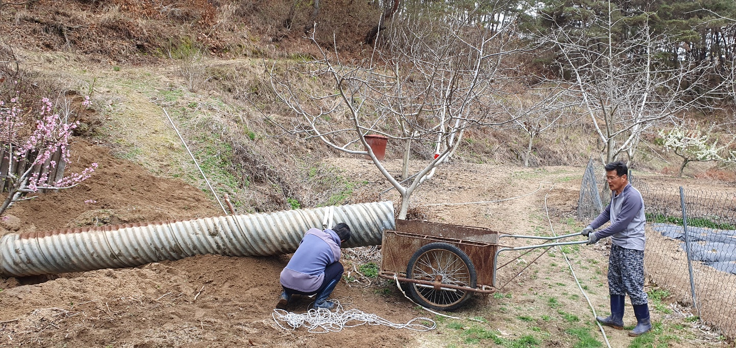 주된 공사는 산소앞 도로를 지나는 수로관이 작아 농장 윗쪽의 직경80여센티가 되는 주철파이프관을