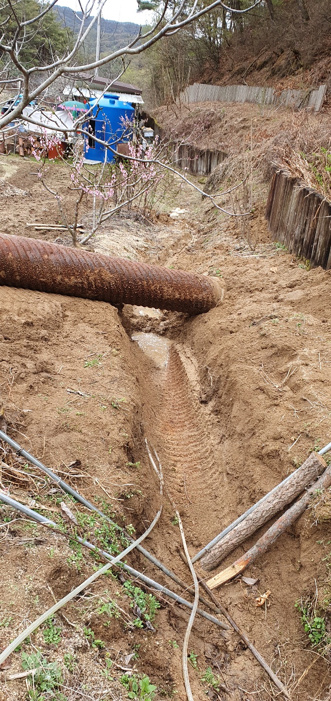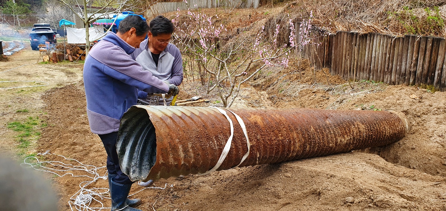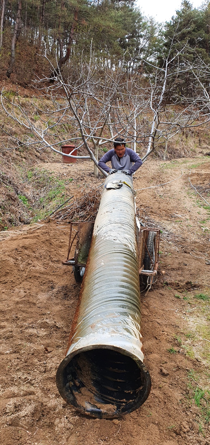 주된 공사는 산소앞 도로를 지나는 수로관이 작아 농장 윗쪽의 직경80여센티가 되는 주철파이프관을