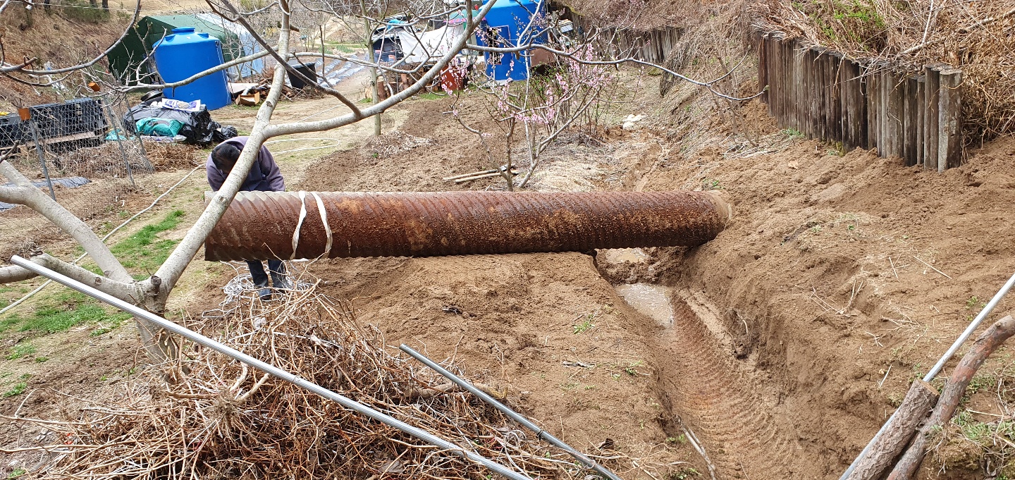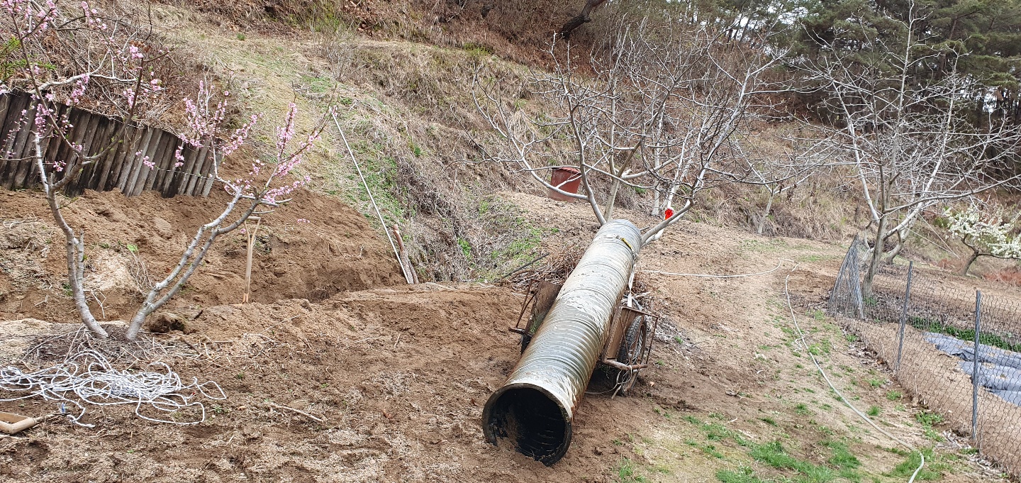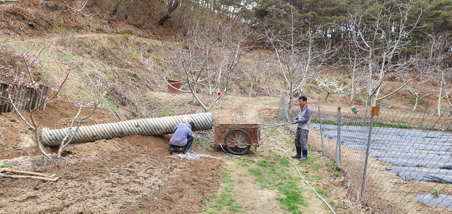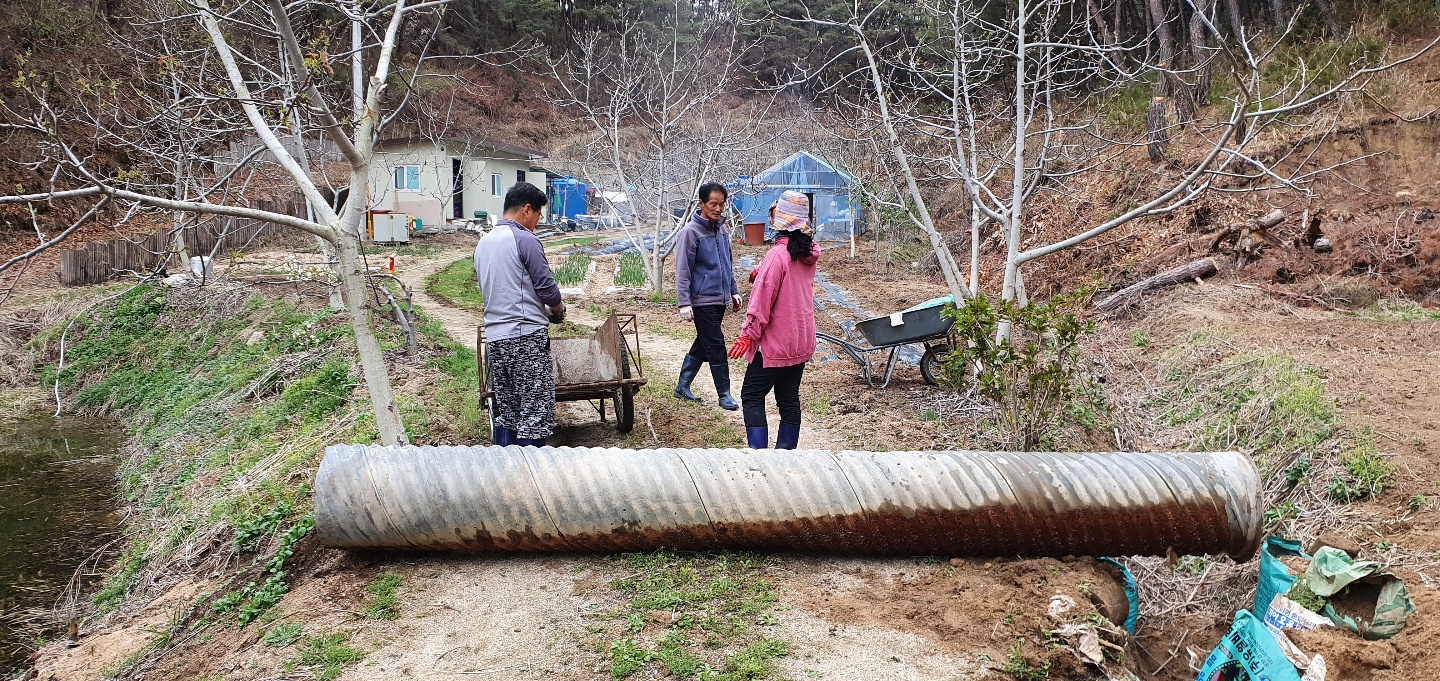 주된 공사는 산소앞 도로를 지나는 수로관이 작아 농장 윗쪽의 직경80여센티가 되는 주철파이프관을