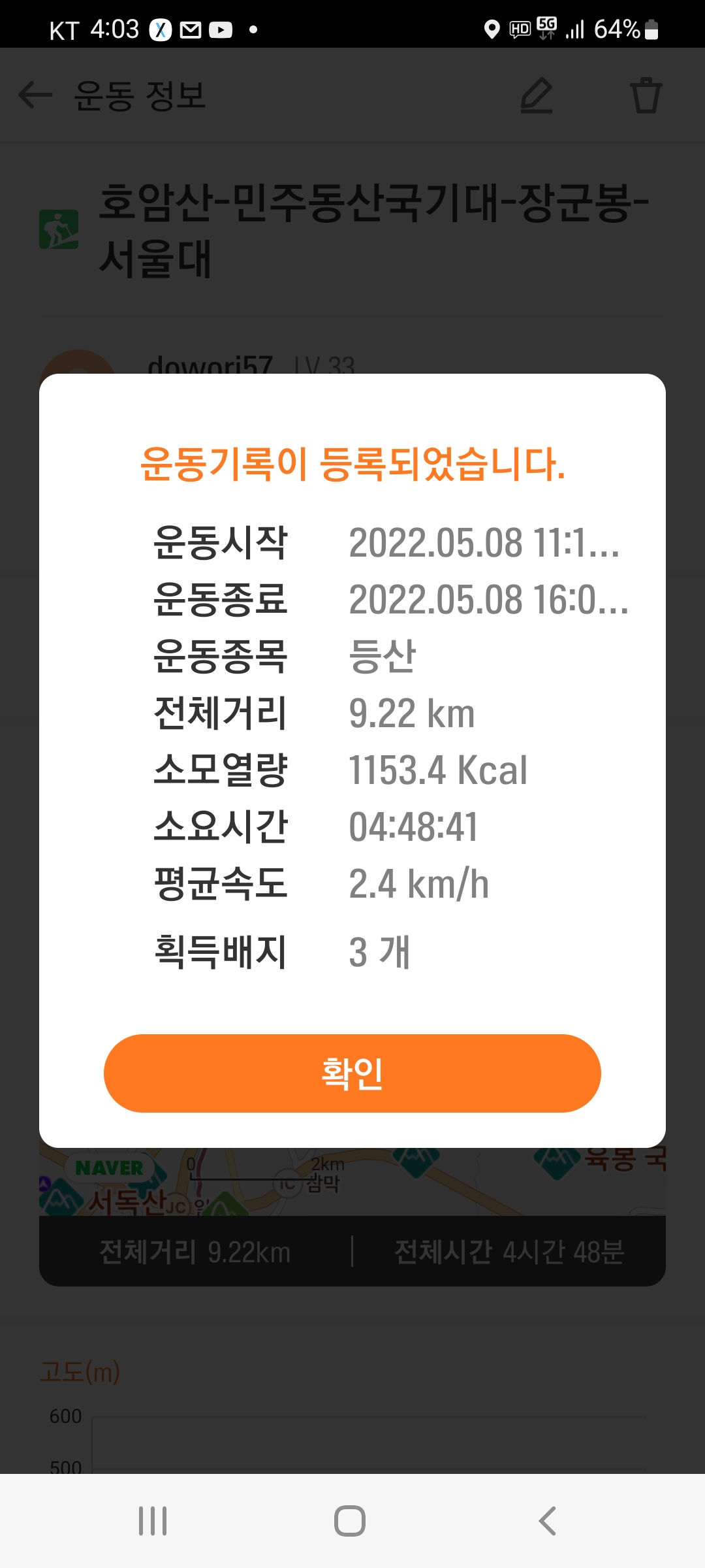 다시 운행재개하여 호암산에 올라 빵과 커피를 먹으려는데  이런,커피를 챙겨오지 못했으니 뜨거운 물에 빵을 먹는다.