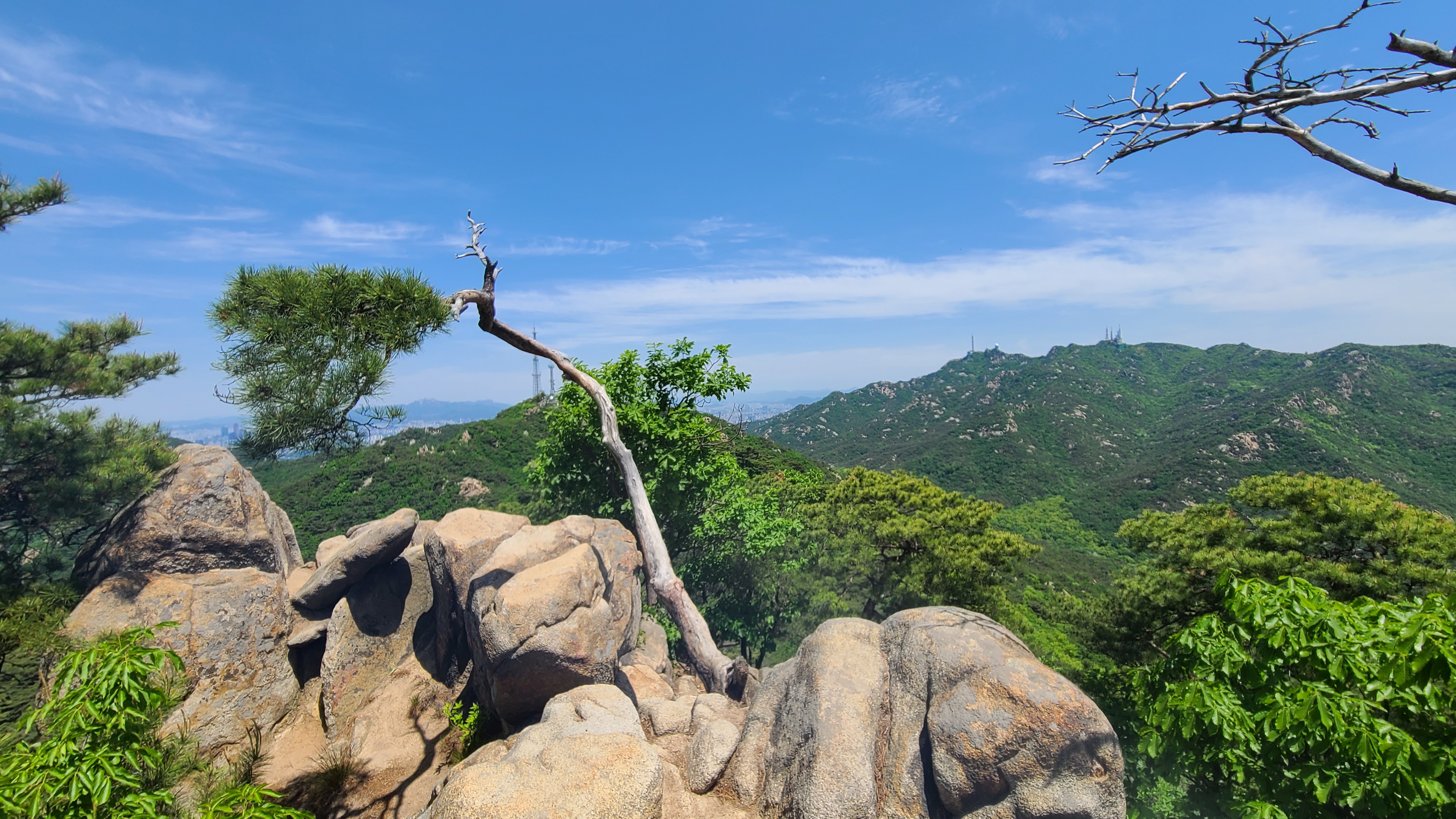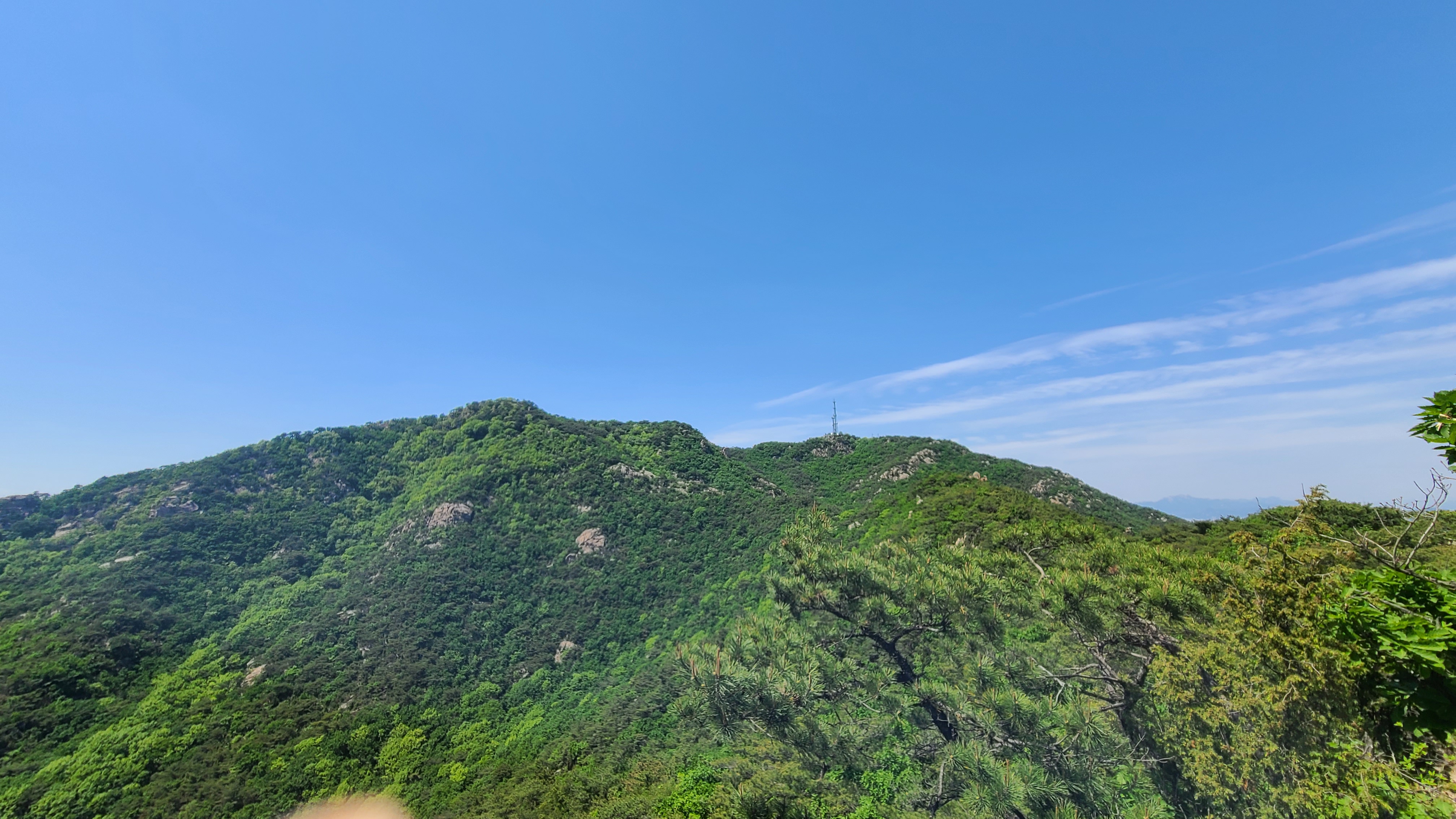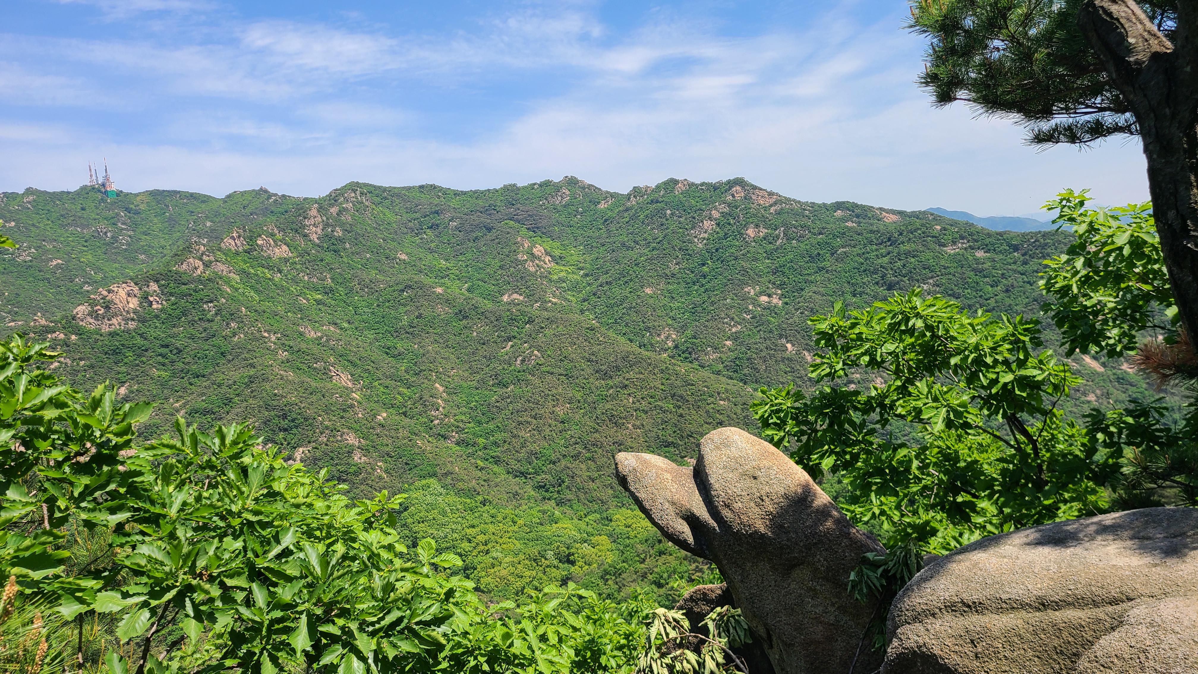 잠시 호흡을 고르고 전진하다가 송신소방향의 암벽길을 내려 송신소에 올라 잠시 휴식을 취한다.