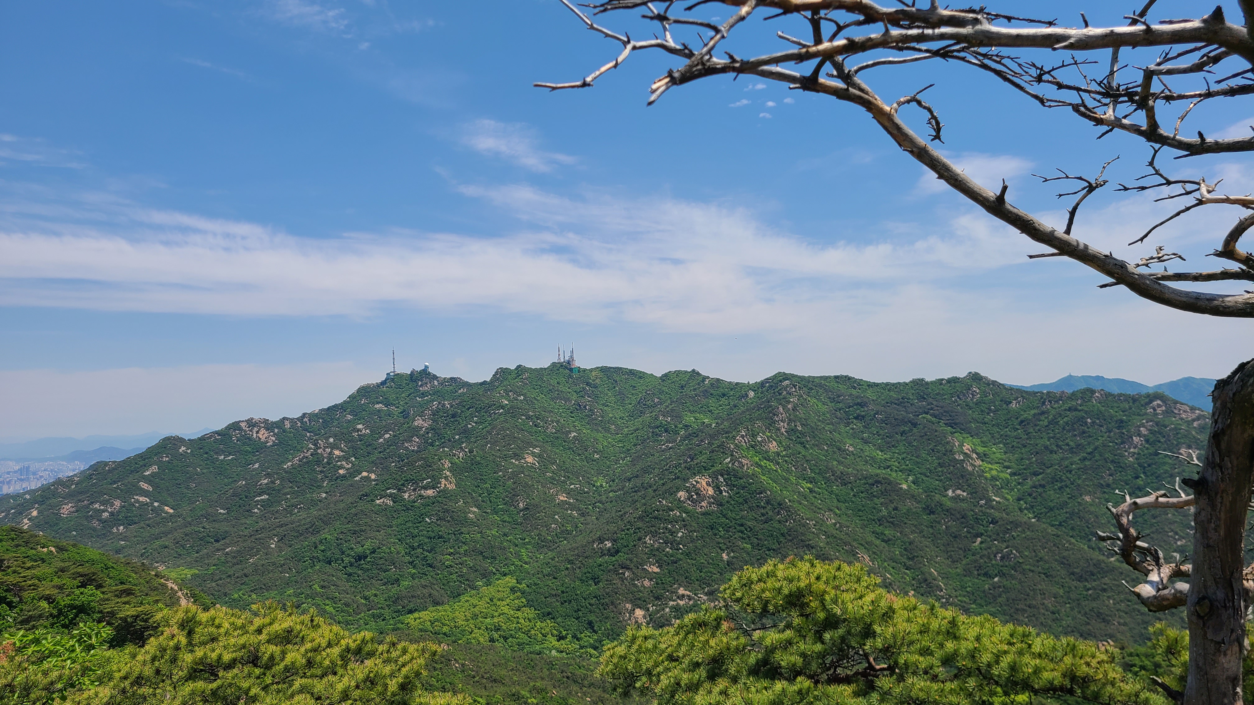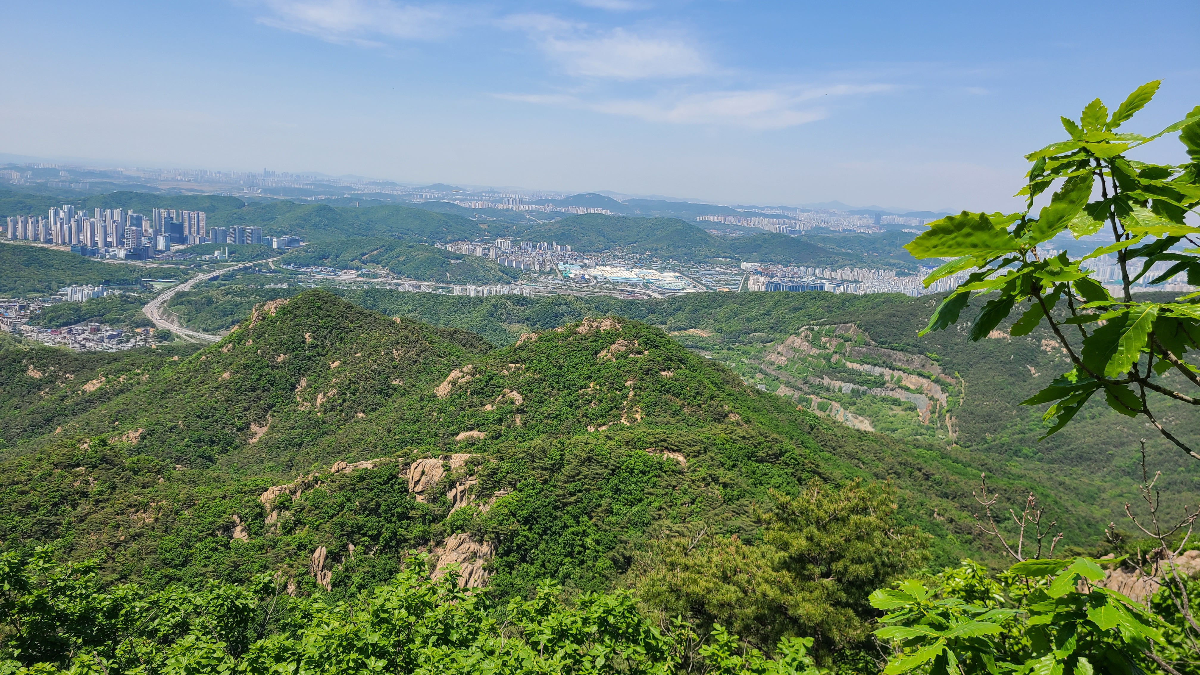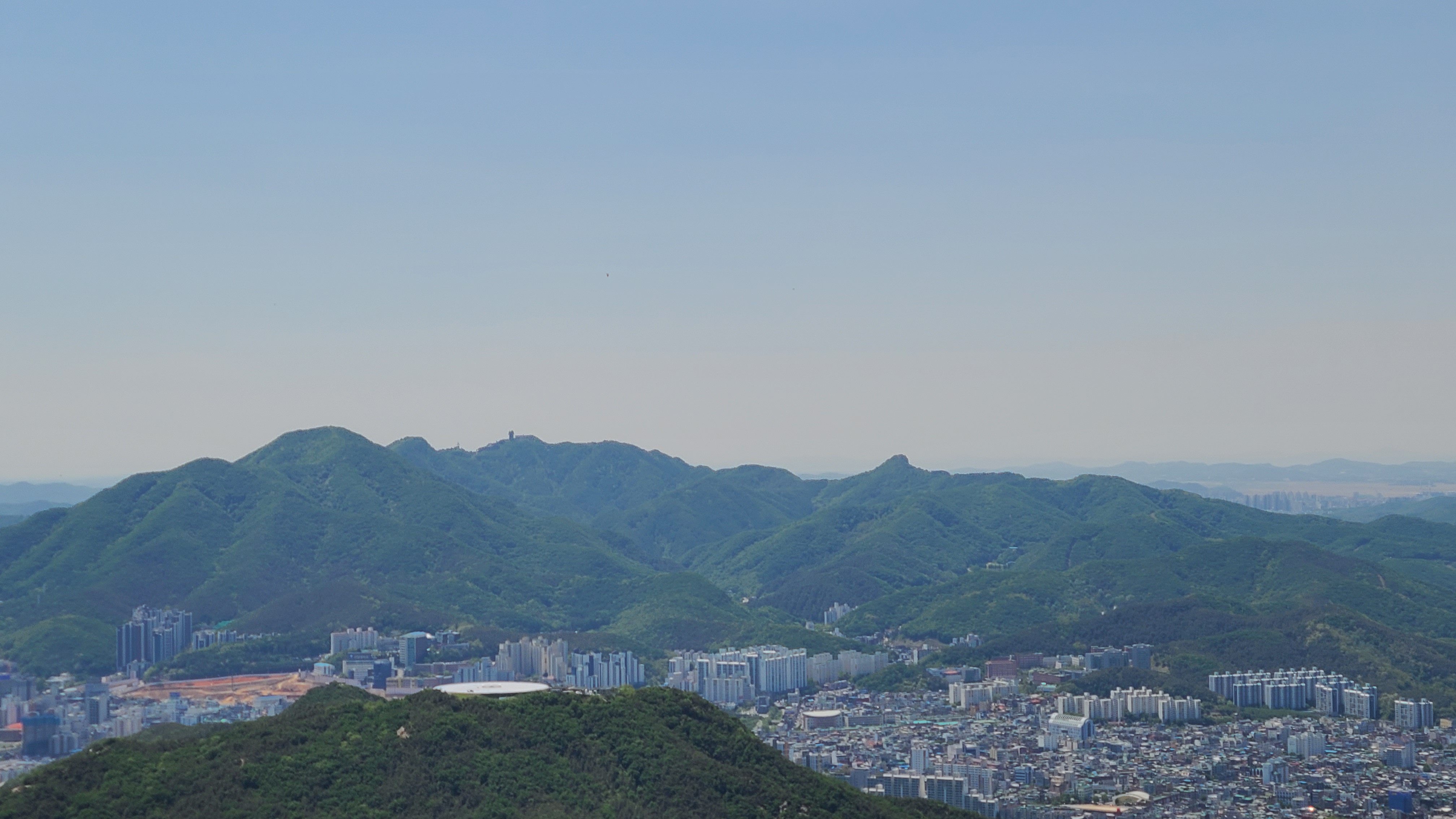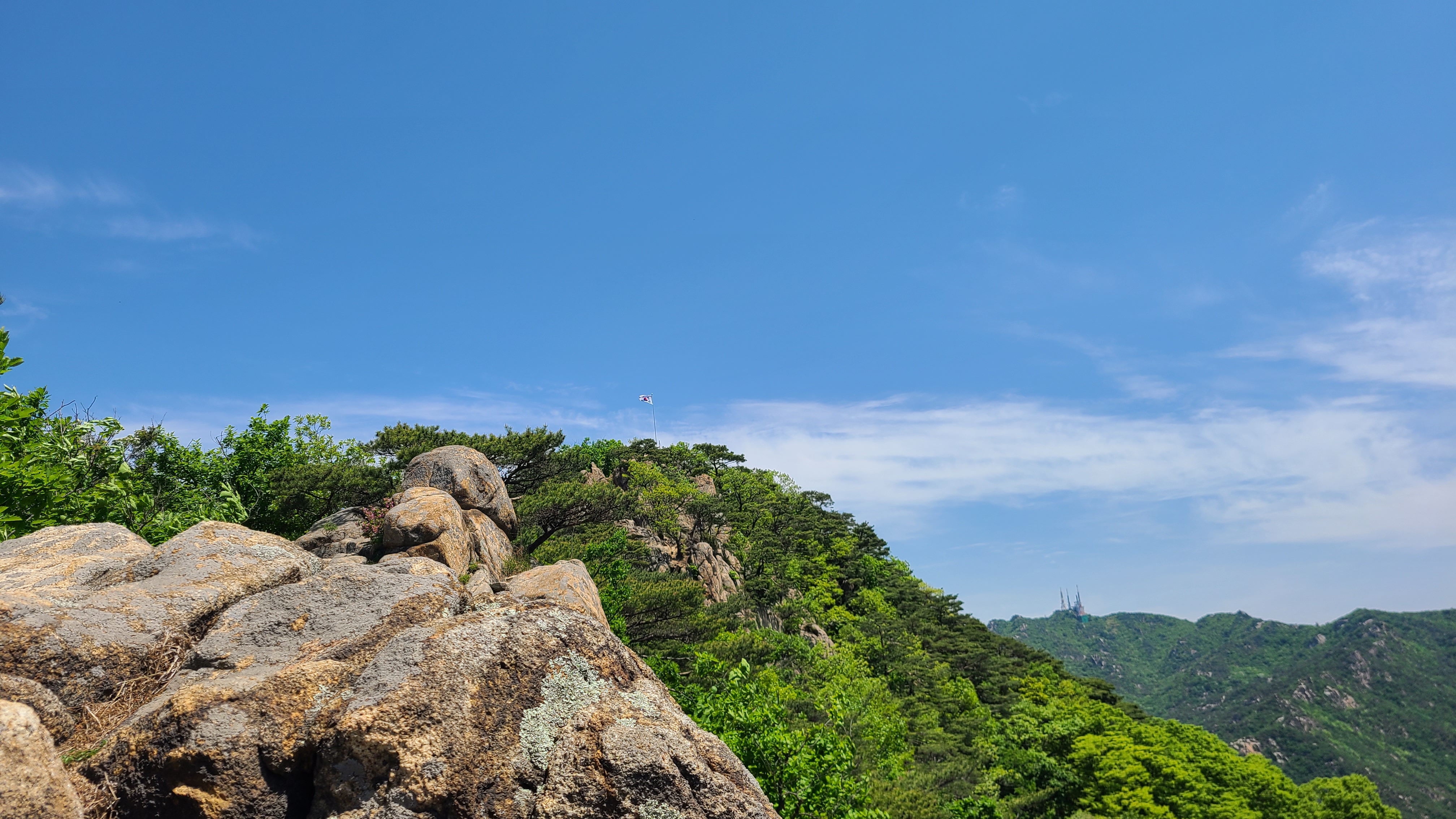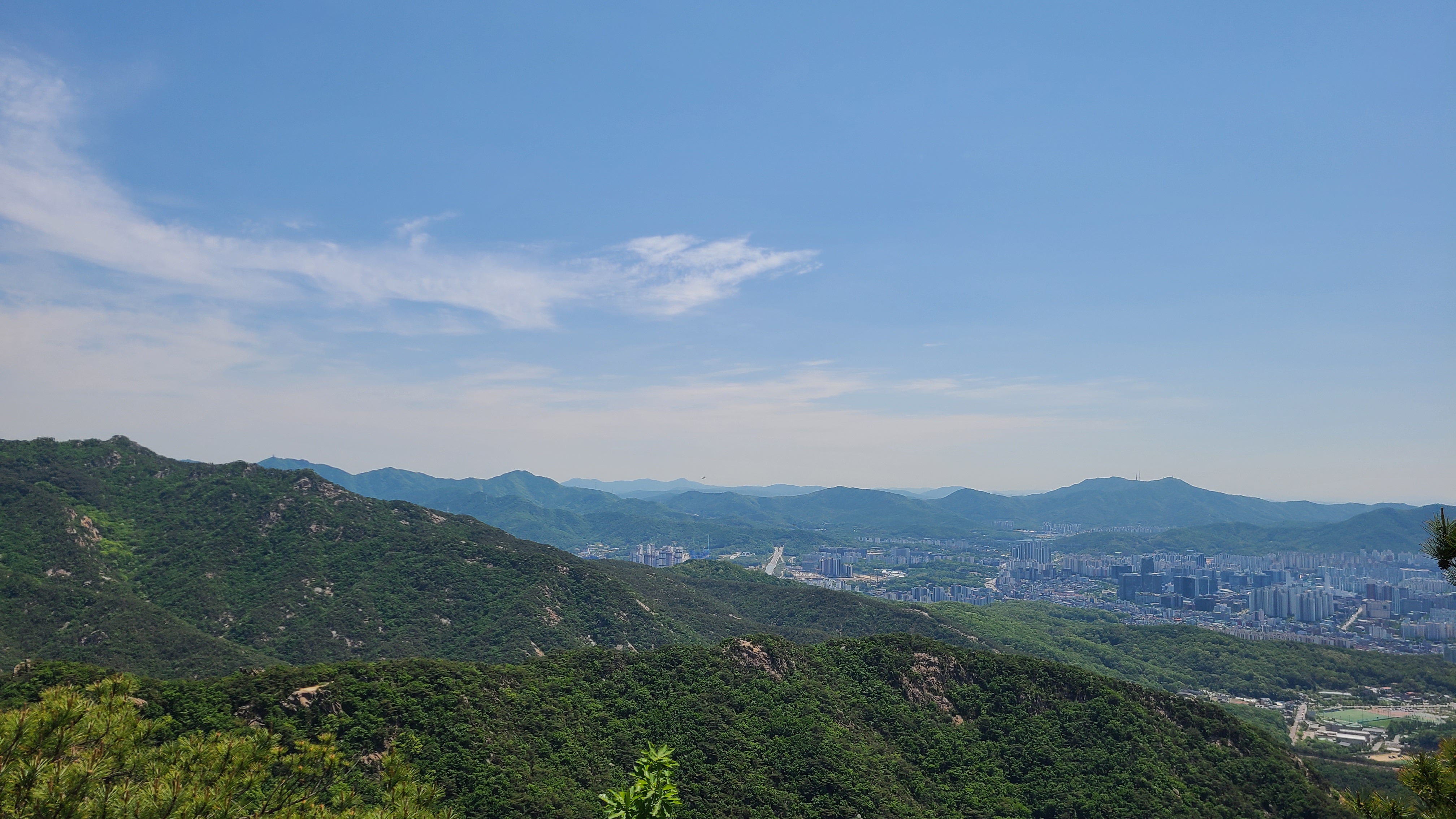 국기봉에 서니 화창한 날씨에 미세먼지가 없어 안양.의왕일대가 선명하게 바라보이고 수리산의 능선과
