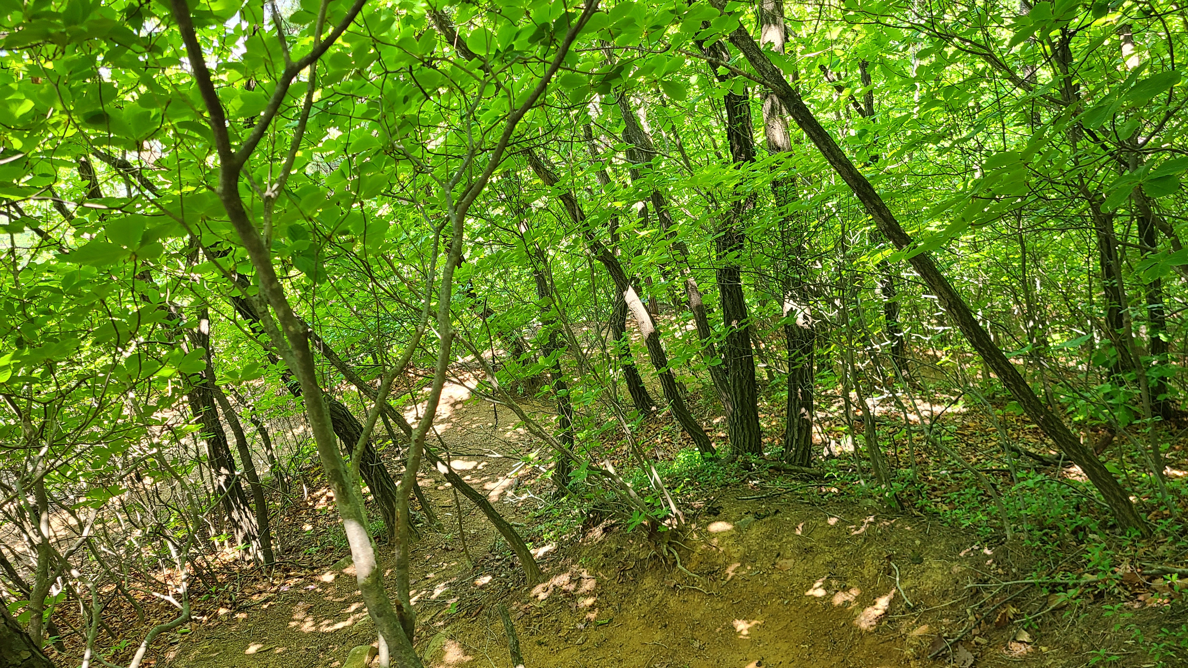 능선길을 걷다가 유원지 상단을 둘러 형성된 둘레길을 걸어 염불암을 오르는 도로와 마주친다.