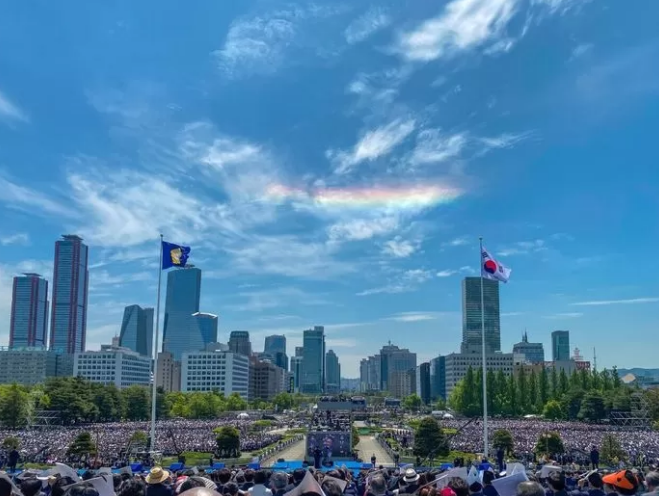 취임식이 있는날 하늘에 무지개가 떠 좋은일이 있을 것 같은 예감이 든다는 카톡이 친구들로부터