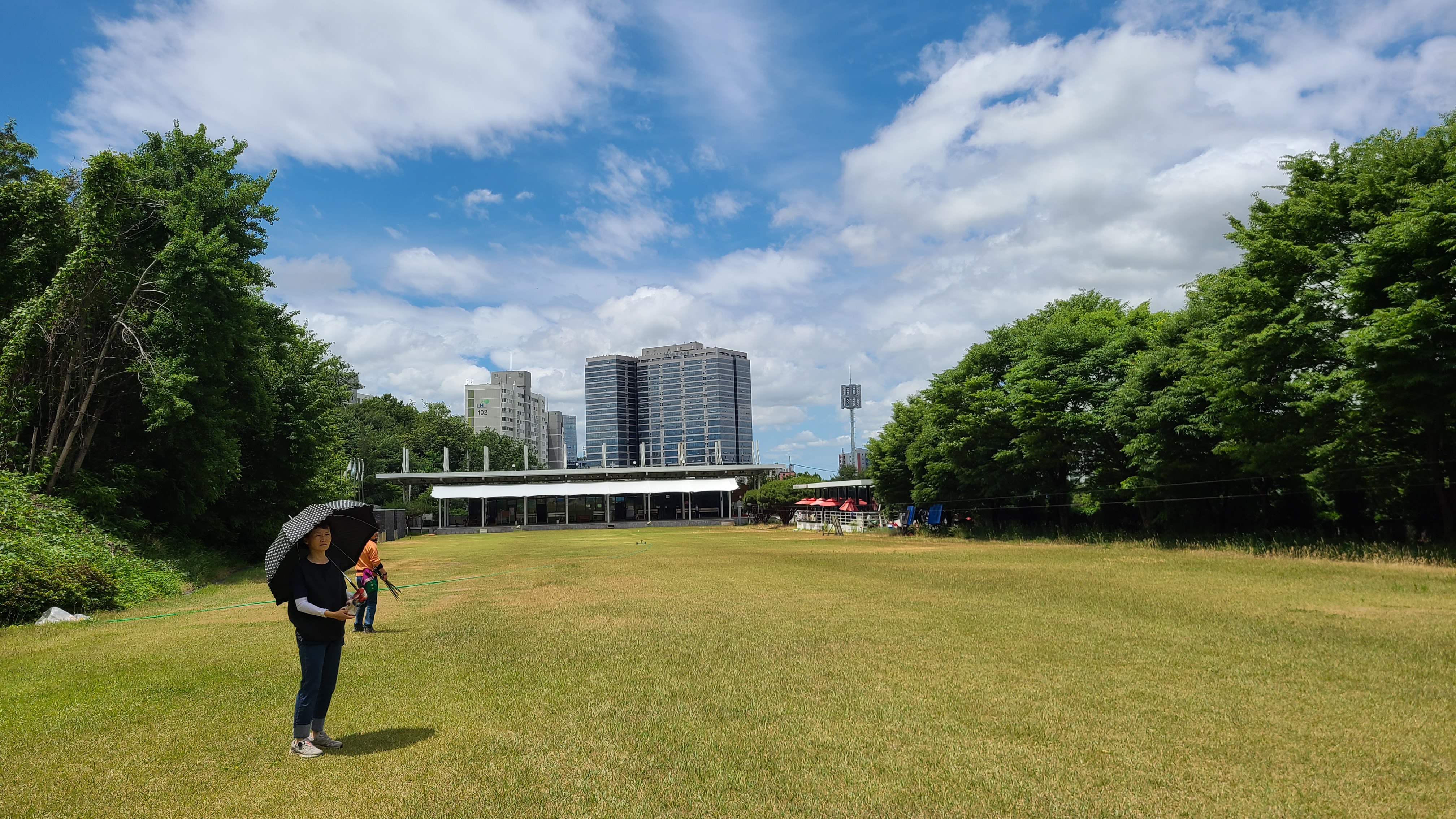 가뭄에 메말라 스프링쿨러로 물을 준 잔듸는 비를 맞아 더욱 푸르러간다.