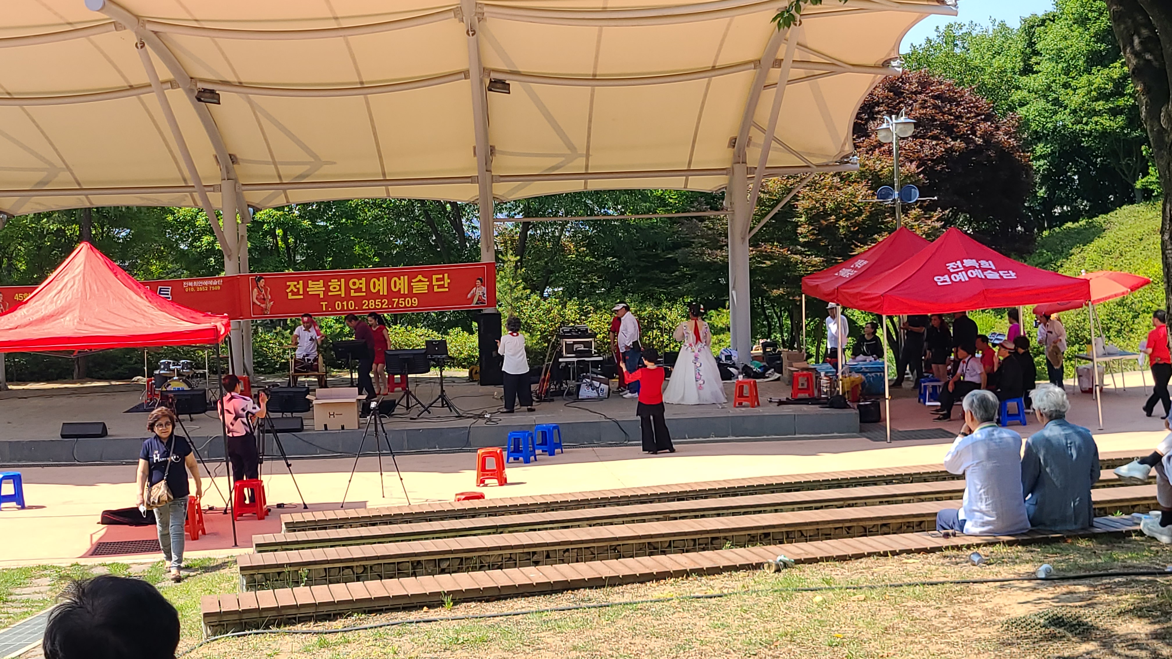 아래쪽에 음악소리가 들려 내려가보니 활터과녁 뒤편을 지난 무대에  예술단공연이 열리고있다.
