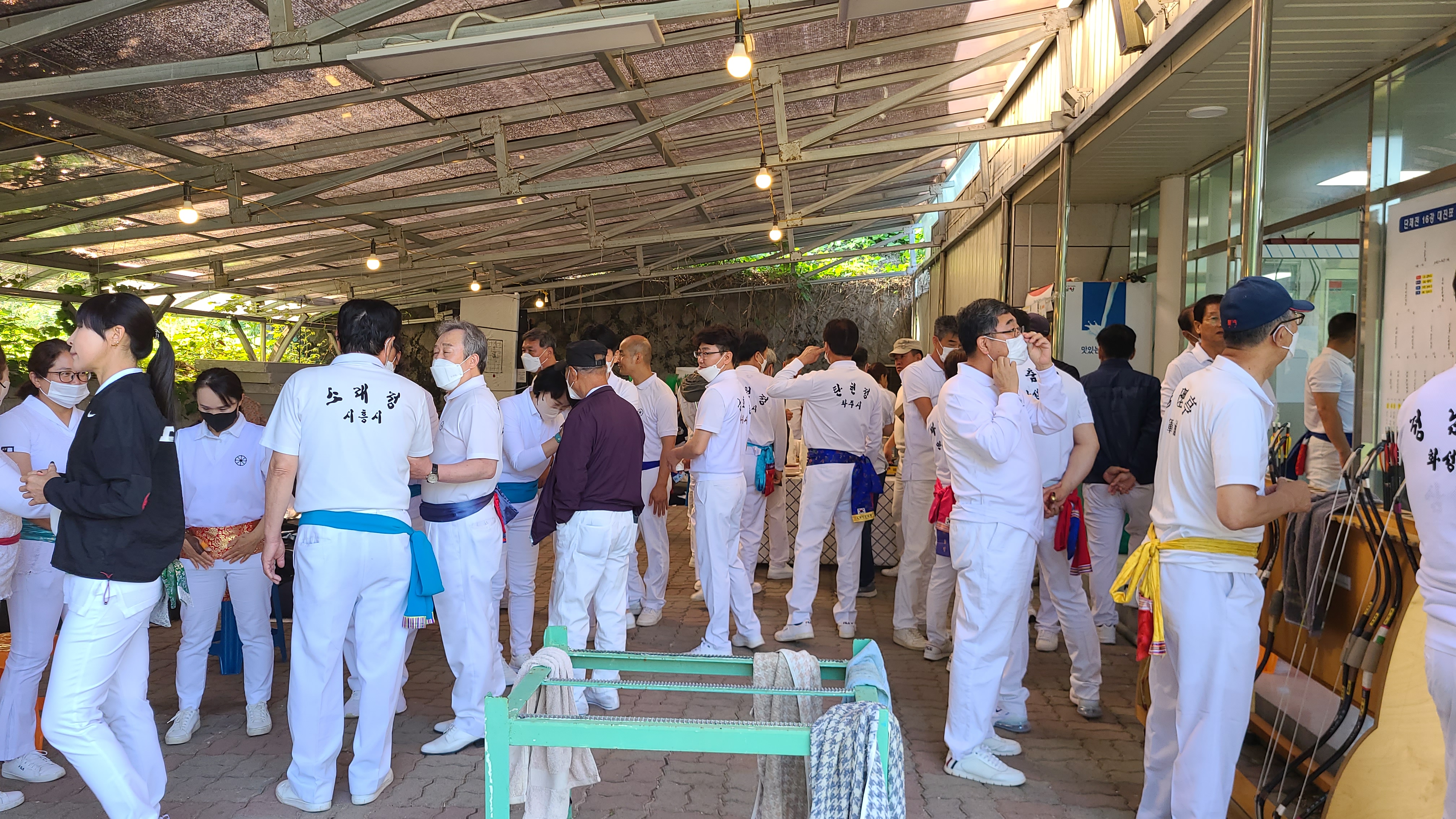 산자락의 국궁장은 하얀복장의 선수들로붐빈다.