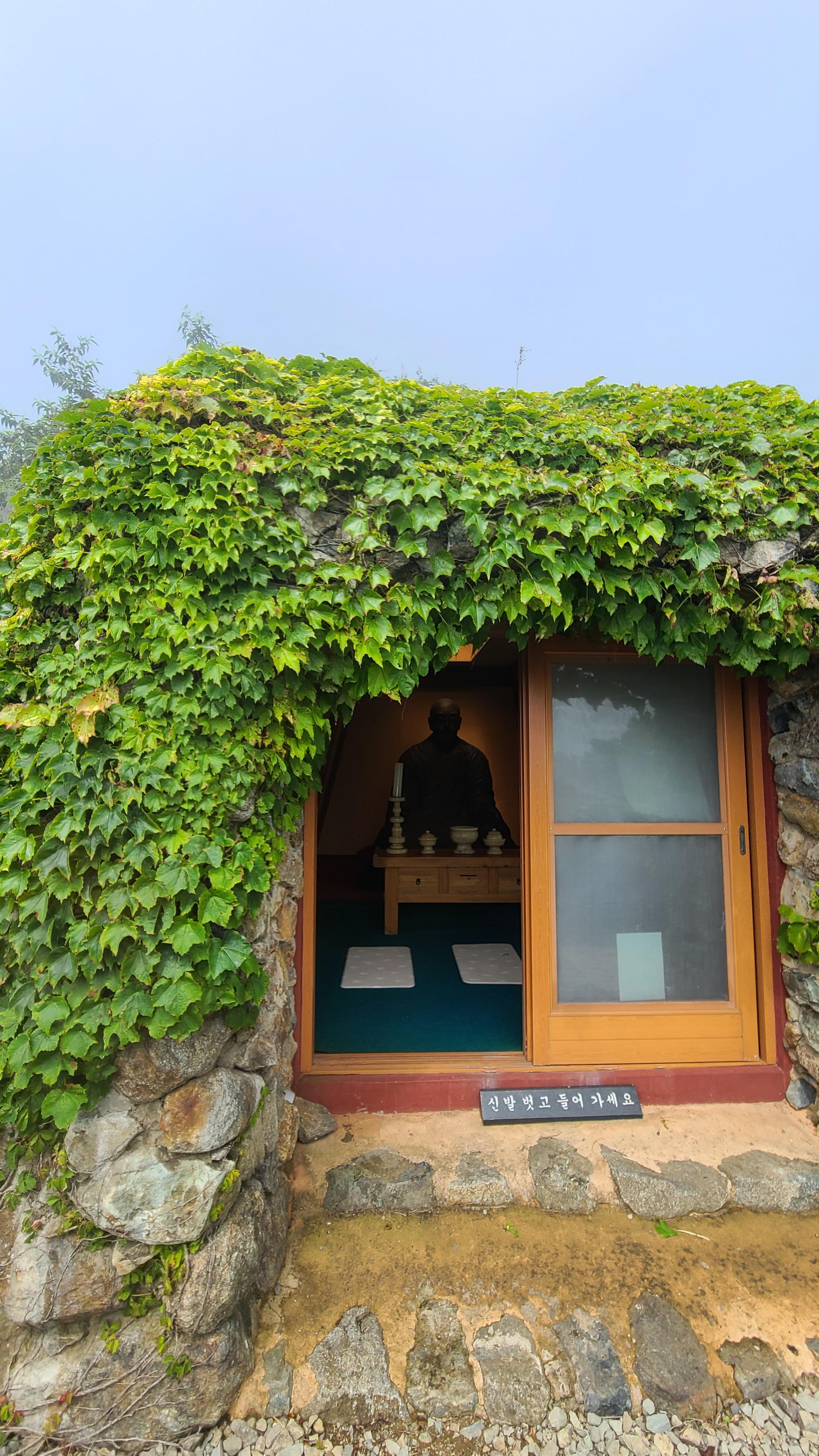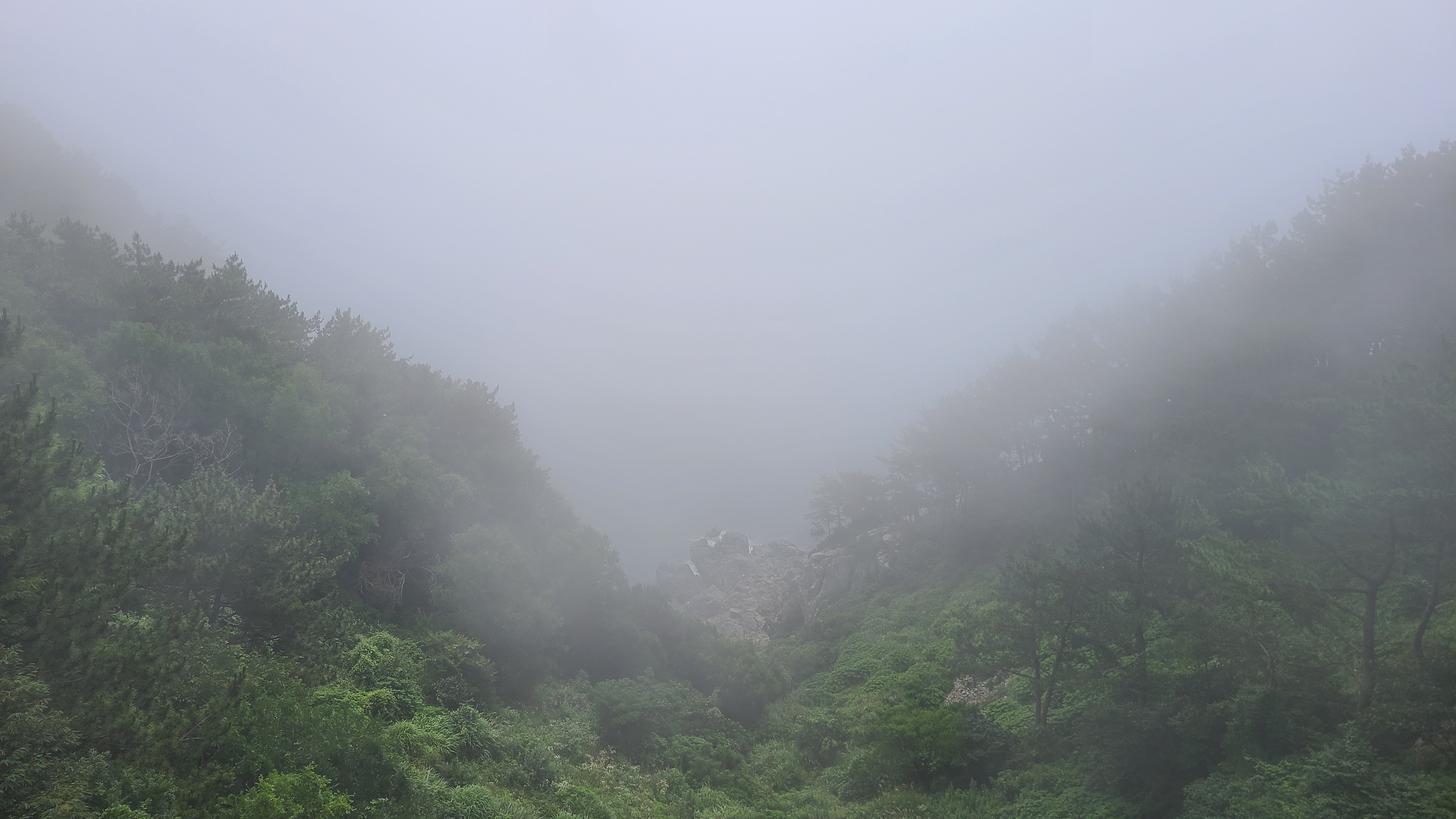 사명대사토굴을 둘러보고는 보덕암을 내려와 암자에서 흐르는 물로 목을 축이며 용머리해변을 바라보나 안개로 전혀