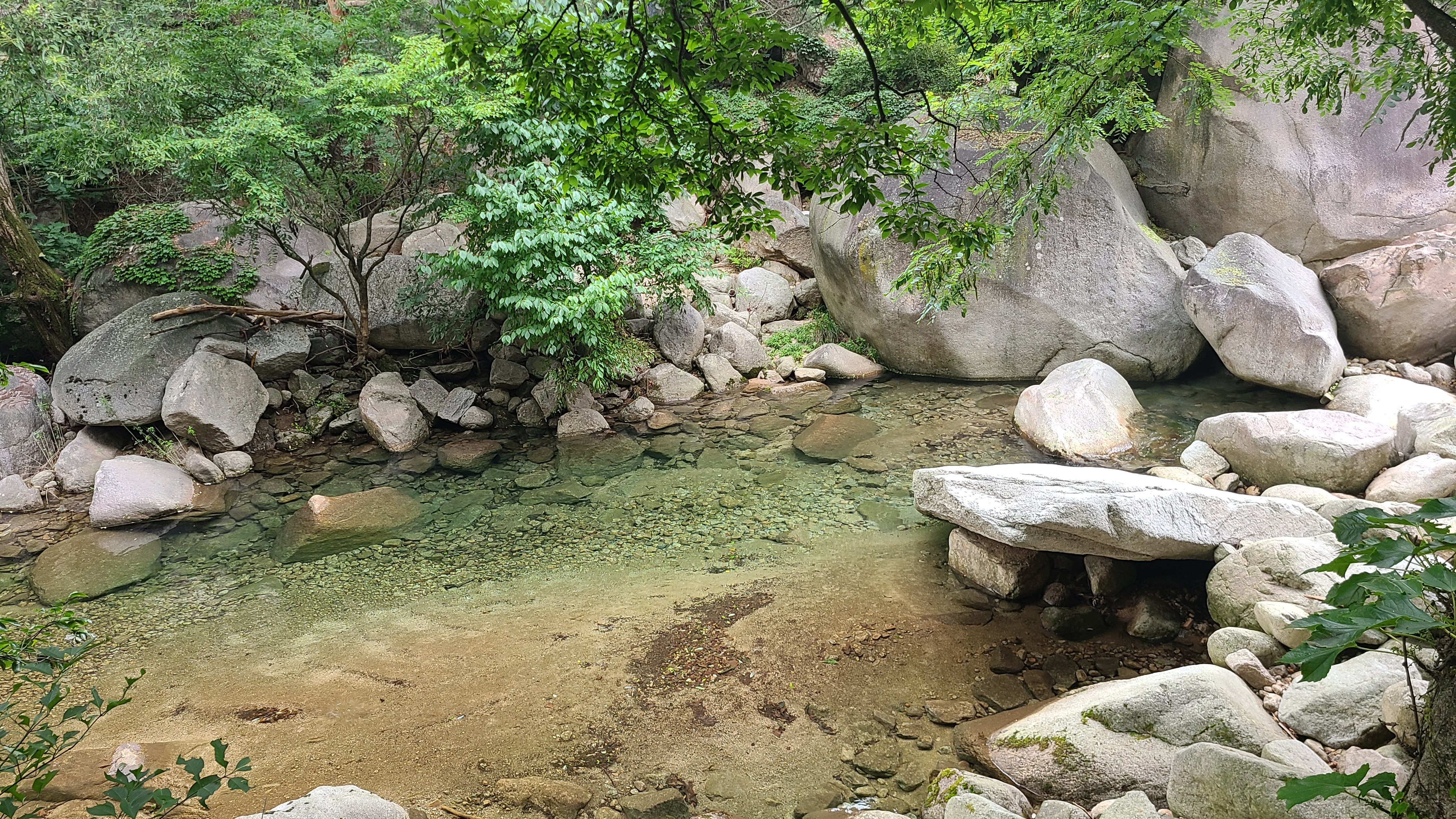 어느순간 계곡에 물이 많아지는 지점에서 길을 벗어나 한갓진 곳에서 옷을 벗고 알탕을 한다.