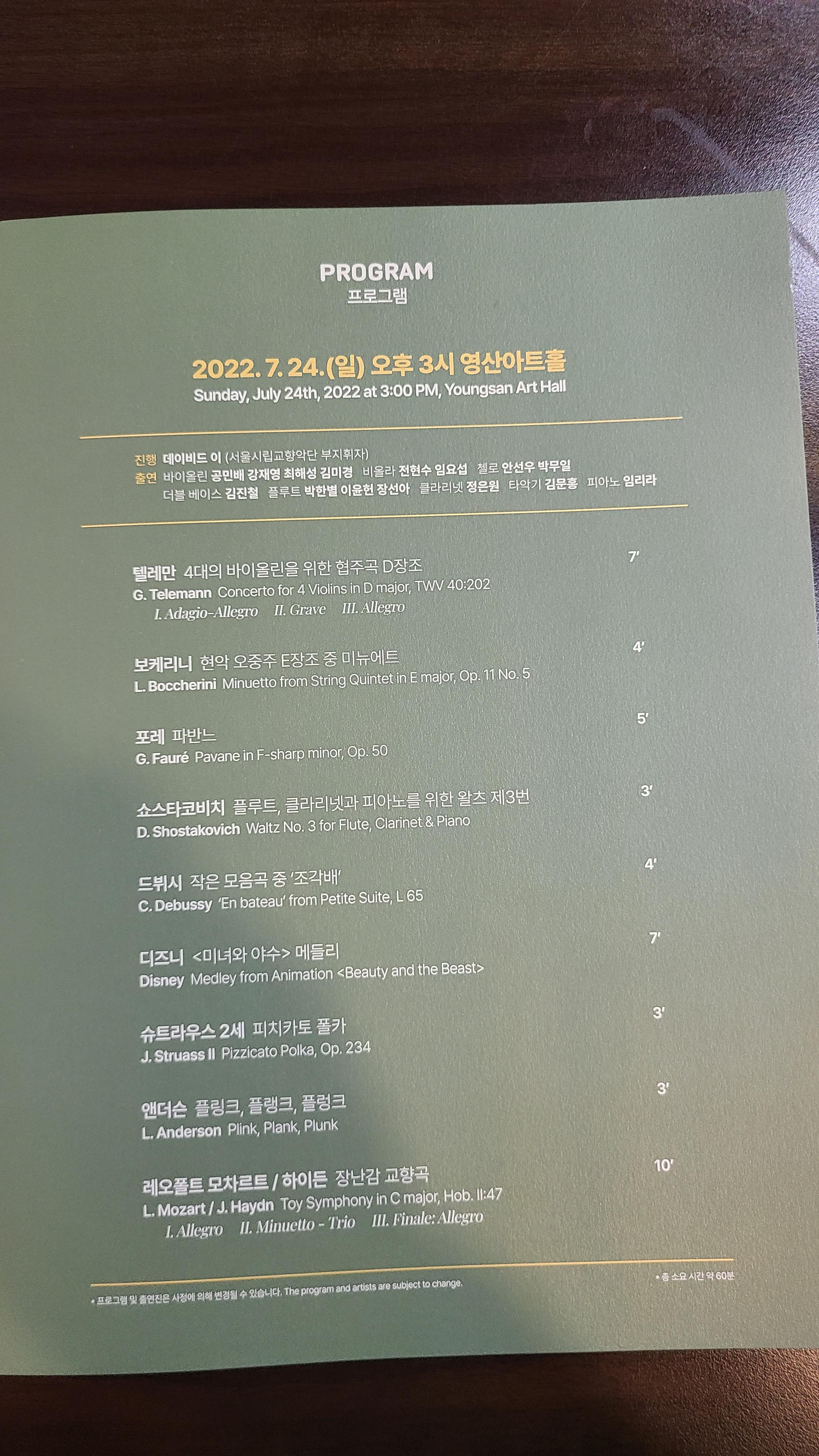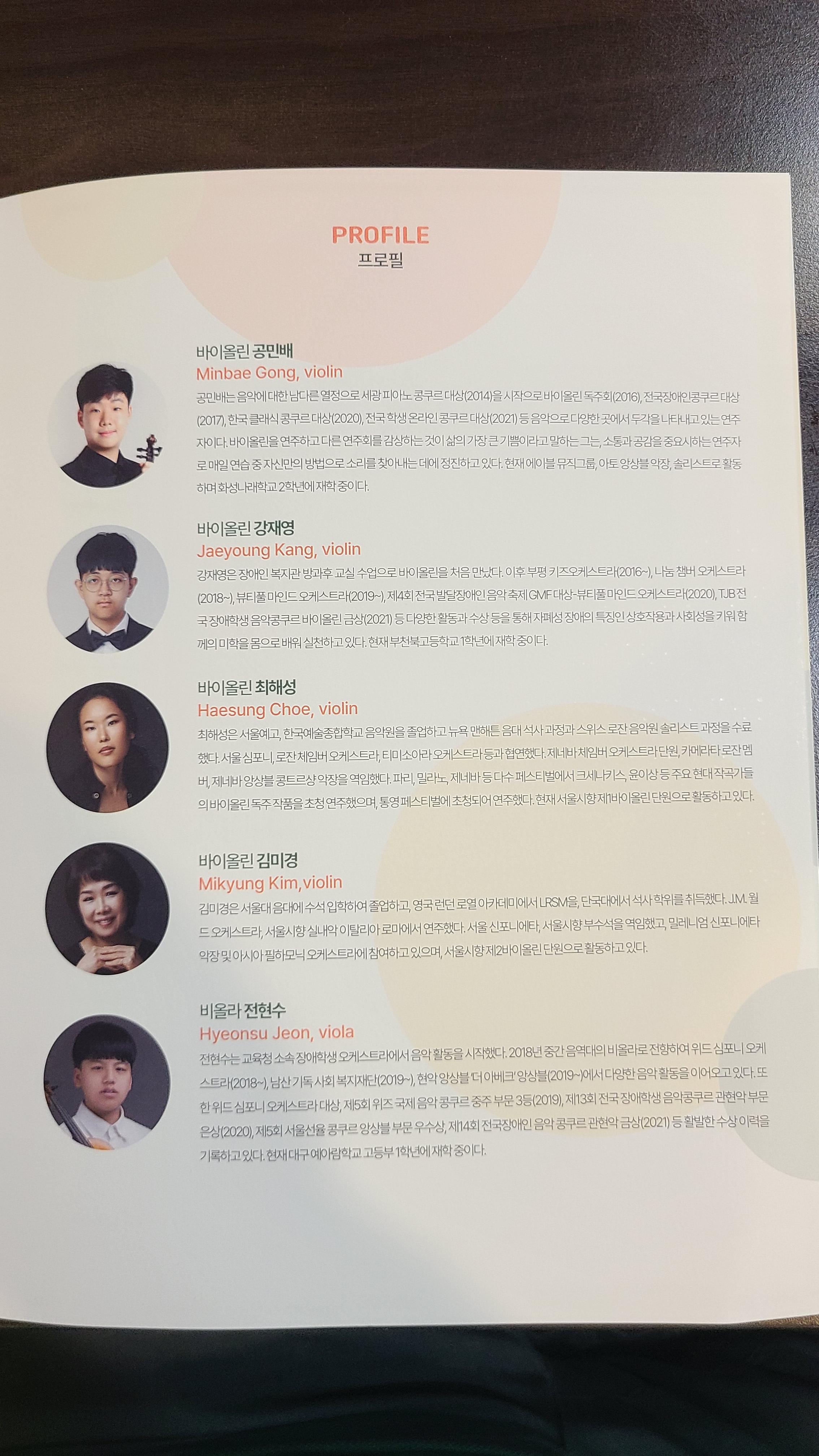 테레만 협주곡,보케리니 미뉴에트등 여러곡을 연주하는데 장애자와 그를 지도하는 시향의 선배들과의 조합이
