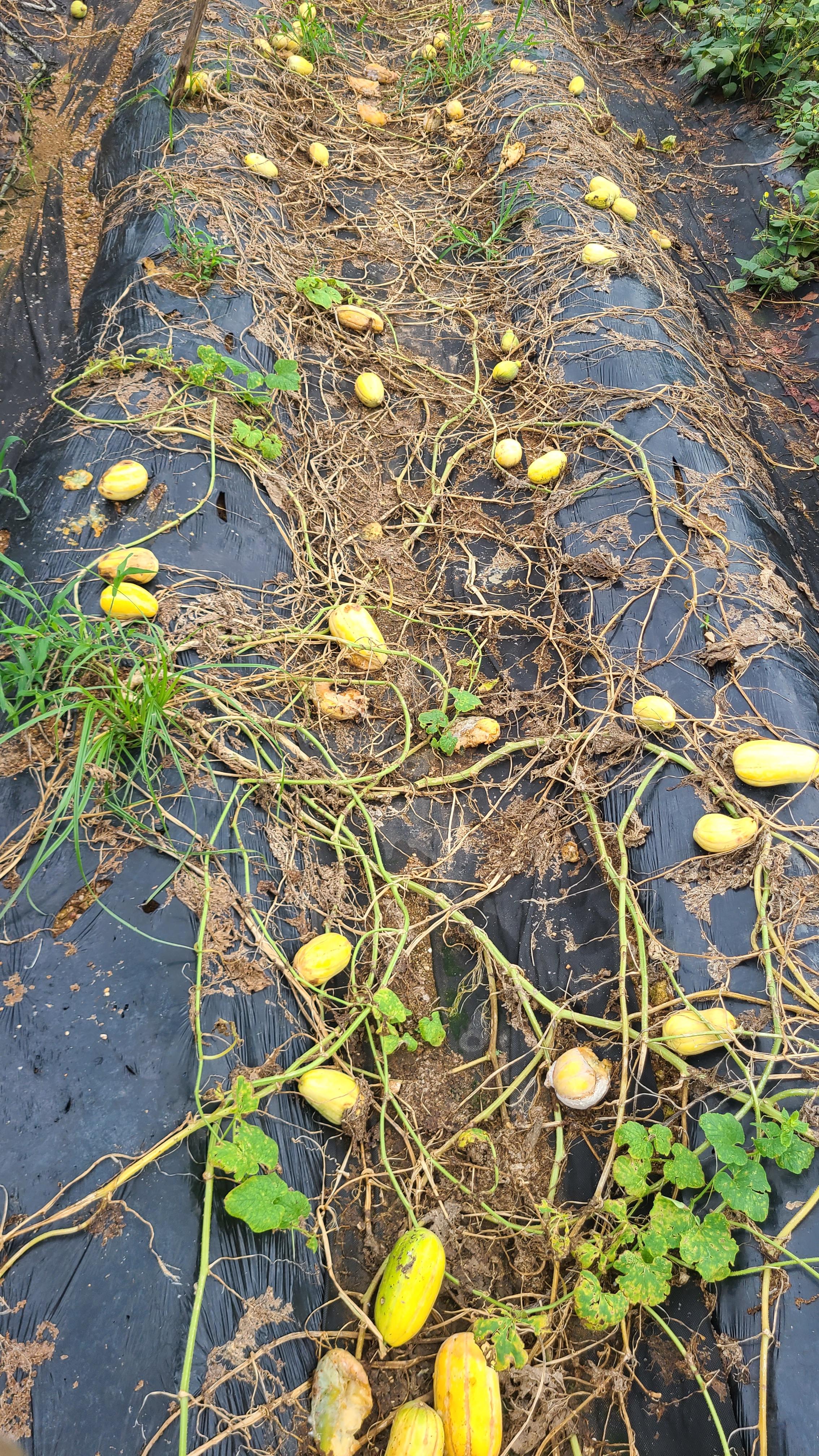 긴 장마에 수해를 입어 짓물러진 참외순을 걷어내고 세워준 지지대와 그물망을 걷어낸다.