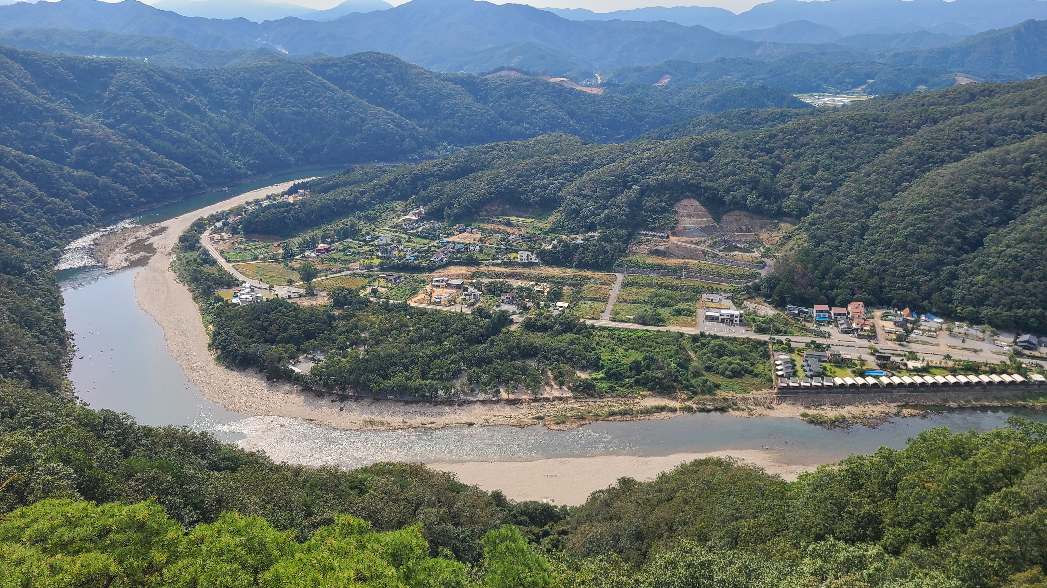 발아래 구비구비 홍천강이 뱀처럼 흐르는 전경과 누렇게 변해가는 들판을 내려다보이고 눈을 들면 산그리메가 첩첩이다.