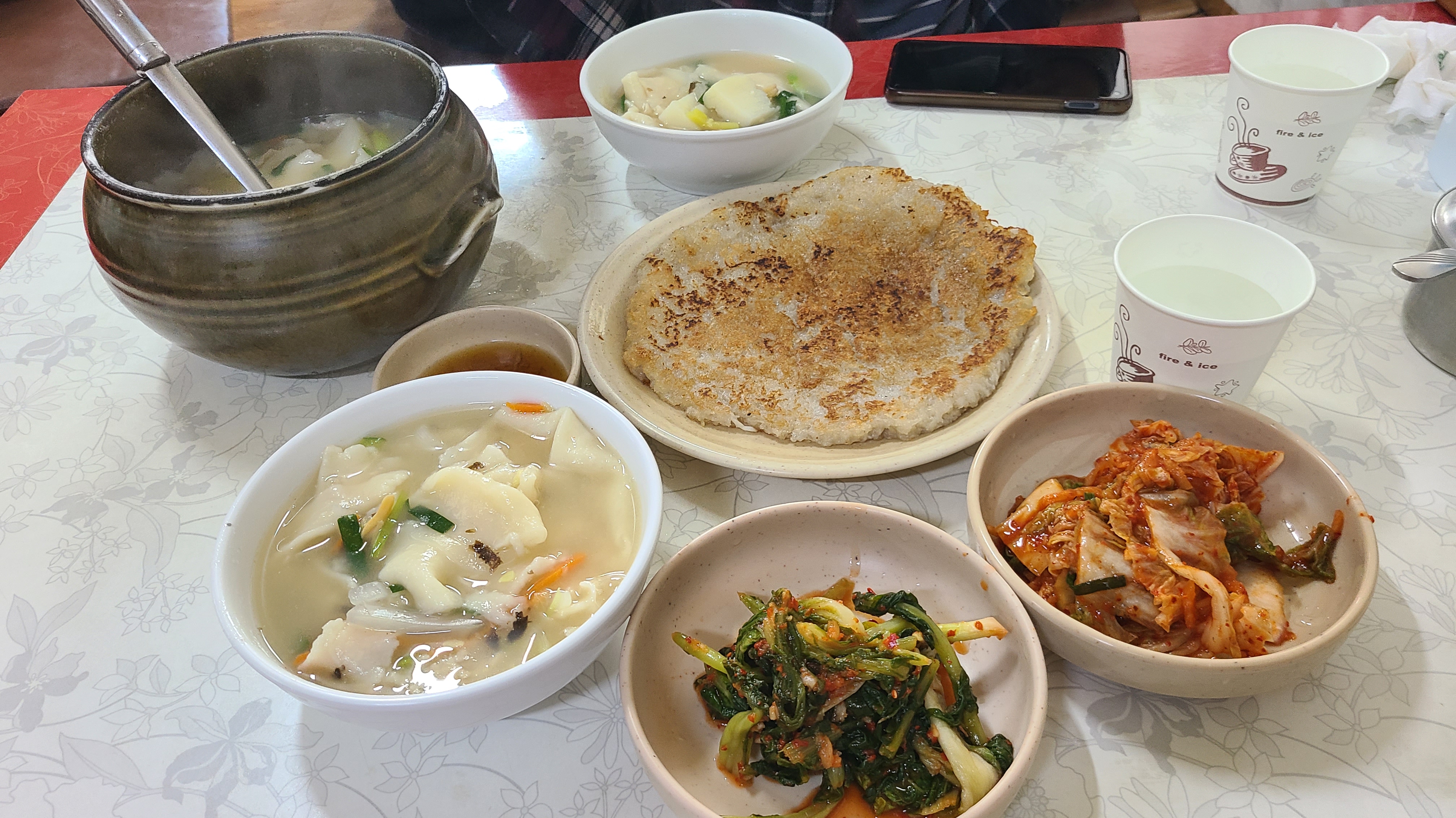 근 오십여분을 기다려 감자전과 수제비를 먹어본다.