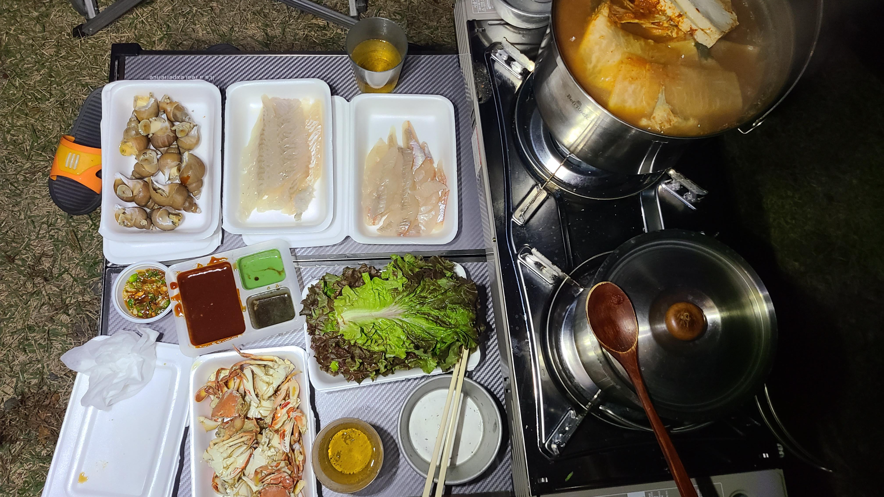 회와 고등,게등을 푸짐하게 차려놓고 매운탕까지 준비하니 더 이상 차릴 공간이 없다.