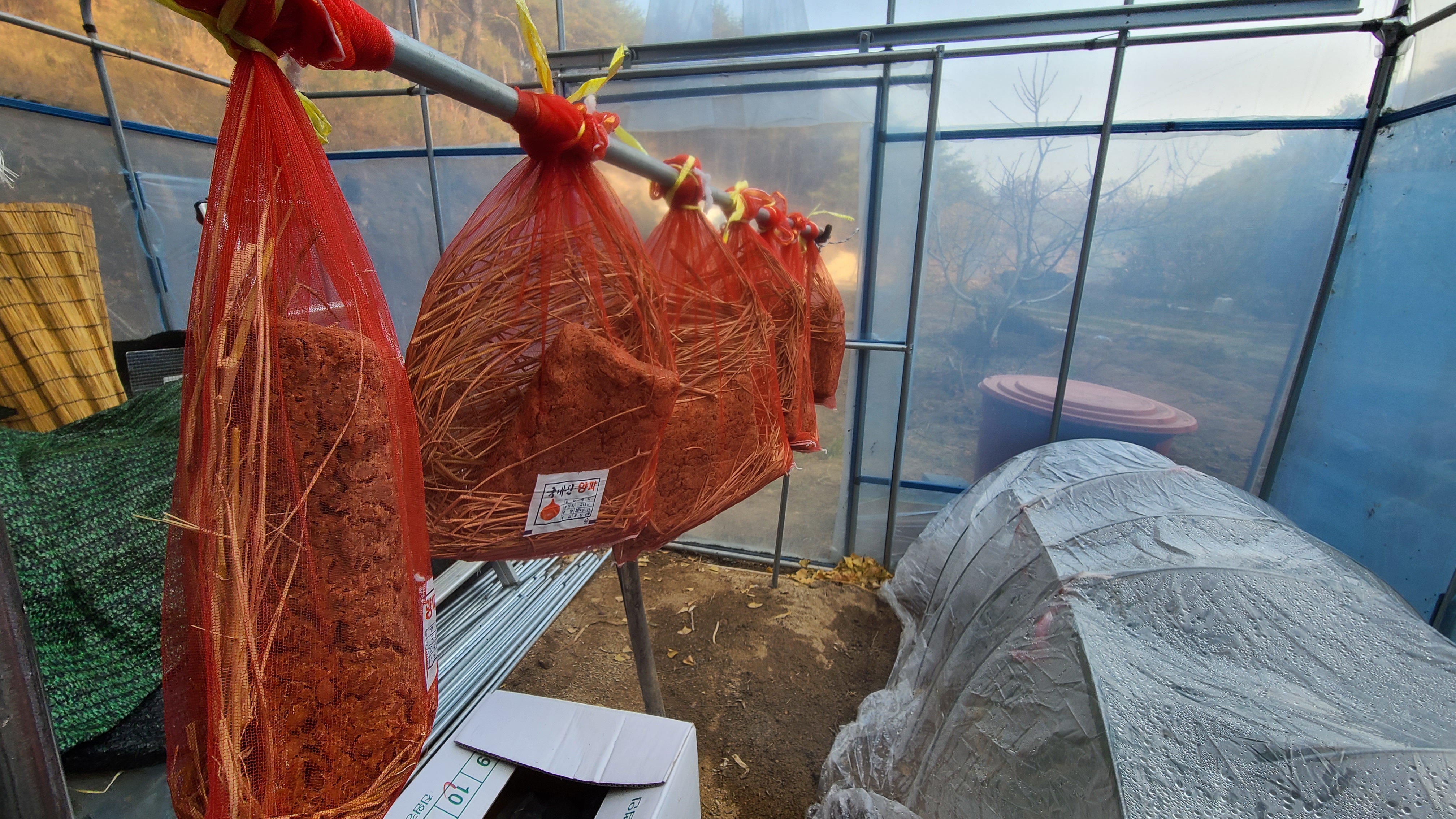 아침을 먹고는 어제 건조시킨 메주를 꺼내 볏짚을 넣은 양파망에 넣어 비닐하우스에 걸어둔다.