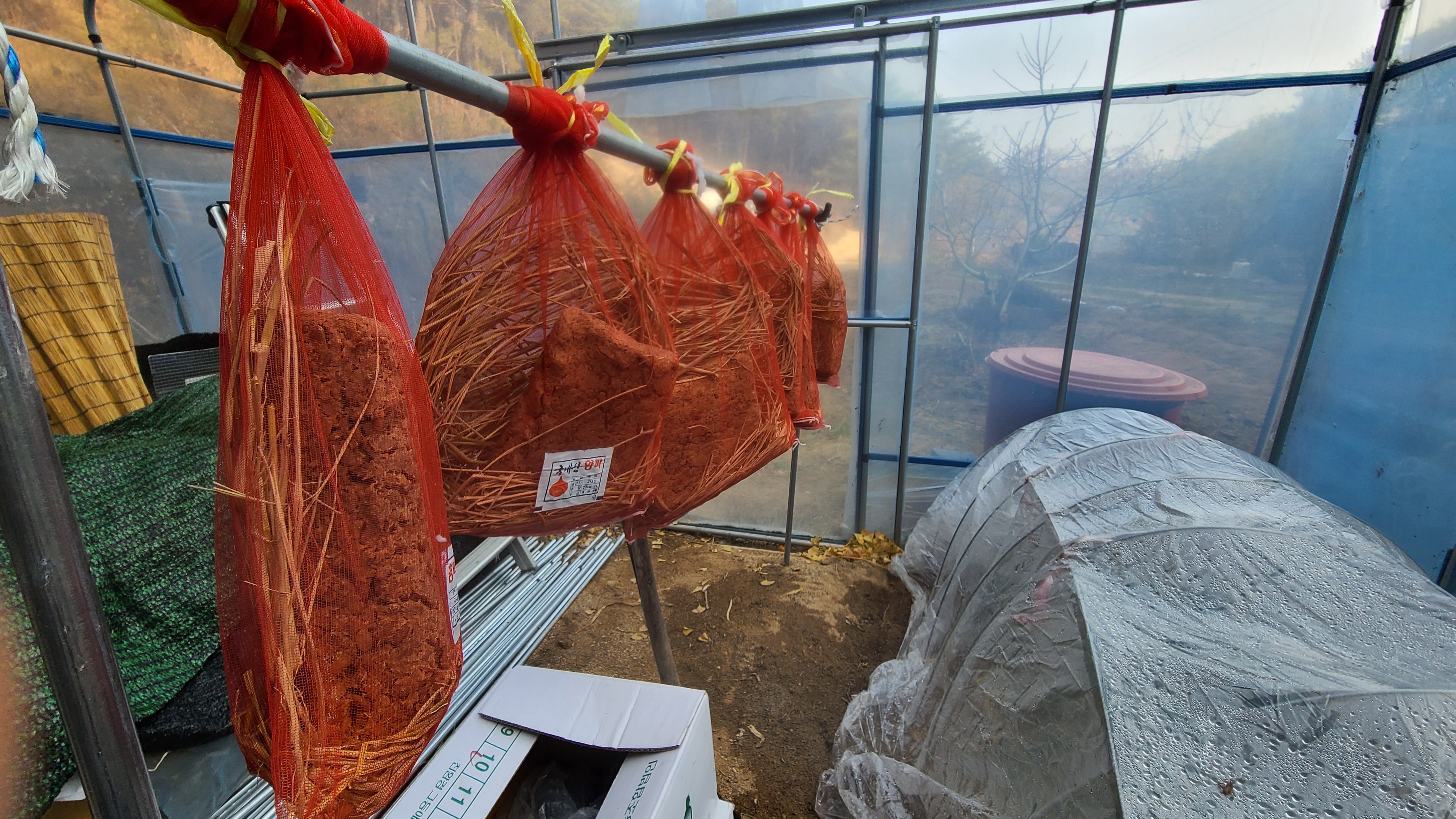 아침을 먹고는 어제 건조시킨 메주를 꺼내 볏짚을 넣은 양파망에 넣어 비닐하우스에 걸어둔다.