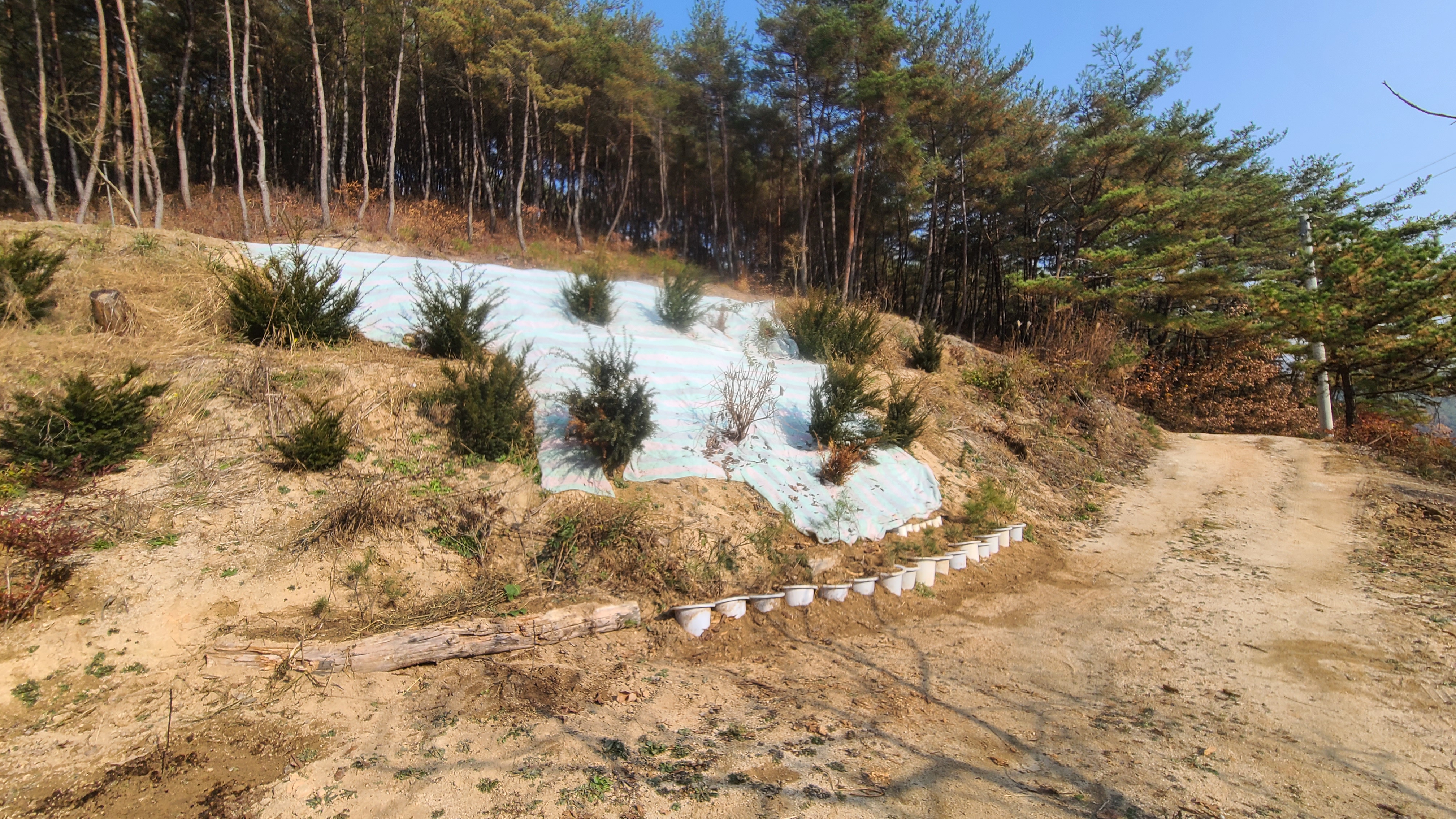 아침에 기상하여 식전에 부모님 산소주변을 소나무를 옮겨심은 화분들을 보기좋게 땅에 묻어