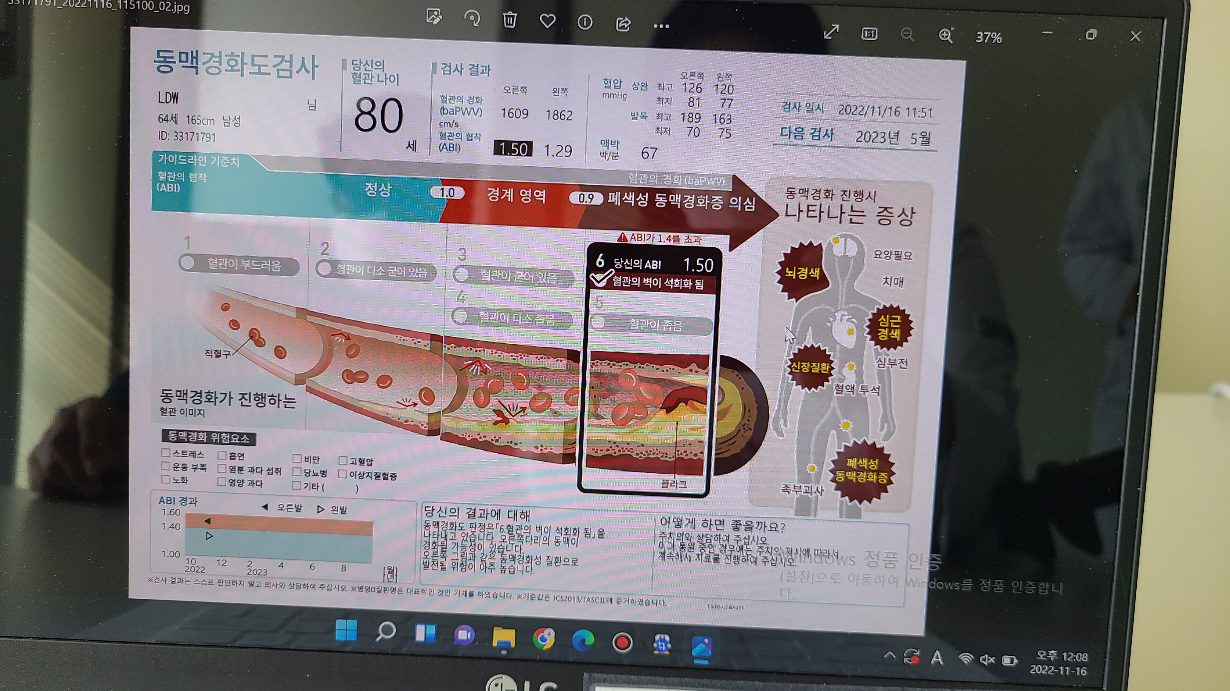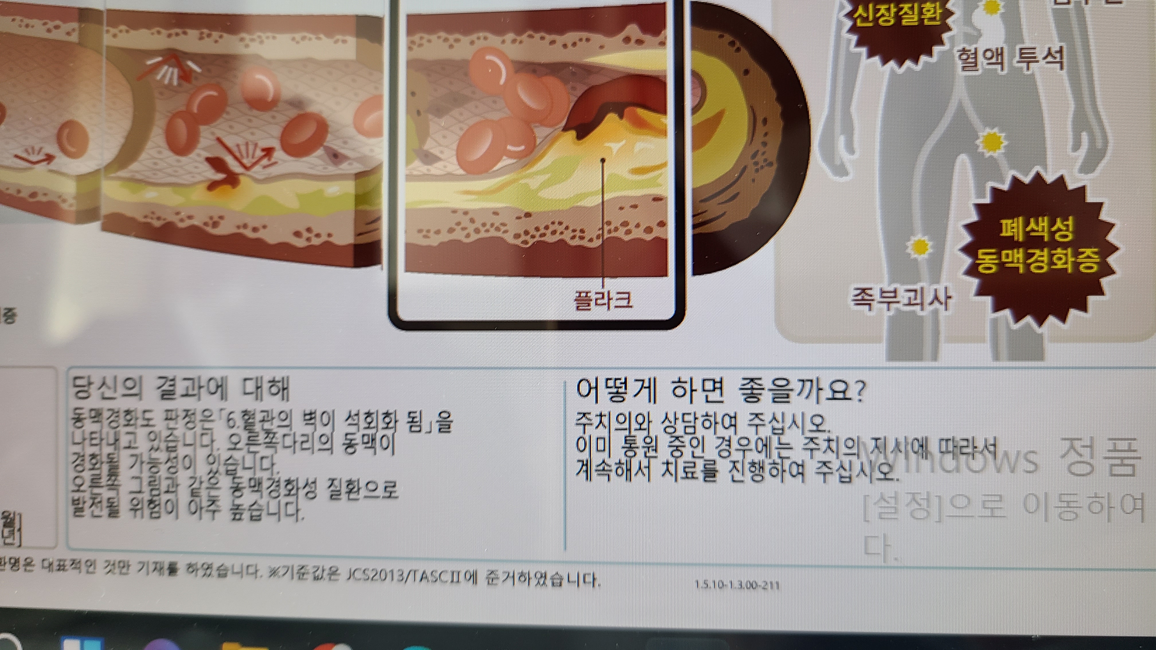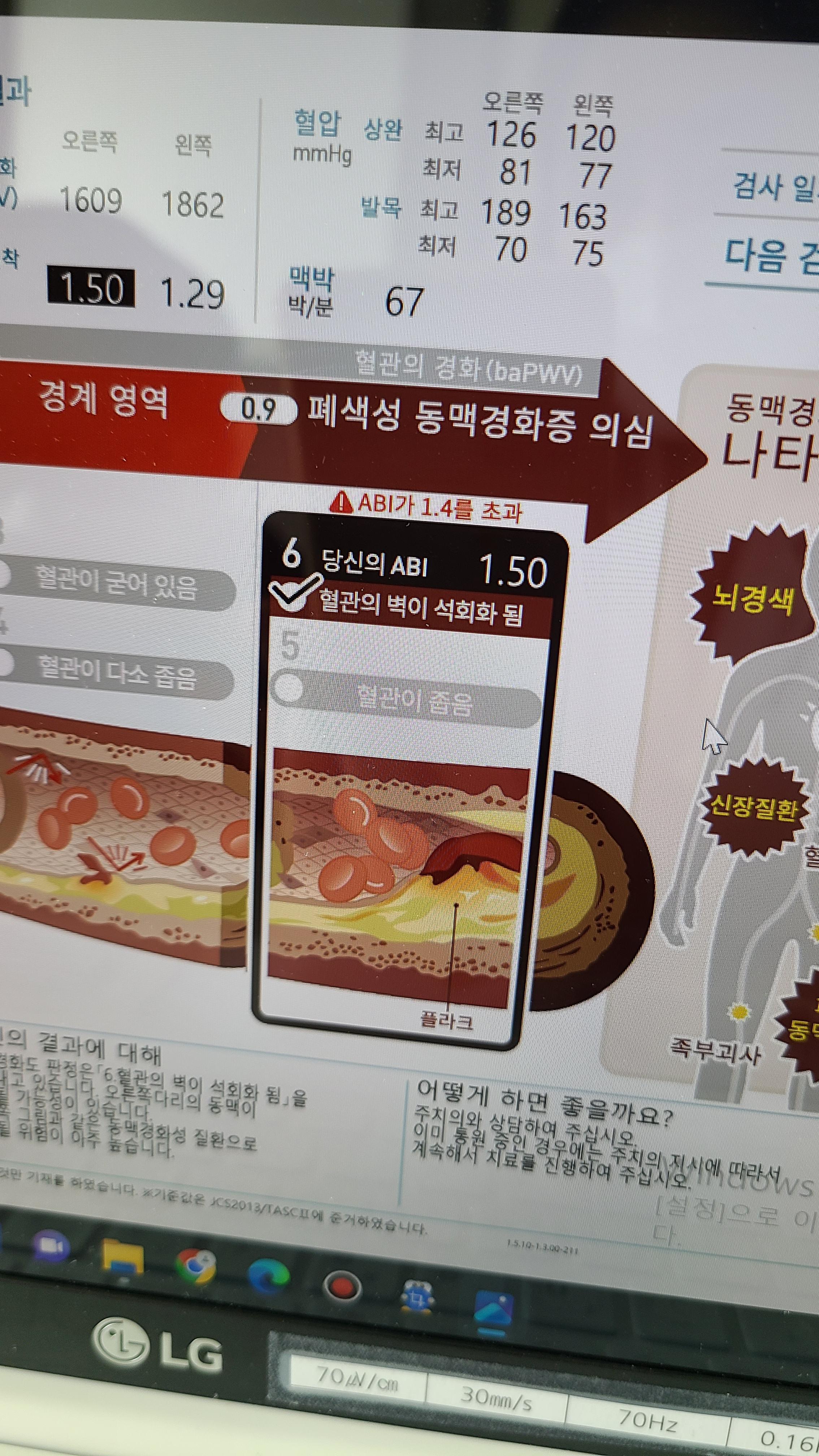 마지막으로 동맥경화검사를 하는데, 오른쪽 다리의 혈관이 경화되어 석회화 가능성이 있다는 결과가 나온다.