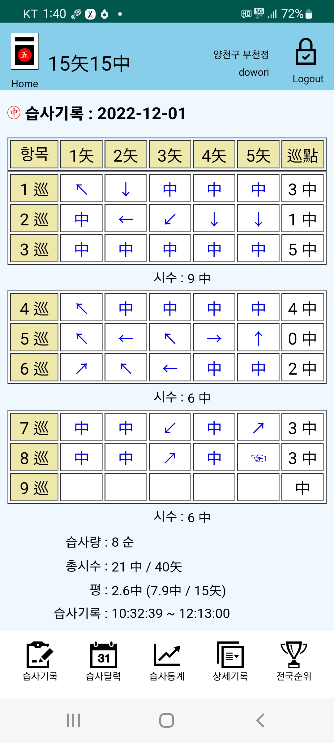 그 다음순에서는 첫발이 빠지고 4중. 오늘은 8순을 내었는데 평2.6중.