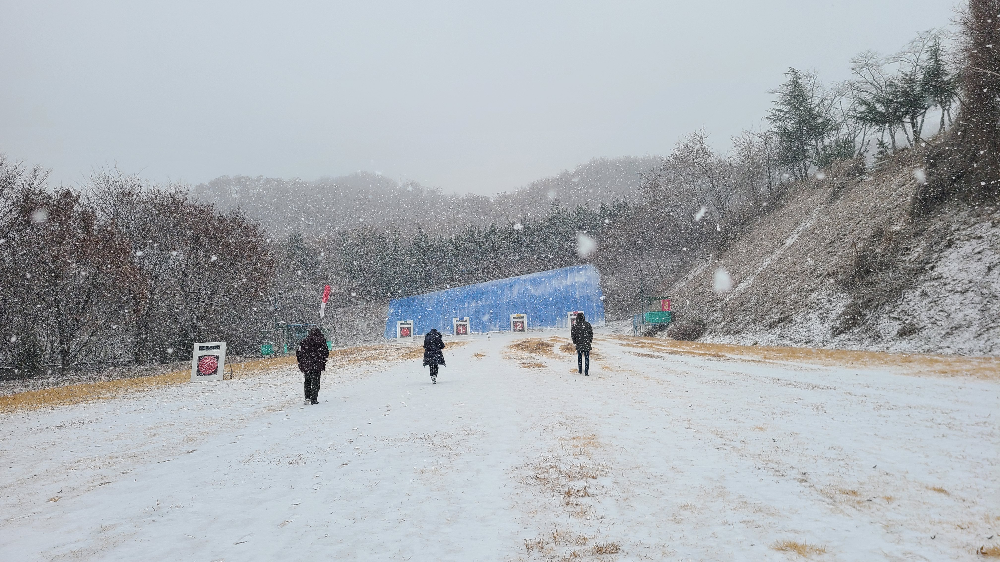 눈송이가 시야에 가득하고 과녁을 향해 날아간 화살이 보이지 않을 정도로 눈이 쌓였다.