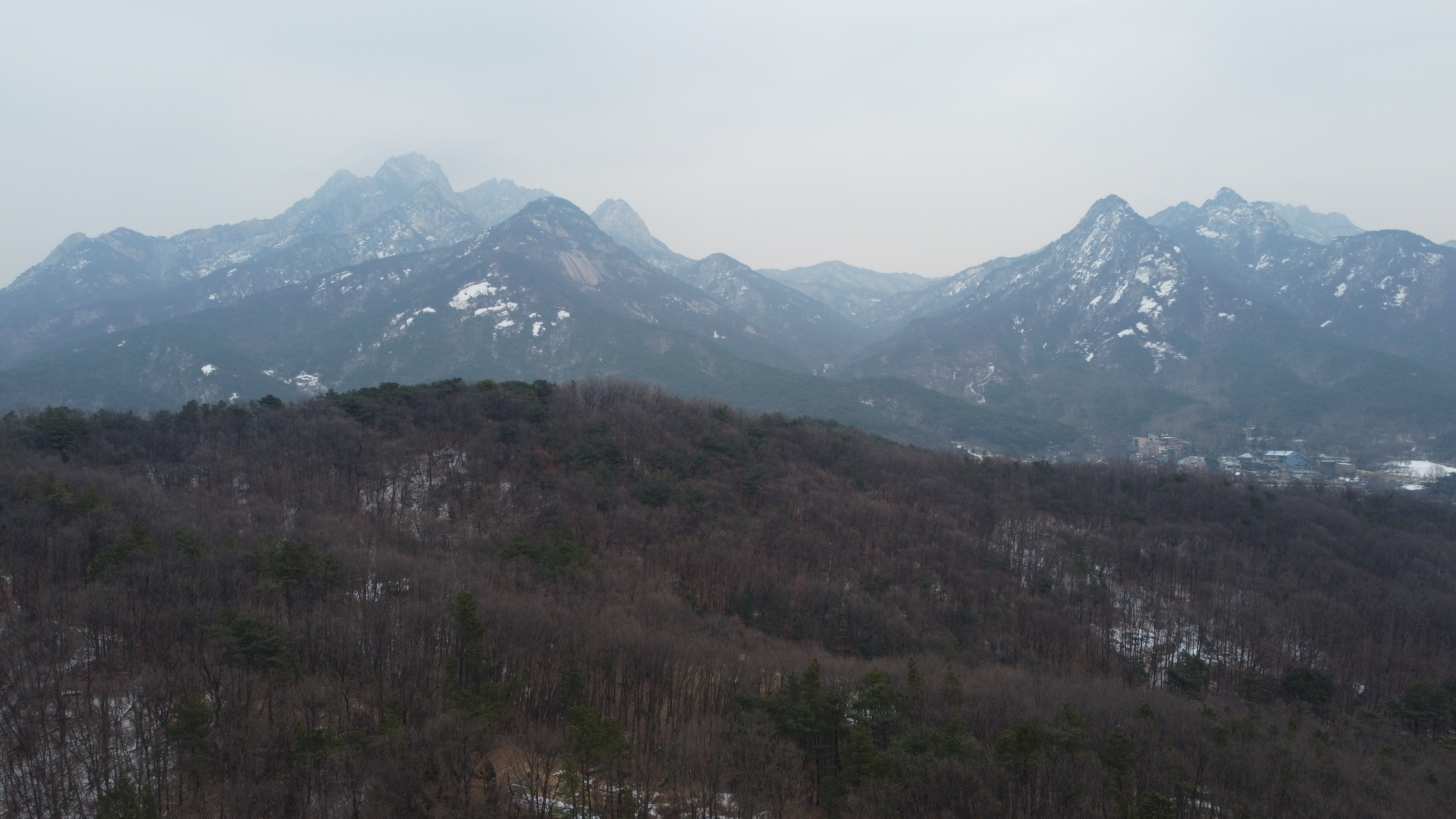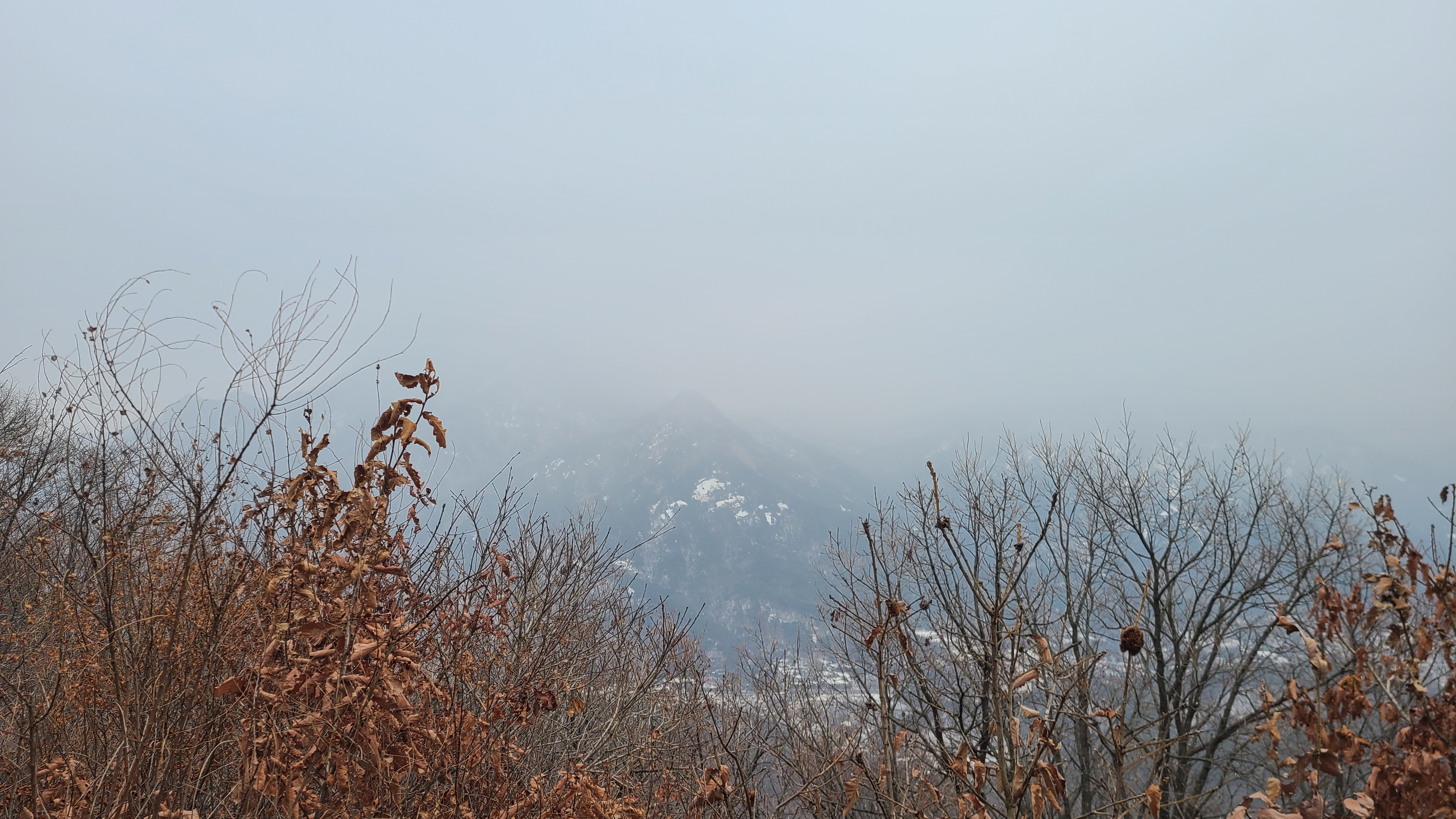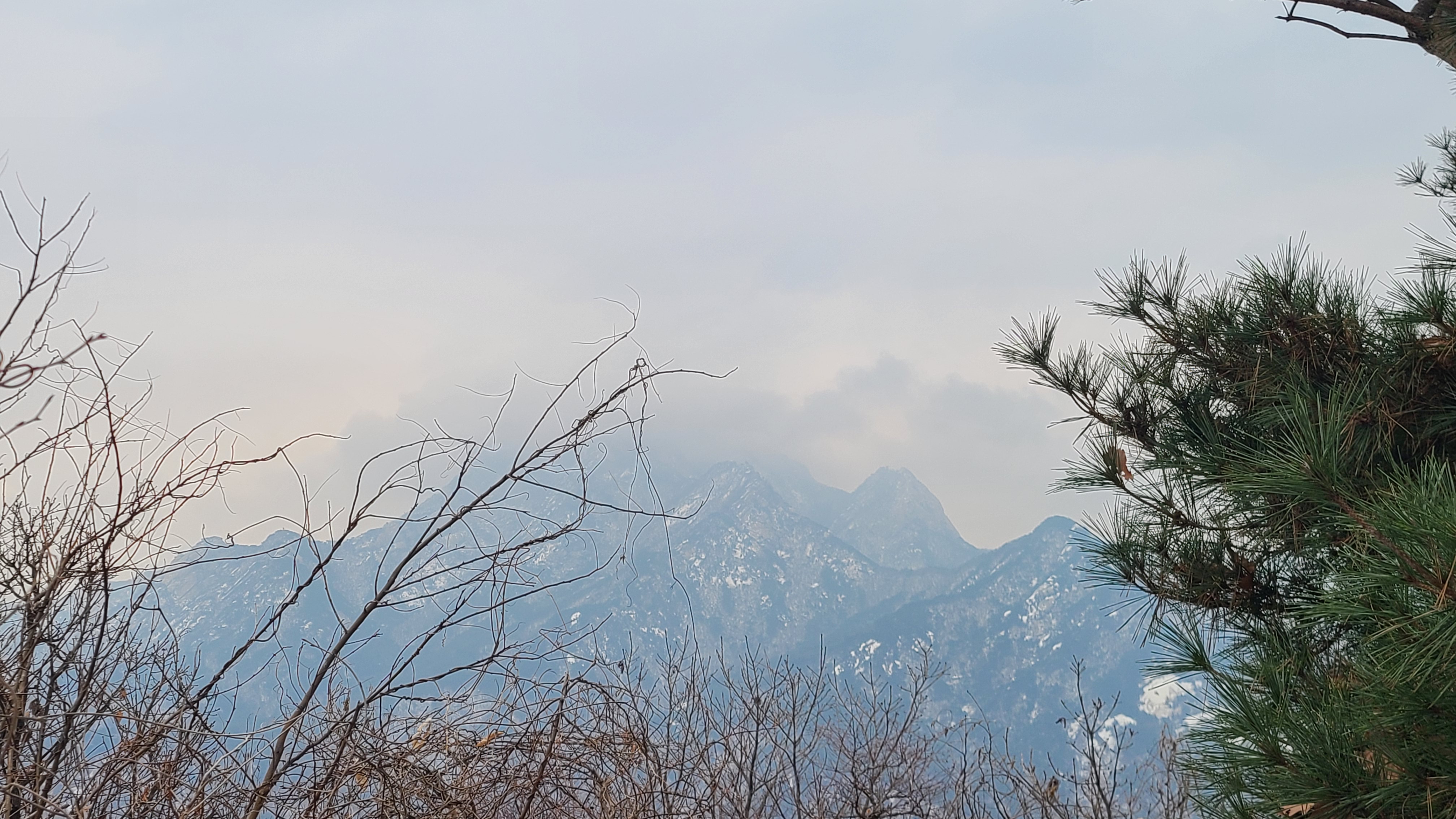 도중에 단체팀들이 두어팀 보이고 눈싸라기가 듬성듬성내리니 건너편 북한산은 안개에 쌓여 보이질 않는다.