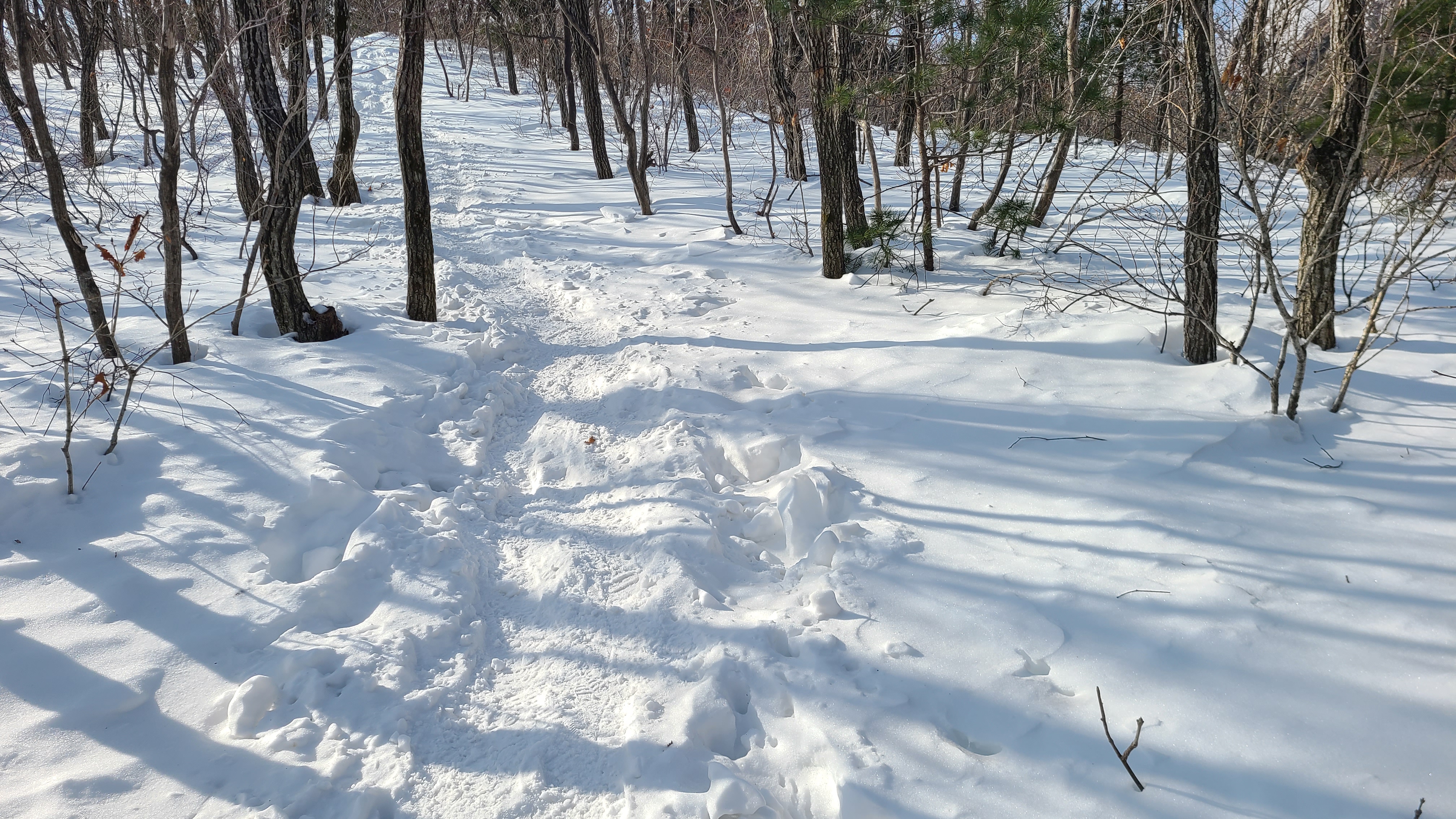 호젓한 송림숲속의 눈길을 걷는 기분은 좋지만 오르는 것이 쉽지는 않다.