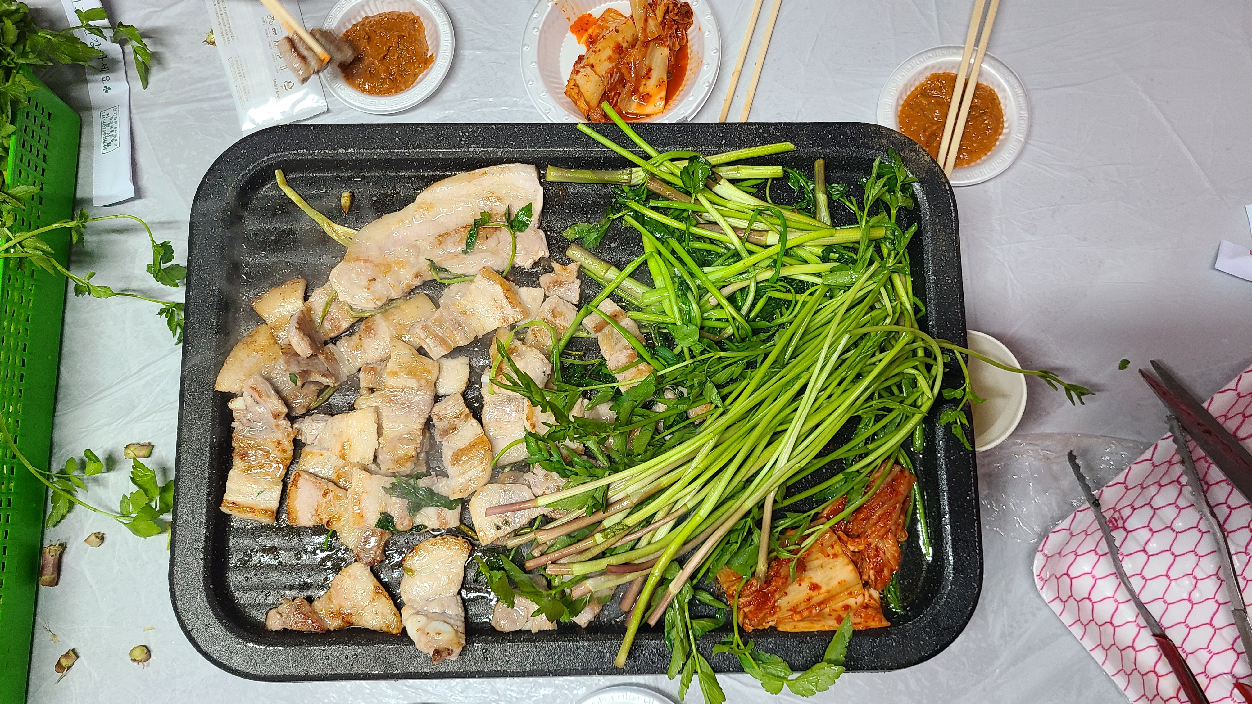 싱싱한 미나리와 삼겹살을 구워 같이 먹도록 만든 비닐하우스인데 상당히 유명하다.