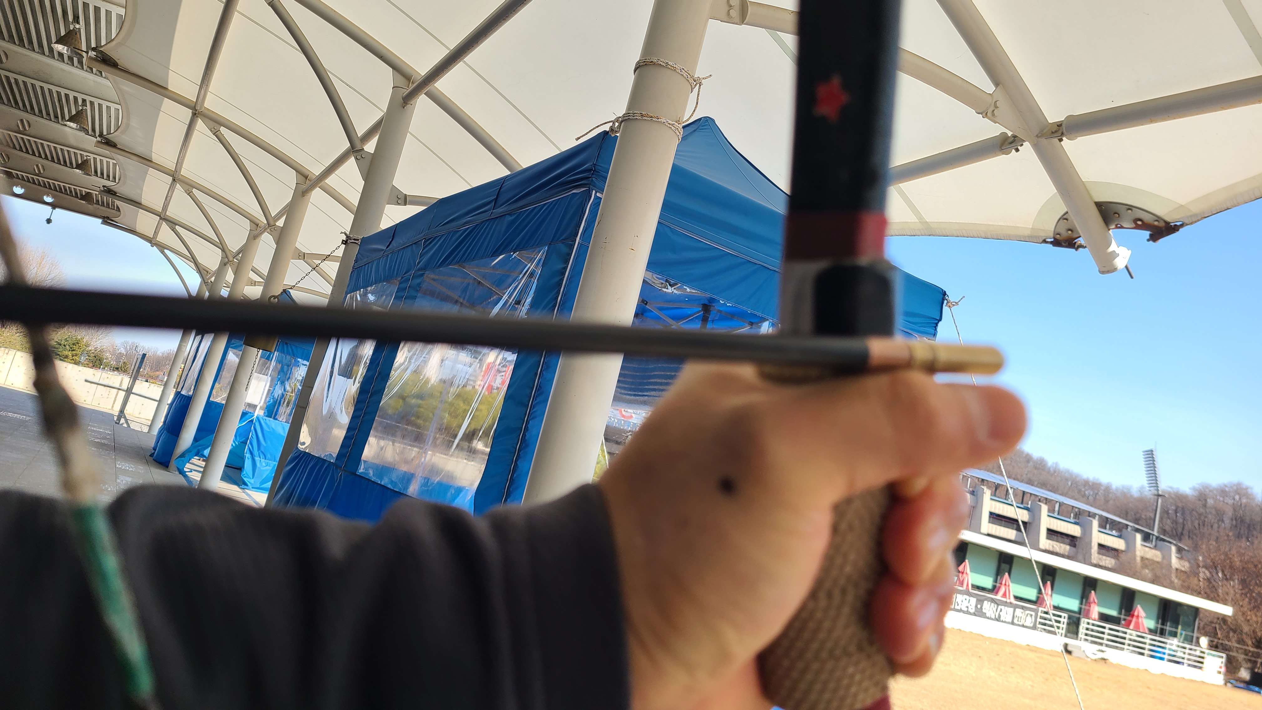 줌손과 각지손을 조이면서 지사 후 발시를 하니 과녁으로 들어간다.